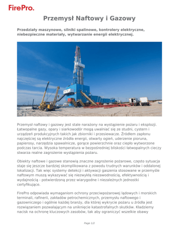 Przemysł Naftowy i Gazowy Przedziały maszynowe, silniki spalinowe, kontrolery elektryczne, niebezpieczne materiały, wytwarzanie energii elektrycznej. Przemysł naftowy i gazowy jest stale narażony na wystąpienie pożaru i eksplozji. Łatwopalne gazy, opary i siarkowodór mogą uwalniać się ze studni, cystern i urządzeń produkcyjnych takich jak zbiorniki i przesiewacze. Źródłem zapłonu najczęściej są elektryczne źródła energii, otwarty ogień, uderzenie pioruna, papierosy, narzędzia spawalnicze, gorące powierzchnie oraz ciepło wytworzone podczas tarcia. Wysoka temperatura w bezpośredniej bliskości łatwopalnych cieczy stwarza realne zagrożenie wystąpienia pożaru. Obiekty naftowe i gazowe stanowią znaczne zagrożenie pożarowe, często sytuacja staje się jeszcze bardziej skomplikowana z powodu trudnych warunków i oddalonej lokalizacji. Tak więc systemy detekcji i aktywacji gaszenia stosowane w przemyśle naftowym muszą wykazywać się niezwykłą niezawodnością, efektywnością i wydajnością - potwierdzoną przez wiarygodne i niezależnych jednostki certyfikujące. FirePro odpowiada wymaganiom ochrony przeciwpożarowej lądowych i morskich terminali, rafinerii, zakładów petrochemicznych, przemysłu naftowego i gazowniczego i ogólnie każdej branży, dla której wykrycie pożaru u źródła jest rozwiązaniem pozwalającym na uniknięcie katastrofalnych skutków. Kładziemy nacisk na ochronę kluczowych zasobów, tak aby ograniczyć wszelkie obawy Page 1/2 związane z ciągłością pracy przy jednoczesnej ochronie życia i mienia. Page 2/2