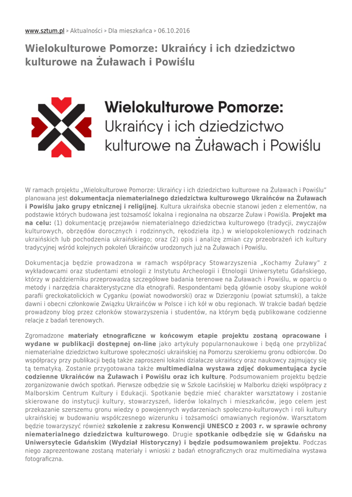 www.sztum.pl Aktualności Dla mieszkańca 06.10.2016 Wielokulturowe Pomorze: Ukraińcy i ich dziedzictwo kulturowe na Żuławach i Powiślu W ramach projektu „Wielokulturowe Pomorze: Ukraińcy i ich dziedzictwo kulturowe na Żuławach i Powiślu” planowana jest dokumentacja niematerialnego dziedzictwa kulturowego Ukraińców na Żuławach i Powiślu jako grupy etnicznej i religijnej. Kultura ukraińska obecnie stanowi jeden z elementów, na podstawie których budowana jest tożsamość lokalna i regionalna na obszarze Żuław i Powiśla. Projekt ma na celu: (1) dokumentację przejawów niematerialnego dziedzictwa kulturowego (tradycji, zwyczajów kulturowych, obrzędów dorocznych i rodzinnych, rękodzieła itp.) w wielopokoleniowych rodzinach ukraińskich lub pochodzenia ukraińskiego; oraz (2) opis i analizę zmian czy przeobrażeń ich kultury tradycyjnej wśród kolejnych pokoleń Ukraińców urodzonych już na Żuławach i Powiślu. Dokumentacja będzie prowadzona w ramach współpracy Stowarzyszenia „Kochamy Żuławy” z wykładowcami oraz studentami etnologii z Instytutu Archeologii i Etnologii Uniwersytetu Gdańskiego, którzy w październiku przeprowadzą szczegółowe badania terenowe na Żuławach i Powiślu, w oparciu o metody i narzędzia charakterystyczne dla etnografii. Respondentami będą głównie osoby skupione wokół parafii greckokatolickich w Cyganku (powiat nowodworski) oraz w Dzierzgoniu (powiat sztumski), a także dawni i obecni członkowie Związku Ukraińców w Polsce i ich kół w obu regionach. W trakcie badań będzie prowadzony blog przez członków stowarzyszenia i studentów, na którym będą publikowane codzienne relacje z badań terenowych. Zgromadzone materiały etnograficzne w końcowym etapie projektu zostaną opracowane i wydane w publikacji dostępnej on-line jako artykuły popularnonaukowe i będą one przybliżać niematerialne dziedzictwo kulturowe społeczności ukraińskiej na Pomorzu szerokiemu gronu odbiorców. Do współpracy przy publikacji będą także zaproszeni lokalni działacze ukraińscy oraz naukowcy zajmujący się tą tematyką. Zostanie przygotowana także multimedialna wystawa zdjęć dokumentująca życie codzienne Ukraińców na Żuławach i Powiślu oraz ich kulturę. Podsumowaniem projektu będzie zorganizowanie dwóch spotkań. Pierwsze odbędzie się w Szkole Łacińskiej w Malborku dzięki współpracy z Malborskim Centrum Kultury i Edukacji. Spotkanie będzie mieć charakter warsztatowy i zostanie skierowane do instytucji kultury, stowarzyszeń, liderów lokalnych i mieszkańców, jego celem jest przekazanie szerszemu gronu wiedzy o powojennych wydarzeniach społeczno-kulturowych i roli kultury ukraińskiej w budowaniu współczesnego wizerunku i tożsamości omawianych regionów. Warsztatom będzie towarzyszyć również szkolenie z zakresu Konwencji UNESCO z 2003 r. w sprawie ochrony niematerialnego dziedzictwa kulturowego. Drugie spotkanie odbędzie się w Gdańsku na Uniwersytecie Gdańskim (Wydział Historyczny) i będzie podsumowaniem projektu. Podczas niego zaprezentowane zostaną materiały i wnioski z badań etnograficznych oraz multimedialna wystawa fotograficzna. Więcej informacji na blogu: www.wielokulturowepomorze.wordpress.com Projekt dofinansowany ze środków Województwa Pomorskiego w ramach programu: Rozwój Kultury w Województwie Pomorskim w Roku 2016.