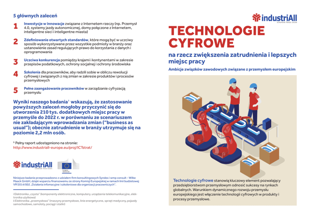 5 głównych zaleceń 1 Inwestycje w innowacje związane z Internetem rzeczy (np. Przemysł 4.0, systemy jazdy autonomicznej, domy połączone z Internetem, inteligentne sieci i inteligentne miasta) 2 Zdefiniowanie otwartych standardów, które mogą być w uczciwy sposób wykorzystywane przez wszystkie podmioty w branży oraz ustanowienie zasad regulujących prawo do korzystania z danych i oprogramowania 3 4 Uczciwa konkurencja pomiędzy krajami i kontynentami w zakresie przepisów podatkowych, ochrony socjalnej i ochrony środowiska 5 Pełne zaangażowanie pracowników w zarządzanie cyfryzacją przemysłu Szkolenia dla pracowników, aby radzili sobie w obliczu rewolucji cyfrowej i związanych z nią zmian w zakresie produktów i procesów przemysłowych TECHNOLOGIE CYFROWE na rzecz zwiększenia zatrudnienia i lepszych miejsc pracy Ambicje związków zawodowych związane z przemysłem europejskim Wyniki naszego badania 1 wskazują, że zastosowanie powyższych zaleceń mogłoby przyczynić się do utworzenia 210 tys. dodatkowych miejsc pracy w przemyśle do 2022 r. w porównaniu ze scenariuszem nie zakładającym wprowadzania zmian (“business as usual”); obecnie zatrudnienie w branży utrzymuje się na poziomie 2,2 mln osób. Pełny raport udostępniono na stronie: http://www.industriall-europe.eu/proj/ICTstrat/ 1 Niniejsze badanie przeprowadzono z udziałem firm konsultingowych Syndex i wmp consult - Wilke Maack GmbH, dzięki wsparciu finansowemu ze strony Komisji Europejskiej w ramach linii budżetowej VP/2014/002 „Działania infomacyjne i szkoleniowe dla organizacji pracowniczych”. i Elektronika „czysta” (komponenty elektroniczne, komputery, urządzenia telekomunikacyjne, elektronika użytkowa) ii Elektronika „przemysłowa” (maszyny przemysłowe, linie energetyczne, sprzęt medyczny, pojazdy samochodowe, samoloty, pociągi i statki) Technologie cyfrowe stanowią kluczowy element pozwalający przedsiębiorstwom przemysłowym odnosić sukcesy na rynkach globalnych. Warunkiem dynamicznego rozwoju przemysłu europejskiego jest włączenie technologii cyfrowych w produkty i procesy przemysłowe. Dane dotyczące zatrudnienia w sekorze ICT w Europie (2008-2013) % +19 lige Inte +6% +6% Zatrudnienie w europejskim sektorze ICT produkcja sprzętu 0.4 mln tworzenie oprogramowania eci si tne n +8% -3% 2.2 mln KA OWA Y IT YSŁ L POZEM PR 10% 0% Średni spadek o 30% 20% Źródło: Eurostat Obliczenia industriAll Europe, Syndex, wmp consult Strategia związków zawodowych w odpowiedzi na wyzwania związane z technologiami cyfrowymi +3% % -12 a nik ktro wa sta Elechodo czy o ika n m o a s ktr Ele % % -20 % -25 0% % -10 -30 Analiza SWOT europejskiego przemysłu technologii cyfrowych MOCNE STRONY Umiejętności siły roboczej Solidna infrastruktura Kilka silnych podsektorów CZYSTEJ elektroniki (sprzęt telekomunikacyjny, karty inteligentne, złącza, kable) Silne branże przemysłowe z rosnącym udziałem elektronicznych systemów wbudowanych (inżynieria mechaniczna, automatyka przemysłowa, motoryzacja, przemysł lotniczy, kolejowy, urządzenia medyczne, elektrotechnika) SZANSE Nowe trendy technologiczne (Internet rzeczy, Przemysł 4.0, systemy jazdy autonomicznej, dom połączony z Internetem, inteligentne sieci, inteligentne miasta) Berlin, Londyn, Paryż, Sztokholm: nowe centra innowacji musi wykorzystać możliwości, jakie oferuje Internet rzeczy w kilku obszarach stanowiących „lokomotywy” rozwoju, i w których przemysł europejski zachował silną pozycję: sieci energetyczne, systemy transportowe, technologie produkcji przemysłowej, obronność i bezpieczeństwo. Europejskie sektory przemysłowe, dostawcy i użytkownicy technologii cyfrowych mogą wspierać się nawzajem w całym łańcuchu wartości. SŁABE STRONY Nieliczni europejscy liderzy w branży lub ich brak Brak europejskich zakładów produkujących komputery, urządzenia telekomunikacyjne, elektronikę użytkową Brak silnego, europejskiego lidera w branży telefonów komórkowych, komputerów, elektroniki użytkowej Niski poziom wsparcia publicznego dla segmentów o strategicznym znaczeniu (komponenty elektroniczne) w porównaniu z USA / Azją Przepaść cyfrowa pomiędzy regionami UE ZAGROŻENIA Konkurencja ze strony USA i Azji Potężne przedsiębiorstwa europejskie są przejmowane przez konkurencję spoza Europy, a pozostałe są zagrożone Amerykańscy giganci cyfrowi (Google, Apple, Facebook) zaczynają rozwijać swoją działalność w brażny przemysłowej KI E J Y IT C ZN L POOŁE SP Zalecenia w zakresie POLITYKI SPOŁECZNEJ służą poprawie warunków pracy w sektorze ICT oraz w sektorach pozostających pod wpływem transformacji cyfrowej. Obejmują one prawo do zdobywania i rozwijania umiejętności, bezpieczeństwo i ochronę zdrowia w miejscu pracy, równość na rynku pracy przekształconym na skutek transformacji cyfrowej, a także prawa pracowników w cyfrowym miejscu pracy: prawo do odłączenia się i do prywatności.