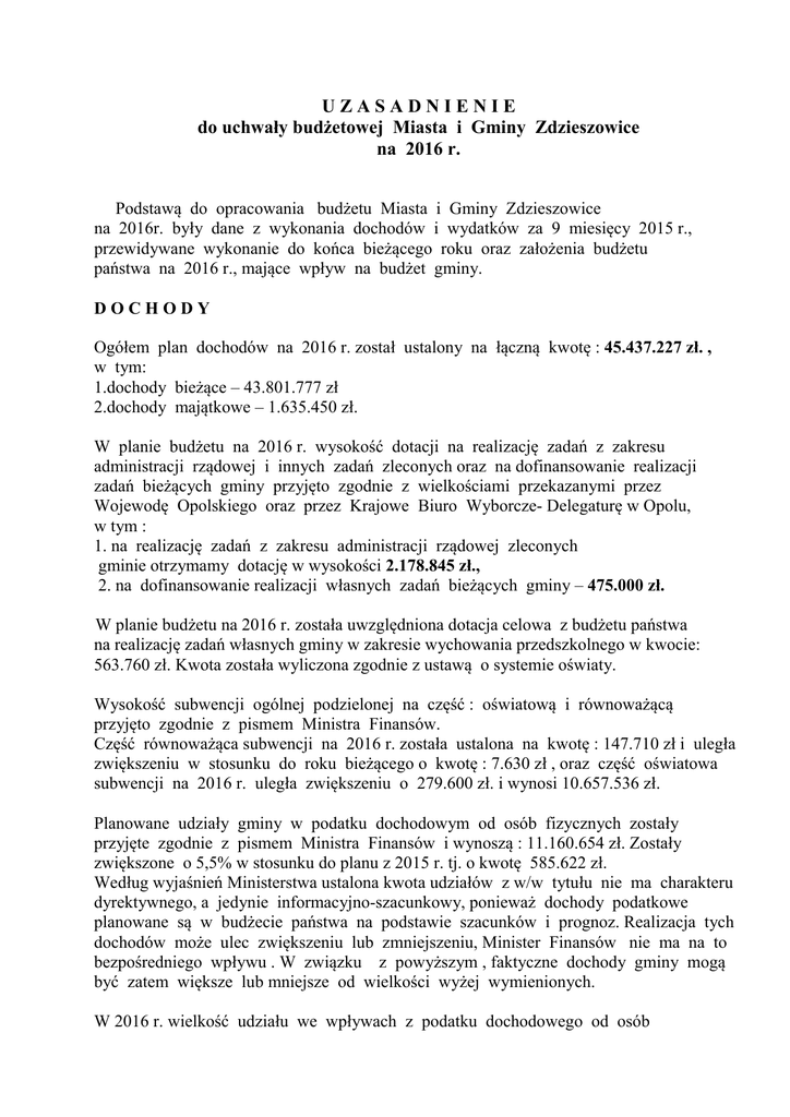 UZASADNIENIE do uchwały budżetowej Miasta i Gminy Zdzieszowice na 2016 r. Podstawą do opracowania budżetu Miasta i Gminy Zdzieszowice na 2016r. były dane z wykonania dochodów i wydatków za 9 miesięcy 2015 r., przewidywane wykonanie do końca bieżącego roku oraz założenia budżetu państwa na 2016 r., mające wpływ na budżet gminy. DOCHODY Ogółem plan dochodów na 2016 r. został ustalony na łączną kwotę : 45.437.227 zł. , w tym: 1.dochody bieżące – 43.801.777 zł 2.dochody majątkowe – 1.635.450 zł. W planie budżetu na 2016 r. wysokość dotacji na realizację zadań z zakresu administracji rządowej i innych zadań zleconych oraz na dofinansowanie realizacji zadań bieżących gminy przyjęto zgodnie z wielkościami przekazanymi przez Wojewodę Opolskiego oraz przez Krajowe Biuro Wyborcze- Delegaturę w Opolu, w tym : 1. na realizację zadań z zakresu administracji rządowej zleconych gminie otrzymamy dotację w wysokości 2.178.845 zł., 2. na dofinansowanie realizacji własnych zadań bieżących gminy – 475.000 zł. W planie budżetu na 2016 r. została uwzględniona dotacja celowa z budżetu państwa na realizację zadań własnych gminy w zakresie wychowania przedszkolnego w kwocie: 563.760 zł. Kwota została wyliczona zgodnie z ustawą o systemie oświaty. Wysokość subwencji ogólnej podzielonej na część : oświatową i równoważącą przyjęto zgodnie z pismem Ministra Finansów. Część równoważąca subwencji na 2016 r. została ustalona na kwotę : 147.710 zł i uległa zwiększeniu w stosunku do roku bieżącego o kwotę : 7.630 zł , oraz część oświatowa subwencji na 2016 r. uległa zwiększeniu o 279.600 zł. i wynosi 10.657.536 zł. Planowane udziały gminy w podatku dochodowym od osób fizycznych zostały przyjęte zgodnie z pismem Ministra Finansów i wynoszą : 11.160.654 zł. Zostały zwiększone o 5,5% w stosunku do planu z 2015 r. tj. o kwotę 585.622 zł. Według wyjaśnień Ministerstwa ustalona kwota udziałów z w/w tytułu nie ma charakteru dyrektywnego, a jedynie informacyjno-szacunkowy, ponieważ dochody podatkowe planowane są w budżecie państwa na podstawie szacunków i prognoz. Realizacja tych dochodów może ulec zwiększeniu lub zmniejszeniu, Minister Finansów nie ma na to bezpośredniego wpływu . W związku z powyższym , faktyczne dochody gminy mogą być zatem większe lub mniejsze od wielkości wyżej wymienionych. W 2016 r. wielkość udziału we wpływach z podatku dochodowego od osób 2 fizycznych, ustalona została zgodnie z art.4 ust.2, z zastrzeżeniem art.89, ustawy o dochodach jednostek samorządu terytorialnego i wynosić będzie 37,79 %. Plan budżetu na 2016 r. został opracowany zgodnie z Rozporządzeniem Ministra Finansów z dnia 2 marca 2010 r. w sprawie szczegółowej klasyfikacji dochodów , wydatków , przychodów i rozchodów oraz środków pochodzących ze źródeł zagranicznych –Dz.U. z 2014 r. poz.1053 z póź. zm. Powyższy plan został opracowany po stronie dochodów według pełnej szczegółowości klasyfikacji budżetowej z podziałem na dochody bieżące i dochody majątkowe , natomiast po stronie wydatków według pełnej szczegółowości klasyfikacji budżetowej z wyodrębnieniem: 1.wydatków bieżących, z uwzględnieniem szczegółowości z art.236 ust.3 ustawy o finansach publicznych z wyszczególnieniem między innymi ważniejszych zadań gospodarczych, 2.wydatków majątkowych, z uwzględnieniem szczegółowości z art.236 ust.4 ustawy o finansach publicznych z wyszczególnieniem nazw inwestycji. Plan budżetu na 2016 r. został uchwalony w następujących kwotach : plan dochodów - 45.437.227,00 zł plan przychodów - 3.722.300,00 zł plan wydatków - 49.159.527,00 zł - powstały deficyt w kwocie 3.722.300,00 zł zostanie sfinansowany z nadwyżki budżetu z lat ubiegłych. Wzrost poszczególnych grup dochodów jest następujący : 1.wpływy z tytułu dzierżawy składników majątkowych , z tytułu przekształcenia prawa wieczystego użytkowania w prawo własności, wpływy z opłaty za użytkowanie wieczyste nieruchomości oraz ze sprzedaży mienia komunalnego przyjęto na podstawie planu sporządzonego przez Referat Gospodarki Nieruchomościami ,Rolnictwa i Leśnictwa. Szczegółowy wykaz planowanych do sprzedaży w 2016 r. nieruchomości przedstawia materiał informacyjny do planu budżetu na 2016 r. 2.dochody z tytułu wyżywienia , opłat stałych przyjęto na podstawie planów sporządzonych przez dyrektorów przedszkoli i żłobka. 3.dochody z tytułu opłat za wydawanie zezwoleń na sprzedaż napojów alkoholowych przyjęto na podstawie wyliczenia sporządzonego przez pracownika Referatu Gospodarki Komunalnej i Ochrony Środowiska , zajmującego się w \ w sprawami. Plan na 2016 r. jest niższy od planu w 2015 r..Został ustalony w oparciu o wpływy na 30.09.2015 r., dodając przewidywane wpływy w 2015 r., następnie odejmując wpływy za zezwolenia, z których przedsiębiorcy zrezygnowali w 2015 r. oraz dodając kwoty za 3 korzystanie z zezwoleń za pełny rok kalendarzowy dla punktów sprzedaży nowopowstałych w 2015 r. 4. dochody na 2016 r w stosunku do przewidywanego wykonania roku 2015 z tytułu podatku od nieruchomości od osób prawnych zaplanowano wyższe o 0,39 % (od kwoty naliczonego podatku na 2016 r. została odjęta kwota podatku , którą Gmina płaciła sama sobie tj. 200.000 zł ) natomiast od osób fizycznych o 4 %. Stawki podatkowe wzrosły od 0 % do 5,88%, średnio o 4%. Do obliczenia planowanych dochodów na 2016 r. przyjęto podstawy opodatkowania wg stanu na dzień 30.09.2015 r. oraz stawki podatkowe przyjęte na przyszły rok. 5.Do obliczenia planowanych dochodów na 2016 r. z tytułu podatku od środków transportowych przyjęto podstawy opodatkowania wg stanu na dzień 30.09.2015 r. oraz przyjęte stawki podatkowe na przyszły rok – zakładając wzrost o 12 zł dla każdej stawki względem stawek obowiązujących w roku bieżą
