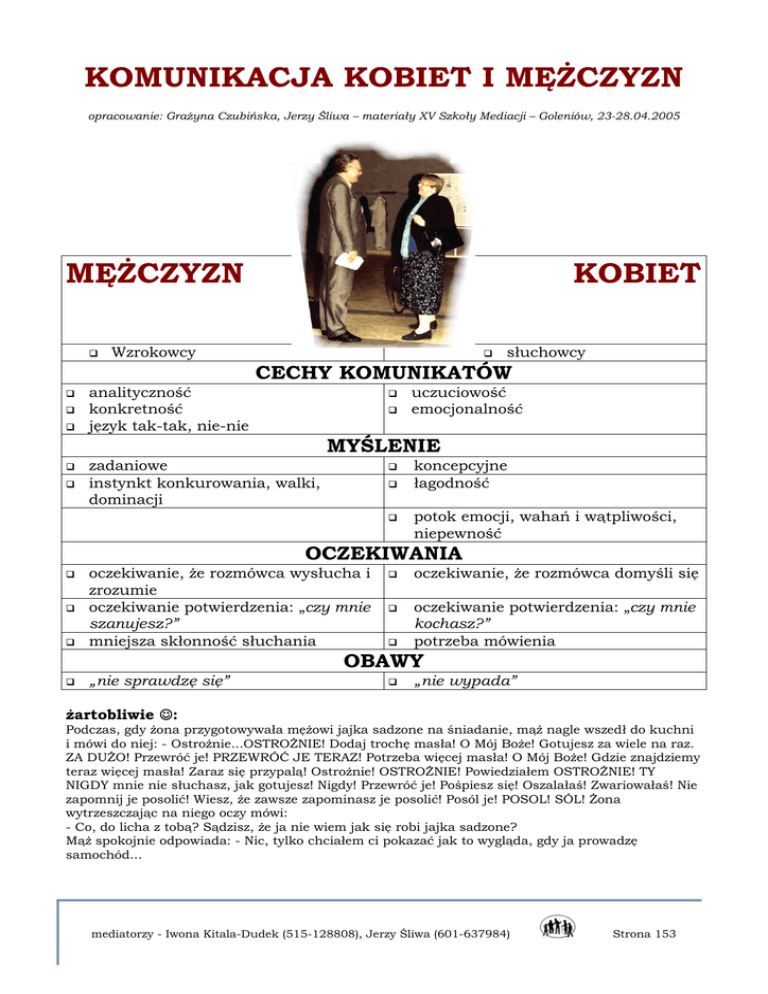 KOMUNIKACJA KOBIET I MĘŻCZYZN opracowanie: Grażyna Czubińska, Jerzy Śliwa – materiały XV Szkoły Mediacji – Goleniów, 23-28.04.2005 MĘŻCZYZN KOBIET Wzrokowcy słuchowcy CECHY KOMUNIKATÓW analityczność konkretność język tak-tak, nie-nie uczuciowość emocjonalność MYŚLENIE zadaniowe instynkt konkurowania, walki, dominacji koncepcyjne łagodność potok emocji, wahań i wątpliwości, niepewność OCZEKIWANIA oczekiwanie, że rozmówca wysłucha i zrozumie oczekiwanie potwierdzenia: „czy mnie szanujesz?” mniejsza skłonność słuchania oczekiwanie, że rozmówca domyśli się oczekiwanie potwierdzenia: „czy mnie kochasz?” potrzeba mówienia OBAWY „nie sprawdzę się” „nie wypada” żartobliwie ☺: Podczas, gdy żona przygotowywała mężowi jajka sadzone na śniadanie, mąż nagle wszedł do kuchni i mówi do niej: - Ostrożnie...OSTROŻNIE! Dodaj trochę masła! O Mój Boże! Gotujesz za wiele na raz. ZA DUŻO! Przewróć je! PRZEWRÓĆ JE TERAZ! Potrzeba więcej masła! O Mój Boże! Gdzie znajdziemy teraz więcej masła! Zaraz się przypalą! Ostrożnie! OSTROŻNIE! Powiedziałem OSTROŻNIE! TY NIGDY mnie nie słuchasz, jak gotujesz! Nigdy! Przewróć je! Pośpiesz się! Oszalałaś! Zwariowałaś! Nie zapomnij je posolić! Wiesz, że zawsze zapominasz je posolić! Posól je! POSOL! SÓL! Żona wytrzeszczając na niego oczy mówi: - Co, do licha z tobą? Sądzisz, że ja nie wiem jak się robi jajka sadzone? Mąż spokojnie odpowiada: - Nic, tylko chciałem ci pokazać jak to wygląda, gdy ja prowadzę samochód... mediatorzy - Iwona Kitala-Dudek (515-128808), Jerzy Śliwa (601-637984) Strona 153