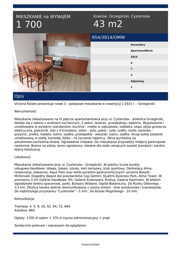 Kraków, Grzegórzki, Cystersów MIESZKANIE na WYNAJEM 43 m2 1 700 654/3814/OMW Secondary ApartmentBlock 2015 4 7 3 Adjoining 1 Opis Victoria Estate prezentuje nowe 3 - pokojowe mieszkanie w inwestycji z 2015 r. - Grzegórzki. Nieruchomość: Mieszkanie zlokalizowane na IV piętrze apartamentowca przy ul. Cystersów - dzielnica Grzegórzki. Składa się z salonu z aneksem kuchennym, 2 pokoi, łazienki, przedpokoju, balkonu. Wyposażone i umeblowane w wysokim standardzie: kuchnia - meble w zabudowie, lodówka, okap, płyta grzewcza elektryczna, piekarnik, stół z 4 krzesłami; salon - sofa; pokój - sofa, szafki, stolik; łazienka prysznic, pralka, toaleta, lustro, szafka; przedpokój - wieszak, lustro, szafka. Drugi pokój zostanie umeblowany w szafę, komodę, łóżko - na życzenie najemcy. Okna wychodzą na południowo-zachodnią stronę. Ogrzewanie miejskie. Do mieszkania przynależy miejsce parkingowe naziemne. Brama na pilota, teren ogrodzony. Idealne dla osób ceniących wysoki standard i bardzo dobrą lokalizację. Lokalizacji: Mieszkanie zlokalizowane przy ul. Cystersów - Grzegórzki. W pobliżu liczne punkty usługowo-handlowe: sklepy, basen, szkoły, kort tenisowy, klub sportowy, Delikatesy Alma, restauracje, piekarnia, Aqua Park oraz wiele punktów gastronomicznych: pizzeria Banolli, McDonald. Dogodny dojazd dla pracowników Cap Gemini, Quattro Business Park, Alma Tower. W promieniu 3 km Galerie Handlowe: M1, Galeria Krakowska, Krokus, Galeria Kazimierz. W bliskim sąsiedztwie tereny spacerowe, parki, Bulwary Wiślane, Ogród Botaniczny. Do Rynku Głównego 3,5 km. Okolica bardzo dobrze skomunikowana z resztą miasta - linie autobusowe i tramwajowe. Do najbliższego przystanku "Cystersów" - 5 min., do Ronda Mogilskiego - 10 min. Komunikacja: Tramwaj: 4, 5, 9, 10, 52, 64, 72, 664 Autobus: 664 Opłaty: 1700 zł najem + 370 zł czynsz administracyjny + prąd Serdecznie polecam i zapraszam do oglądania! Victoria Estate Małgorzata Wicha tel. +48 511 560 721 email: [email protected] Victoria Estate Powered by TCPDF (www.tcpdf.org)