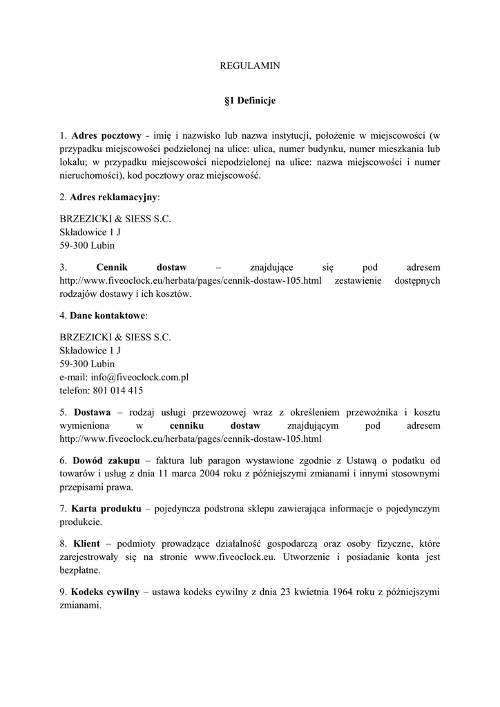 REGULAMIN §1 Definicje 1. Adres pocztowy - imię i nazwisko lub nazwa instytucji, położenie w miejscowości (w przypadku miejscowości podzielonej na ulice: ulica, numer budynku, numer mieszkania lub lokalu; w przypadku miejscowości niepodzielonej na ulice: nazwa miejscowości i numer nieruchomości), kod pocztowy oraz miejscowość. 2. Adres reklamacyjny: BRZEZICKI & SIESS S.C. Składowice 1 J 59-300 Lubin 3. Cennik dostaw – znajdujące się pod http://www.fiveoclock.eu/herbata/pages/cennik-dostaw-105.html zestawienie rodzajów dostawy i ich kosztów. adresem dostępnych 4. Dane kontaktowe: BRZEZICKI & SIESS S.C. Składowice 1 J 59-300 Lubin e-mail: [email protected] telefon: 801 014 415 5. Dostawa – rodzaj usługi przewozowej wraz z określeniem przewoźnika i kosztu wymieniona w cenniku dostaw znajdującym pod adresem http://www.fiveoclock.eu/herbata/pages/cennik-dostaw-105.html 6. Dowód zakupu – faktura lub paragon wystawione zgodnie z Ustawą o podatku od towarów i usług z dnia 11 marca 2004 roku z późniejszymi zmianami i innymi stosownymi przepisami prawa. 7. Karta produktu – pojedyncza podstrona sklepu zawierająca informacje o pojedynczym produkcie. 8. Klient – podmioty prowadzące działalność gospodarczą oraz osoby fizyczne, które zarejestrowały się na stronie www.fiveoclock.eu. Utworzenie i posiadanie konta jest bezpłatne. 9. Kodeks cywilny – ustawa kodeks cywilny z dnia 23 kwietnia 1964 roku z późniejszymi zmianami. 10. Konsument – podmioty prowadzące działalność gospodarczą oraz osoby fizyczne, które zarejestrowały się na stronie www.fiveoclock.eu. 11. Koszyk – lista produktów sporządzona z oferowanych w sklepie produktów na podstawie wyborów Kupującego. 12. Kupujący – zarówno Konsument, jak i Klient. 13. Miejsce wydania rzeczy – adres pocztowy lub punkt odbioru wskazane w zamówieniu przez Kupującego. 14. Moment wydania rzeczy – moment, w którym Kupujący lub wskazana przez niego do odbioru osoba trzecia obejmie rzecz w posiadanie. 15. Płatność – metoda dokonania zapłaty za przedmiot umowy i dostawę wymieniona pod adresem http://www.fiveoclock.eu/herbata/pages/formy-platnosci-106.html 16. Prawo konsumenckie – ustawa o prawach konsumenta z dnia 30 maja 2014 roku. 17. Produkt – minimalna i niepodzielna ilość rzeczy, która może być przedmiotem zamówienia, a która podana jest w sklepie Sprzedającego jako jednostka miary przy określeniu jego ceny (cena/jednostka). 18. Przedmiot umowy – produkty i dostawa będące przedmiotem umowy. 19. Przedmiot świadczenia – przedmiot umowy. 20. Punkt odbioru – miejsce wydania rzeczy nie będące adresem pocztowym, wymienione w zestawieniu udostępnionym przez Sprzedającego w sklepie. 21. Rzecz – rzecz ruchoma mogąca być lub będąca przedmiotem umowy. 22. Sklep – serwis internetowy dostępny pod adresem www.fiveoclock.eu, za pośrednictwem którego Kupujący może złożyć zamówienie. 23. Sprzedający: BRZEZICKI & SIESS S.C. Składowice 1 J 59-300 Lubin NIP: 692-236-58-94 , REGON: 241395167 , KONTO BANKOWE: BZ WBK S.A 98 1090 2082 0000 0001 0222 2430 24. System – zespół współpracujących ze sobą urządzeń informatycznych i oprogramowania, zapewniający przetwarzanie i przechowywanie, a także wysyłanie i odbieranie danych poprzez sieci telekomunikacyjne za pomocą właściwego dla danego rodzaju sieci urządzenia końcowego, potocznie określany Internetem. 25. Umowa – umowa zawierana poza lokalem przedsiębiorcy lub na odległość w rozumieniu Ustawy o prawach konsumenta z dnia 30 maja 2014 roku w przypadku Konsumentów i umowa sprzedaży w rozumieniu art. 535 Ustawy kodeks cywilny z dnia 23 kwietnia 1964 roku w przypadku Kupujących. 26. Wada – zarówno wada fizyczna, jak i wada prawna. 27. Wada fizyczna – niezgodność rzeczy sprzedanej z umową, a w szczególności jeśli rzecz: a) nie ma ona właściwości, które rzecz tego rodzaju powinna mieć ze względu na cel w umowie oznaczony albo wynikający z okoliczności lub przeznaczenia; b) nie ma właściwości, o których istnieniu Sprzedający zapewnił Konsumenta, c) nie nadaje się do celu, o którym Konsument poinformował Sprzedającego przy zawarciu umowy, a Sprzedający nie zgłosił zastrzeżenia co do takiego jej przeznaczenia; d) została Konsumentowi wydana w stanie niezupełnym; e) w razie nieprawidłowego jej zamontowania i uruchomienia, jeżeli czynności te zostały wykonane przez Sprzedającego lub osobę trzecią, za którą Sprzedający ponosi odpowiedzialność, albo przez Konsumenta, który postąpił według instrukcji otrzymanej od Sprzedającego; f) nie ma ona właściwości, o której zapewniał producent lub jego przedstawiciel lub osoba, która wprowadza rzecz do obrotu w zakresie swojej działalności gospodarczej oraz osoba, która przez umieszczenie na rzeczy sprzedanej swojej nazwy, znaku towarowego lub innego oznaczenia odróżniającego przedstawia się jako producent, chyba że Sprzedający zapewnień tych nie znał ani, oceniając rozsądnie, nie mógł znać albo nie mogły one mieć wpływu na decyzję Konsumenta o zawarciu umowy, albo gdy ich treść została sprostowana przed zawarciem umowy. 28. Wada prawna – sytuacja, kiedy rzecz sprzedana stanowi własność osoby trzeciej albo jest obciążona prawem osoby trzeciej, a także jeżeli ograniczenie w korzystaniu lub rozporządzaniu rzeczą wynika z decyzji lub orzeczenia właściwego organu. 29. Zamówienie – oświadczenie woli Kupującego złożone za pośrednictwem sklepu określające jednoznacznie: rodzaj i ilość produktów; rodzaj dostawy; rodzaj płatności; miejsce wydania rzeczy, dane Kupującego a zmierzające bezpośrednio do zawarcia umowy pomiędzy Kupującym a Sprzedającym. §2 Warunki ogólne 1. Umowa zawierana jest w języku polskim, zgodnie z polskim prawem i niniejszym regulaminem. 2. Miejsce wydania rzeczy musi znajdować się na terytorium Rzeczpospolitej Polskiej. 3. 