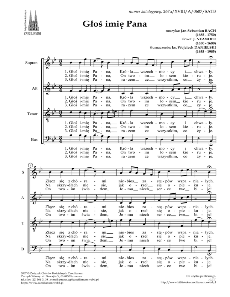 numer katalogowy: 267a/XVIII/A/0607/SATB Głoś imię Pana Sopran Alt Tenor Bas 6 S b 3 &b 4 b 3 &b 4 b V b 43 ? b b 43 b &b œ œ œ œ œ œ. œ J œ 1. Głoś i-mię Pa - na, 2. Głoś i-mię Pa - na, 3. Głoś i-mię Pa - na, j œ œ œ œ. œ œ œ œ œ œ. œ œ nœ œ œ J œ œ œ œ œ œ. œ œ J œ œ 1. Głoś i-mię Pa - na, 2. Głoś i-mię Pa - na, 3. Głoś i-mię Pa - na, 1. Głoś i-mię Pa - na, 2. Głoś i-mię Pa - na, 3. Głoś i-mię Pa - na, 1. Głoś i-mię Pa - na, 2. Głoś i-mię Pa - na, 3. Głoś i-mię Pa - na, œ œ. œ œ J Kró - la wszech - mo - cy On two - im lo - sem ra - zem ze wszy-stkim, œ œ œ œ œ œ œ œ œ nie - bios za jak o - rzeł Je - mu niech œ œ b Vb œ œ œ œ . œJ œ n œ œ œ œ ? bb œ œ œ. œ œ J œ Złącz się z chó - ra mi Na skrzy - dłach nie - sie, On two - im świa - tłem, 2007 © Związek Chórów Kościelnych Caecilianum Zarząd Główny: ul. Dewajtis 3 , 01-815 Warszawa tel./fax: (22) 561 01 38 , e-mail: [email protected] http://www.caecilianum.webd.pl œ Kró - la wszech - mo - cy On two - im lo - sem ra - zem ze wszy-stkim, j œ. œ œ œ œ œ œ œ nie - bios za jak o - rzeł Je - mu niech nie - bios za jak o - rzeł Je - mu niech œ œ nie - bios za jak o - rzeł Je - mu niech U œ i chwa - ły. kie - ru - je. co Ŝy - je. œ œ œœ ˙ Kró - la wszech - mo - cy On two - im lo - sem ra - zem ze wszy-stkim, b &b œ Złącz się z chó - ra mi Na skrzy - dłach nie - sie, On two - im świa - tłem, B œ œ œœ ˙ œ Kró - la wszech - mo - cy On two - im lo - sem ra - zem ze wszy-stkim, œ Złącz się z chó - ra mi Na skrzy - dłach nie - sie, On two - im świa - tłem, T œ œ œ œ œ œ œ Złącz się z chó - ra mi Na skrzy - dłach nie - sie, On two - im świa - tłem, A muzyka: Jan Sebastian BACH (1685 - 1750) słowa: J. NEANDER (1650 - 1680) tłumaczenie: ks. Wojciech DANIELSKI (1935 - 1985) U œ i chwa - ły. kie - ru - je. co Ŝy - je. œ œ Uœ œ i chwa - ły. kie - ru - je. co Ŝy - je. ˙ œ uœ i chwa - ły. kie - ru - je. co Ŝy - je. œ œ ˙ U œ stę - pów wspa - nia - łych. się o - pie - ku - je. ser - ce twe bi - je! œ œ œ œ œ ˙ U œ stę - pów wspa - nia - łych. się o - pie - ku - je. ser - ce twe bi - je! œ œ œ œ œ œ œ œ Uœ stę - pów wspa - nia - łych. się o - pie - ku - je. ser - ce twe bi - je! ˙ uœ stę - pów wspa - nia - łych. się o - pie - ku - je. ser - ce twe bi - je! Do uŜytku publicznego. http://www.biblioteka.caecilianum.webd.pl Głoś imię Pana - Jan Sebastian BACH b œ œ œ œ œ &b 11 S Har - fa i Daj Mu swą On śy - ciem A T B b &b œ œ œ b œ Vb œ œ ? bb œ A T & Har - fa i Daj Mu swą On śy - ciem róg dłoń, twym, Har - fa i Daj Mu swą On śy - ciem róg dłoń, twym, œ œ œ By krań On cię Te - raz œ œ By krań On cię Te - raz b Vb œ ? bb œ - - œ œ By krań On cię Te - raz B ˙ róg dłoń, twym, b &b œ bb róg dłoń, twym, - ce od i œ ce od i œ ce od i #œ nœ By krań On cię Te - raz œ - ce od i ˙ ˙ œ Œ œ œ œ œ œ œ œ œ œ œ Œ ˙ Œ "KtóŜ jest jak za - wo - łaj śpie - waj Mu Bóg!" doń; hymn niech za - gra: w przy - go - dzie wdzię - czno - ści "KtóŜ jest jak za - wo - łaj śpie - waj Mu Bóg!" doń; hymn œ œ œ œ œ œ œ œ - - œ œ zie - mi sły zła za - cho na wie - ki. -2- sza wu A sza wu A ˙ - sza wu A œ ˙ Œ œ - œ. sza wu A œ U ˙ œ - œ œ Œ ˙ niech za - gra: w przy - go - dzie wdzię - czno - ści œ zie - mi sły zła za - cho na wie - ki. œ œ Bóg!" doń; hymn zie - mi sły zła za - cho na wie - ki. œ œ œ Bóg!" doń; hymn "KtóŜ jest jak za - wo - łaj śpie - waj Mu œ Œ "KtóŜ jest jak za - wo - łaj śpie - waj Mu ˙ niech za - gra: w przy - go - dzie wdzię - czno - ści œ Œ œ œ œ œ œ niech za - gra: w przy - go - dzie wdzię - czno - ści zie - mi sły zła za - cho na wie - ki. œ œ œ œ Œ Har - fa i Daj Mu swą On śy - ciem 16 S ˙ - œ - - - ły. je. men. j U œ œ ły. je. men. U œ ły. je. men. œ u ły. je. men. http://www.biblioteka.caecilianum.webd.pl