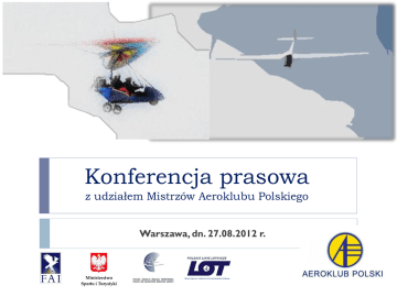 Konferencja prasowa z udziałem Mistrzów Aeroklubu Polskiego Warszawa, dn. 27.08.2012 r. Konferencja prasowa AGENDA 11:00 – Otwarcie spotkania 11:05 – Omówienie ostatnich Mistrzostw Świata: Mikrolotowe Mistrzostwa Świata (Hiszpania) Mistrzostwa Świata w Akrobacji Szybowcowej (Dubnica) Szybowcowe Mistrzostwa Świata (Uvadle) 11:15 – Prezentacja medalistów Mistrzostw Świata 11:30 – Wypowiedzi zaproszonych Gości 11:30 – Zapowiedź występu Polskiej Reprezentacji w 18. Rajdowych Mistrzostwach Świata 11:35 – Rozmowy z medalistami Mistrzostw Świata i przedstawicielami AP 12:00 – Zakończenie XIII Mikrolotowe Mistrzostwa Świata MARUGAN – HISZPANIA, 11 – 18 sierpnia 2012 roku W miejscowości Marugan, w Hiszpanii odbyły się XIII Mikrolotowe Mistrzostwa Świata w dniach 11 – 18 sierpnia 2012 roku. Zawody rozegrano w następujących klasach: AL2, GL2, WL1 oraz WL2. Na starcie stawiało się ponad 49 załóg z 12 różnych krajów. Polska reprezentacja, składała się z trzech załóg i rywalizowała w dwóch klasach – AL2 i WL2. W klasie samolotów ultralekkich (AL2): pilot Dariusz Kędzierski z nawigatorem Mieczysławem Szurgotem (Aeroklub Szczeciński) (Aeroklub Włocławski) W klasie motolotni dwuosobowych (WL2): pilot Przemysław Jurkiewicz z nawigatorem Dominiką Jurkiewicz (Aeroklub Pomorski) (Grupa Falco) pilot Romuald Ruks z nawigatorem Mariuszem Jarmuszczakiem (Aeroklub Poznański) (Aeroklub Poznański) XIII Mikrolotowe Mistrzostwa Świata WYNIKI Przemysław Jurkiewicz Dominika Jurkiewicz Wicemistrzowie Świata w sporcie mikrolotowym Łącznie 1 medal: 1 srebrny: II miejsce w klasie motolotni dwuosobowych - Przemysław i Dominika Jurkiewicz Mistrzostwa Świata w Akrobacji Szybowcowej DUBNICA NAD VAHOM - SŁOWACJA, 08 – 19 sierpnia 2012 roku Mistrzostwa Świata w Akrobacji Szybowcowej rozgrywane zostały na Słowacji w miejscowości Dubnica nad Vahom w dn. 08 – 19 sierpnia 2012 roku w dwóch klasach: - Unlimited - Advanced Do mistrzostw zostało zgłoszonych 69 pilotów. Reprezentacja Polski liczyła 7 zawodników: - w klasie Unlimited Jerzy Makula (Aeroklubu Rybnickiego Okręgu Węglowego) Maciej Pospieszyński (Aeroklub Warszawski) - w klasie Advanced Magdalena Stróżyk (Aeroklub Poznański) Katarzyna Żmudzińska (Aeroklub Poznański) Błażej Morawski (Aeroklub Częstochowski) Tomek Kaczmarczyk (Aeroklub Poznański) Sławomir Talowski (Aeroklub Częstochowski) Ciekawostką jest, iż już drugi rok z rzędu podczas mistrzostw wykorzystywany jest system "Poznan Height Measuring Device" do pomiaru wysokości szybowców w strefie. Służy on do sprawdzania, czy każdy pilot wykonuje akrobacje w strefie, liczącej 1000 x 1000 x 1000m. Mistrzostwa Świata w Akrobacji Szybowcowej WYNIKI Maciej Pospieszyński Mistrz Świata w Akrobacji Szybowcowej w klasie unlimited Łącznie 2 medale: 3 złote: I miejsce i tytuł Mistrza Świata w klasie unlimited – Maciej Pospieszyński I miejsce za program Obowiązkowy – Maciej Pospieszyński I miejsce za program Nieznany – Maciej Pospieszyński 1 srebrny: II miejsce za program Obowiązkowy – Jerzy Makula 1 brązowy: III miejsce w klasyfikacji drużynowej w klasie advanced: Magdalena Stróżyk Katarzyna Żmudzińska Sławomir Talowski 32. Szybowcowe Mistrzostwa Świata w klasie Otwartej, 15 i 18 metrowej UVALDE – USA, 04 – 19 sierpnia 2012 roku 32. Szybowcowe Mistrzostwa Świata w klasie Otwartej, 15 i 18 metrowej były rozgrywane na lotnisku w Uvalde (USA) ok. 150 km na zachód od San Antonio w dniach 04 - 19.08.2012 roku W mistrzostwach wystartowało 98 pilotów z 24 krajów z całego Świata. Polskę reprezentowali: - w klasie 15 metrowej Sebastian Kawa (Aeroklub Bielsko-Bialski) Tomasz Rubaj (Aeroklub Gliwicki) - w klasie 18 metrowej Zbigniew Nieradka (Aeroklub Częstochowski) Łukasz Wójcik (Aeroklub Włocławski) Christoph Matkowski (Aeroklub Gliwicki) - w klasie otwartej Wiktor Koźlik (Aeroklub Ostrowski) 32. Szybowcowe Mistrzostwa Świata WYNIKI Sebastian Kawa Mistrz Świata w sporcie szybowcowym w klasie 15 metrowej Zbigniew Nieradka Mistrz Świata w sporcie szybowcowym w klasie 18 metrowej Łukasz Wójcik Wicemistrz Świata w sporcie szybowcowym w klasie 18 metrowej Łącznie 3 medale: 2 złote: I miejsce w klasie 15 metrowej – Sebastian Kawa I miejsce w klasie 18 metrowej – Zbigniew Nieradka 1 srebrny: II miejsce w klasie 18 metrowej – Łukasz Wójcik Polska Reprezentacja dodatkowo zajęła I miejsce w klasyfikacji drużynowej. Zapowiedź 18. SAMOLOTOWE RAJDOWE MISTRZOSTWA ŚWIATA Nazwa imprezy: Miejsce imprezy: Termin zawodów: 18. Rajdowe Mistrzostwa Świata Castellon, Hiszpania 03 – 09 września 2012 roku Na poprzednich, 17 Rajdowych Mistrzostwach Świata na Słowacji, polskie załogi zdobyły tytuł mistrza i dwóch wicemistrzów świata oraz drużynowy tytuł mistrzów świata. W • • • • • • • składzie obecnej ekipy leci 7 załóg: Obrońcy tytułu mistrzowskiego – załoga Darocha Janusz/Chrząszcz Zbigniew Obrońcy tytułu wicemistrzowskiego – załoga Wieczorek Michał/Osowski Michał Załoga – Wieczorek Krzysztof /Wieczorek Kamil Załoga – Skrętowicz Krzysztof /Sysio Jarosław Załoga – Kachaniak Marek/Pawlak Łukasz Załoga – Radomski Bolesław/Lechowski Dariusz Załoga – Markiewicz Jerzy/Skalik Marcin Skład Polskiej reprezentacji to doświadczeni piloci i bardzo dobrzy nawigatorzy. Większość załóg ma już na swoim koncie tytuły mistrzów Polski, Europy i Świata, dlatego też w tegorocznych Rajdowych Mistrzostwach Świata zawodnicy i trenerzy celują wysoko. Spodziewamy się przynajmniej trzech lokat na podium, w tym nawet pierwszego miejsca. Konferencja prasowa z udziałem Mistrzów Aeroklubu Polskiego Dziękujemy za uwagę !
