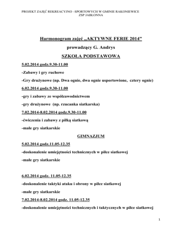PROJEKT ZAJĘĆ REKREACYJNO –SPORTOWYCH W GMINIE RAKONIEWICE ZSP JABŁONNA Harmonogram zajęć ,,AKTYWNE FERIE 2014” prowadzący G. Andrys SZKOŁA PODSTAWOWA 5.02.2014 godz.9.30-11.00 -Zabawy i gry ruchowe -Gry drużynowe (np. Dwa ognie, dwa ognie usportowione, cztery ognie) 6.02.2014 godz.9.30-11.00 -gry i zabawy ze współzawodnictwem -gry drużynowe (np. rzucanka siatkarska) 7.02.2014-8.02.2014 godz.9.30-11.00 -ćwiczenia i zabawy z piłką siatkową -małe gry siatkarskie GIMNAZJUM 5.02.2014 godz.11.05-12.35 -doskonalenie umiejętności technicznych w piłce siatkowej -małe gry siatkarskie 6.02.2014 godz. 11.05-12.35 -doskonalenie taktyki ataku i obrony w piłce siatkowej -małe gry siatkarskie 7.02.2014-8.02.2014 godz. 11.05-12.35 -doskonalenie umiejętności technicznych i taktycznych w piłce siatkowej 1 PROJEKT ZAJĘĆ REKREACYJNO –SPORTOWYCH W GMINIE RAKONIEWICE ZSP JABŁONNA Harmonogram zajęć ,,AKTYWNE FERIE 2014” prowadzący Bogdan Bartkowiak Gimnazjum I-III- chłopcy 3.02.2014 godz.9.30-12.30 -Gry drużynowe – piłka siatkowa Gimnazjum I-III - dziewczęta 4.02.2014 godz.9.30-12.30 -Gry drużynowe – piłka siatkowa 2