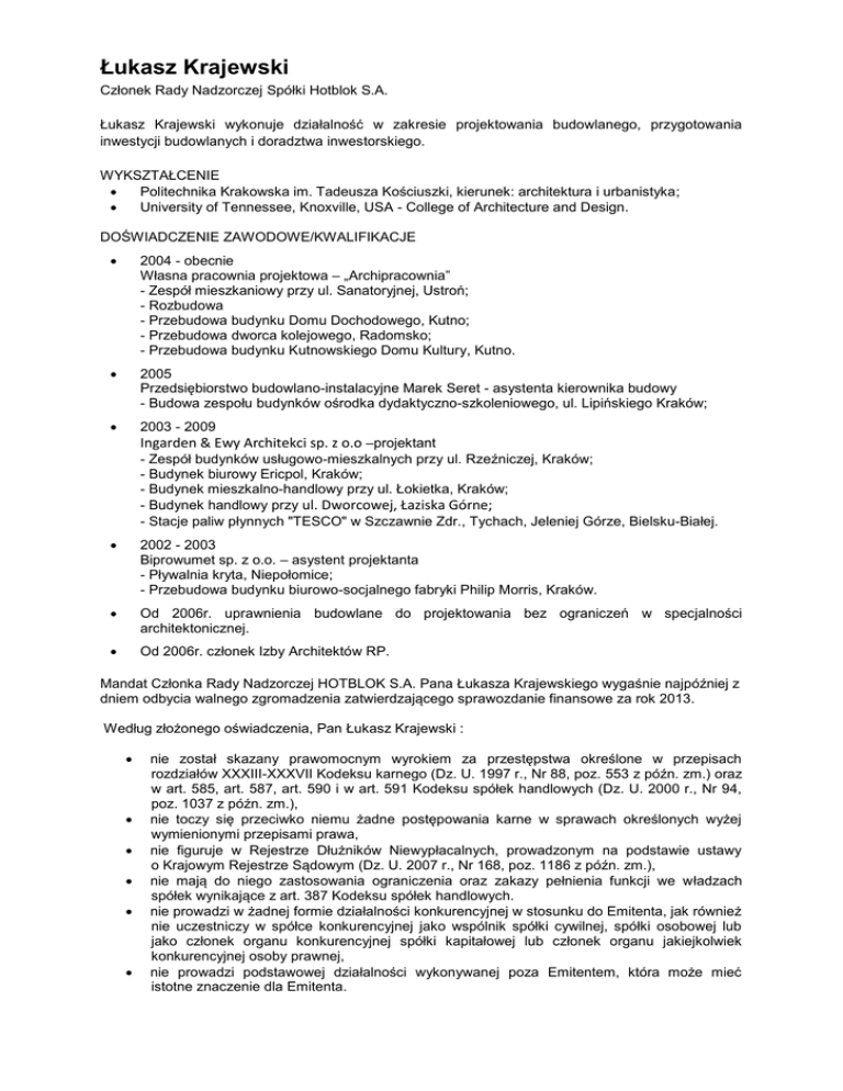 Łukasz Krajewski Członek Rady Nadzorczej Spółki Hotblok S.A. Łukasz Krajewski wykonuje działalność w zakresie projektowania budowlanego, przygotowania inwestycji budowlanych i doradztwa inwestorskiego. WYKSZTAŁCENIE Politechnika Krakowska im. Tadeusza Kościuszki, kierunek: architektura i urbanistyka; University of Tennessee, Knoxville, USA - College of Architecture and Design. DOŚWIADCZENIE ZAWODOWE/KWALIFIKACJE 2004 - obecnie Własna pracownia projektowa – „Archipracownia” - Zespół mieszkaniowy przy ul. Sanatoryjnej, Ustroń; - Rozbudowa - Przebudowa budynku Domu Dochodowego, Kutno; - Przebudowa dworca kolejowego, Radomsko; - Przebudowa budynku Kutnowskiego Domu Kultury, Kutno. 2005 Przedsiębiorstwo budowlano-instalacyjne Marek Seret - asystenta kierownika budowy - Budowa zespołu budynków ośrodka dydaktyczno-szkoleniowego, ul. Lipińskiego Kraków; 2003 - 2009 Ingarden & Ewy Architekci sp. z o.o –projektant - Zespół budynków usługowo-mieszkalnych przy ul. Rzeźniczej, Kraków; - Budynek biurowy Ericpol, Kraków; - Budynek mieszkalno-handlowy przy ul. Łokietka, Kraków; - Budynek handlowy przy ul. Dworcowej, Łaziska Górne; - Stacje paliw płynnych "TESCO" w Szczawnie Zdr., Tychach, Jeleniej Górze, Bielsku-Białej. 2002 - 2003 Biprowumet sp. z o.o. – asystent projektanta - Pływalnia kryta, Niepołomice; - Przebudowa budynku biurowo-socjalnego fabryki Philip Morris, Kraków. Od 2006r. uprawnienia budowlane do projektowania bez ograniczeń w specjalności architektonicznej. Od 2006r. członek Izby Architektów RP. Mandat Członka Rady Nadzorczej HOTBLOK S.A. Pana Łukasza Krajewskiego wygaśnie najpóźniej z dniem odbycia walnego zgromadzenia zatwierdzającego sprawozdanie finansowe za rok 2013. Według złożonego oświadczenia, Pan Łukasz Krajewski : nie został skazany prawomocnym wyrokiem za przestępstwa określone w przepisach rozdziałów XXXIII-XXXVII Kodeksu karnego (Dz. U. 1997 r., Nr 88, poz. 553 z późn. zm.) oraz w art. 585, art. 587, art. 590 i w art. 591 Kodeksu spółek handlowych (Dz. U. 2000 r., Nr 94, poz. 1037 z późn. zm.), nie toczy się przeciwko niemu żadne postępowania karne w sprawach określonych wyżej wymienionymi przepisami prawa, nie figuruje w Rejestrze Dłużników Niewypłacalnych, prowadzonym na podstawie ustawy o Krajowym Rejestrze Sądowym (Dz. U. 2007 r., Nr 168, poz. 1186 z późn. zm.), nie mają do niego zastosowania ograniczenia oraz zakazy pełnienia funkcji we władzach spółek wynikające z art. 387 Kodeksu spółek handlowych. nie prowadzi w żadnej formie działalności konkurencyjnej w stosunku do Emitenta, jak również nie uczestniczy w spółce konkurencyjnej jako wspólnik spółki cywilnej, spółki osobowej lub jako członek organu konkurencyjnej spółki kapitałowej lub członek organu jakiejkolwiek konkurencyjnej osoby prawnej, nie prowadzi podstawowej działalności wykonywanej poza Emitentem, która może mieć istotne znaczenie dla Emitenta.
