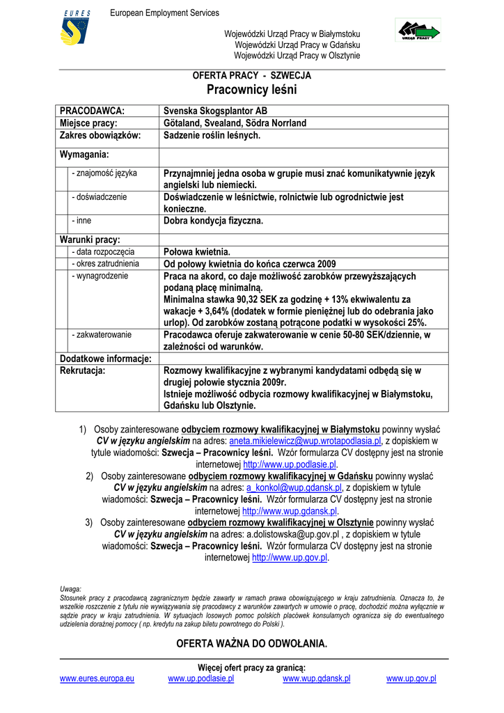 European Employment Services Wojewódzki Urząd Pracy w Białymstoku Wojewódzki Urząd Pracy w Gdańsku Wojewódzki Urząd Pracy w Olsztynie OFERTA PRACY - SZWECJA Pracownicy leśni PRACODAWCA: Miejsce pracy: Zakres obowiązków: Svenska Skogsplantor AB Götaland, Svealand, Södra Norrland Sadzenie roślin leśnych. Wymagania: - znajomość języka - doświadczenie - inne Przynajmniej jedna osoba w grupie musi znać komunikatywnie język angielski lub niemiecki. Doświadczenie w leśnictwie, rolnictwie lub ogrodnictwie jest konieczne. Dobra kondycja fizyczna. Warunki pracy: - data rozpoczęcia - okres zatrudnienia - wynagrodzenie - zakwaterowanie Dodatkowe informacje: Rekrutacja: Połowa kwietnia. Od połowy kwietnia do końca czerwca 2009 Praca na akord, co daje moŜliwość zarobków przewyŜszających podaną płacę minimalną. Minimalna stawka 90,32 SEK za godzinę + 13% ekwiwalentu za wakacje + 3,64% (dodatek w formie pienięŜnej lub do odebrania jako urlop). Od zarobków zostaną potrącone podatki w wysokości 25%. Pracodawca oferuje zakwaterowanie w cenie 50-80 SEK/dziennie, w zaleŜności od warunków. Rozmowy kwalifikacyjne z wybranymi kandydatami odbędą się w drugiej połowie stycznia 2009r. Istnieje moŜliwość odbycia rozmowy kwalifikacyjnej w Białymstoku, Gdańsku lub Olsztynie. 1) Osoby zainteresowane odbyciem rozmowy kwalifikacyjnej w Białymstoku powinny wysłać CV w języku angielskim na adres: [email protected], z dopiskiem w tytule wiadomości: Szwecja – Pracownicy leśni. Wzór formularza CV dostępny jest na stronie internetowej http://www.up.podlasie.pl. 2) Osoby zainteresowane odbyciem rozmowy kwalifikacyjnej w Gdańsku powinny wysłać CV w języku angielskim na adres: [email protected], z dopiskiem w tytule wiadomości: Szwecja – Pracownicy leśni. Wzór formularza CV dostępny jest na stronie internetowej http://www.wup.gdansk.pl. 3) Osoby zainteresowane odbyciem rozmowy kwalifikacyjnej w Olsztynie powinny wysłać CV w języku angielskim na adres: [email protected] , z dopiskiem w tytule wiadomości: Szwecja – Pracownicy leśni. Wzór formularza CV dostępny jest na stronie internetowej http://www.up.gov.pl. Uwaga: Stosunek pracy z pracodawcą zagranicznym będzie zawarty w ramach prawa obowiązującego w kraju zatrudnienia. Oznacza to, Ŝe wszelkie roszczenie z tytułu nie wywiązywania się pracodawcy z warunków zawartych w umowie o pracę, dochodzić moŜna wyłącznie w sądzie pracy w kraju zatrudnienia. W sytuacjach losowych pomoc polskich placówek konsularnych ogranicza się do ewentualnego udzielenia doraźnej pomocy ( np. kredytu na zakup biletu powrotnego do Polski ). OFERTA WAśNA DO ODWOŁANIA. www.eures.europa.eu Więcej ofert pracy za granicą: www.up.podlasie.pl www.wup.gdansk.pl www.up.gov.pl