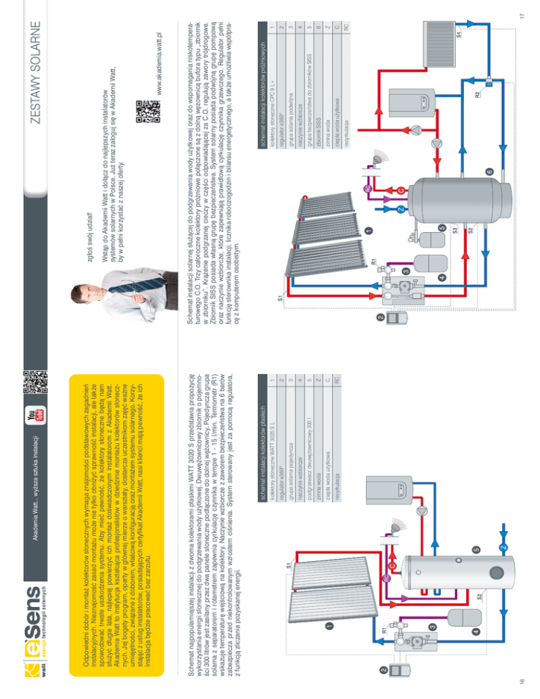 16 Z C RC zimna woda ciepła woda użytkowa recyrkulacja 4 5 podgrzewacz dwuwężownicowy 300 l 3 grupa solarna pojedyncza naczynie wzbiorcze kolektory słoneczne CPC 9 L+ 2 regulator e360O C RC recyrkulacja Z 6 5 4 3 2 1 ciepła woda użytkowa zimna woda zbiornik SISS grupa bezpieczeństwa do zbiorników SISS naczynie wzbiorcze grupa solarna podwójna regulator e360O schemat instalacji kolektorów próżniowych 1 kolektory słoneczne WATT 3020 S L Schemat instalacji solarnej służącej do podgrzewania wody użytkowej oraz do wspomagania niskotemperaturowego C.O. Trzy całoroczne kolektory próżniowe połączone są z dolną wężownicą bufora typu „zbiornik w zbiorniku”. Krążenie podgrzanej cieczy w części odpowiadającej za C.O. regulują zawory trójdrogowe. Zbiornik SISS posiada własną grupę bezpieczeństwa. System solarny posiada podwójną grupę pompową oraz naczynie wzbiorcze, które zapewniają prawidłową cyrkulację czynnika grzewczego. Regulator pełni funkcję sterownika instalacji, licznika roboczogodzin i bilansu energetycznego, a także umożliwia współpracę z komputerem osobistym. www.akademia.watt.pl Wstąp do Akademii Watt i dołącz do najlepszych instalatorów systemów solarnych w Polsce. Już teraz zaloguj się w Akademii Watt, by w pełni korzystać z naszej oferty. zgłoś swój udział! ZESTAWY SOLARNE schemat instalacji kolektorów płaskich Schemat najpopularniejszej instalacji z dwoma kolektorami płaskimi WATT 3020 S przedstawia propozycję wykorzystania energii słonecznej do podgrzewania wody użytkowej. Dwuwężownicowy zbiornik o pojemności 300 litrów jest zasilany przez dwa panele słoneczne podłączone do dolnej wężownicy. Pojedyncza grupa solarna z separatorem i rotametrem zapewnia cyrkulację czynnika w tempie 1 - 15 l/min. Termometr (R1) wskazuje temperaturę wejściową na kolektory. Naczynie wzbiorcze z zaworem bezpieczeństwa na 6 barów zabezpiecza przed niekontrolowanym wzrostem ciśnienia. System sterowany jest za pomocą regulatora, z funkcją zliczania pozyskanej energii. Odpowiedni dobór i montaż kolektorów słonecznych wymaga znajomości podstawowych zagadnień instalacyjnych. Nieznajomość zasad montażu może nie tylko obniżyć sprawność instalacji, ale także spowodować trwałe uszkodzenia systemu. Aby mieć pewność, że kolektory słoneczne będą nam służyć długie lata, najlepiej powierzyć ich montaż doświadczonym instalatorom z Akademii Watt. Akademia Watt to instytucja kształcąca profesjonalistów w dziedzinie montażu kolektorów słonecznych. Jej bogaty program, oparty w głównej mierze o warsztaty, dostarcza uczestnikom zajęć ważne umiejętności, związane z doborem, właściwą konfiguracją oraz montażem systemu solarnego. Korzystając z usług instalatorów, posiadających certyfikat Akademii Watt, nasi klienci mają pewność, że ich instalacja będzie pracować bez zarzutu. Akademia Watt... wyższa sztuka instalacji 17