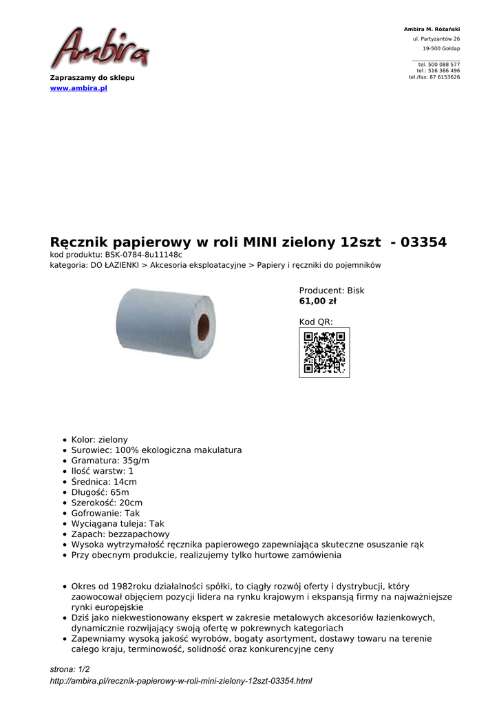 Ambira M. Różański ul. Partyzantów 26 19-500 Gołdap ___________________ tel. 500 088 577 tel.: 516 366 496 tel./fax: 87 6153626 Zapraszamy do sklepu www.ambira.pl Ręcznik papierowy w roli MINI zielony 12szt - 03354 kod produktu: BSK-0784-8u11148c kategoria: DO ŁAZIENKI > Akcesoria eksploatacyjne > Papiery i ręczniki do pojemników Producent: Bisk 61,00 zł Kod QR: Kolor: zielony Surowiec: 100% ekologiczna makulatura Gramatura: 35g/m Ilość warstw: 1 Średnica: 14cm Długość: 65m Szerokość: 20cm Gofrowanie: Tak Wyciągana tuleja: Tak Zapach: bezzapachowy Wysoka wytrzymałość ręcznika papierowego zapewniająca skuteczne osuszanie rąk Przy obecnym produkcie, realizujemy tylko hurtowe zamówienia Okres od 1982roku działalności spółki, to ciągły rozwój oferty i dystrybucji, który zaowocował objęciem pozycji lidera na rynku krajowym i ekspansją firmy na najważniejsze rynki europejskie Dziś jako niekwestionowany ekspert w zakresie metalowych akcesoriów łazienkowych, dynamicznie rozwijający swoją ofertę w pokrewnych kategoriach Zapewniamy wysoką jakość wyrobów, bogaty asortyment, dostawy towaru na terenie całego kraju, terminowość, solidność oraz konkurencyjne ceny strona: 1/2 http://ambira.pl/recznik-papierowy-w-roli-mini-zielony-12szt-03354.html Od lat współpracujemy z klientami oraz partnerami handlowymi w Polsce i za granicą. Mamy duże doświadczenie i doskonale rozumiemy potrzeby klientów Design naszych produktów odzwierciedla najnowsze trendy w dekoracji, nasze portfolio zostało skomponowane w odpowiedzi na zapotrzebowanie różnych kanałów dystrybucyjnych, a każdy klient traktowany jest indywidualnie Niniejsze produkty posiadają atesty, wymagane zgłoszenia i certyfikaty zgodności, jeśli są wymagane Zapytaj czy produkt jest w magazynie, wysyłka 24h. W przypadku ich braku, realizacja do 7 dni roboczych. strona: 2/2 http://ambira.pl/recznik-papierowy-w-roli-mini-zielony-12szt-03354.html