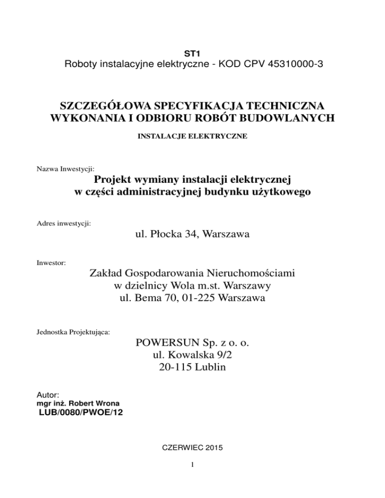 ST1 Roboty instalacyjne elektryczne - KOD CPV 45310000-3 SZCZEGÓŁOWA SPECYFIKACJA TECHNICZNA WYKONANIA I ODBIORU ROBÓT BUDOWLANYCH INSTALACJE ELEKTRYCZNE Nazwa Inwestycji: Projekt wymiany instalacji elektrycznej w części administracyjnej budynku użytkowego Adres inwestycji: ul. Płocka 34, Warszawa Inwestor: Zakład Gospodarowania Nieruchomościami w dzielnicy Wola m.st. Warszawy ul. Bema 70, 01-225 Warszawa Jednostka Projektująca: POWERSUN Sp. z o. o. ul. Kowalska 9/2 20-115 Lublin Autor: mgr inż. Robert Wrona LUB/0080/PWOE/12 CZERWIEC 2015 1 SPIS TREŚCI: ST1 ROBOTY INSTALACYJNE ELEKTRYCZNE - KOD CPV 45310000-3..............................1 1.1 Nazwa zamówienia.......................................................................................................................5 1.3 Informacje o terenie budowy.......................................................................................................5 1.4 Nazwy i kody robót CPV..............................................................................................................6 1.6 Określenia podstawowe................................................................................................................6 2.1 Ogólne wymagania dotyczące wyrobów stosowanych przy budowie instalacji elektrycznych......................................................................................................................................................7 2.2 Niezbędne wymagania związane z transportowaniem i przechowywaniem wyrobów stosowanych przy budowie instalacji elektrycznych...............................................................................7 2.2.1 Wymagania ogólne..................................................................................................................7 2.2.2 Transport materiałów...............................................................................................................7 2.2.3 Odbiór i przyjmowanie materiałów, wyrobów i urządzeń –kontrola jakości..........................7 2.2.4 Składowanie materiałów..........................................................................................................8 3. WYMAGANIA DOTYCZĄCE SPRZĘTU I MASZYN PRZEWIDZIANYCH DO WYKONANIA ROBÓT....................................................................................................................8 3.1 Maszyny i urządzenia stosowane przy wykonywaniu robót elektrycznych...........................8 4. WYMAGANIA DOTYCZĄCE ŚRODKÓW TRANSPORTU.............................................9 4.1Ogólne wymagania dotyczące transportu...................................................................................9 5. WYMAGANIA DOTYCZĄCE WYKONANIA ROBÓT......................................................9 5.1 Wymagania ogólne dotyczące wykonywania instalacji elektrycznych....................................9 5.1.1 Tablice elektryczne..................................................................................................................9 5.1.2 Trasowanie...............................................................................................................................9 5.1.3 Kucie bruzd.............................................................................................................................9 5.1.4 Wykonanie przebić................................................................................................................10 5.1.5 Zaprawianie bruzd i przebić..................................................................................................10 5.1.6 Montaż konstrukcji wsporczych i uchwytów........................................................................10 5.1.7 Układanie rur.........................................................................................................................10 5.1.8 Instalowanie puszek...............................................................................................................10 5.1.9 Układanie przewodów...........................................................................................................11 5.1.10 Układanie przewodów w rurach..........................................................................................11 5.1.11 Układanie przewodów na uchwytach..................................................................................11 5.1.12 Układanie przewodów w tynku...........................................................................................11 5.1.13 Układanie przewodów na drabinkach i korytkach kablowych............................................12 5.1.14 Łączenie przewodów...........................................................................................................12 5.1.15 Podejścia do odbiorników i przyłączenie odbiorników.......................................................12 2 5.1.16 Demontaż opraw oświetleniowych i osprzętu.....................................................................12 5.1.17 Montaż gniazd wtyczkowych i łączników...........................................................................12 5.1.18 Montaż opraw oświetleniowych..........................................................................................13 5.1.19 Montaż aparatów..................................................................................................................13 5.1.20 Połączenia wyrównawcze miejscowe..................................................................................13 5.1.21 Połączenia wyrównawcze lokalne.......................................................................................13 5.1.22 Przekroje przewodów ochronnych......................................................................................14 5.1.23 Rodzaje przewodów ochronnych........................................................................................14 5.1.24 Wymogi instalacyjne dla przewodów oc