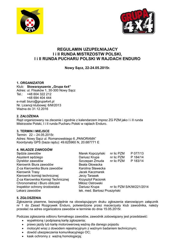 REGULAMIN UZUPEŁNIAJACY I i II RUNDA MISTRZOSTW POLSKI, I i II RUNDA PUCHARU POLSKI W RAJDACH ENDURO Nowy Sącz, 22-24.05.2015r. 1. ORGANIZATOR Klub: Stowarzyszenie „Grupa 4x4” Adres: ul. Flisaków 1, 30-300 Nowy Sącz Tel.: +48 604 322 212 +48 694 404 444 e-mail: [email protected] Nr. Licencji klubowej: 6/M/2013 Ważna do 31.12.2016 2. ZAŁOŻENIA Rajd organizowany na zlecenie i zgodnie z kalendarzem imprez ZG PZM jako I i II runda Mistrzostw Polski, I i II runda Pucharu Polski w rajdach Enduro. 3. TERMIN I MIEJSCE Termin: 22 – 24.05.2015r. Adres: Nowy Sącz ul. Romanowskiego 6 „PANORAMA” Koordynaty GPS (baza rajdu): 49.625960 N, 20.687771 E 4. WŁADZE ZAWODÓW Sędzia zawodów Asystent sędziego Dyrektor zawodów Kierownik Biura zawodów Z-ca Kierownika Biura zawodów Kierownik Trasy Kierownik komisji technicznej Z-ca Kierownika Komisji Technicznej Chronometraż i Biuro obliczeń Inspektor ochrony środowiska Lekarz zawodów Marek Kopczyński nr lic PZM P 077/13 Dariusz Krupa nr lic PZM P 184/14 Szczepan Żmuda nr lic PZM P 183/14 Beata Głowacka Karolina Sławecka Jacek Kaczmarek Jerzy Tarasek Krzysztof Paciorek Miłosz Ostrowski Dariusz Krupa nr lic PZM S/K/M/221/2014 lek. med. Bartosz Pruszyński 5. ZGŁOSZENIA Zgłoszenia pisemne, bezwzględnie na obowiązującym druku zgłoszenia stanowiącym załącznik nr 1 do Zasad Rozgrywek Enduro, potwierdzone przez macierzysty klub zawodnika, należy przesłać na adres organizatora zawodów w terminie do dnia 15.05.2015r. Podczas zgłaszania odbioru formalnego zawodów, zawodnik zobowiązany jest przedstawić: wypełnioną i podpisaną kartę zgłoszenia; prawo jazdy lub kartę motorowerową ważną dla danego pojazdu motocykl wraz z dowodem rejestracyjnym z ważnym badaniem technicznym; dowód ubezpieczenia komunikacyjnego OC; kask ochronny z ważną homologacją; kartę zdrowia z ważnymi badaniami lekarskimi - nie dot. klasy Amator; licencję sportową PZM lub międzynarodową odpowiednią dla rozgrywek Mistrzostw Polski lub Pucharu Polski (zgodnie z 2.6 i 2.7 Zasad rozgrywek Enduro) i klasy do której zawodnik został zgłoszony (zgodnie z 2.8 i 2.12 Zasad rozgrywek Enduro) – nie dot. klasy Amator; licencję sponsorską (w przypadku udziału w klasyfikacji zespołów sponsorskich) - nie dot. klasy Amator; dowód wpłaty wpisowego. Pojazd powinien spełniać wymogi Kodeksu Ruchu Drogowego. Wpisowe za udział w zawodach dwudniowych: Junior 50 130 zł + 20 zł za pomiar czasu - transponder pozostałe klasy motocykli i quadów 380 zł + 20 zł za pomiar czasu - transponder Wpisowe za udział w jednym dniu zawodów: junior 50 100 zł + 10 zł za pomiar czasu - transponder pozostałe klasy motocykli i quadów 250 zł + 10 zł za pomiar czasu - transponder Jeśli zgłoszenie zawodnika dotarło do organizatora przed upływem siedmiu dni przed zawodami to ma on obowiązek zmniejszyć wpisowe o min. 100 zł (min. 50 zł dla klasy Junior 50). Wpisowe należy wpłacać na konto: Bank: PEKAO S.A. o/Nowy Sącz konto: 54 1240 4748 1111 0010 3193 9451 6. UDZIAŁ ZAWODNIKÓW ZAGRANICZNYCH Zawody zgłoszone są dostępne dla zawodników zagranicznych. Zawodnicy zagraniczni zgłoszeni do zawodów muszą przedstawić podczas odbioru administracyjnego licencję FIM Europe lub FIM wraz z pozwoleniem na start wydanym przez macierzystą federację zawodnika. 7. BIURO ZAWODÓW - PADDOK Adres: Nowy Sącz ul. Romanowskiego 6 (Restauracja-Hotel PANORAMA) Tel.: +48 606 769 231 e-mail: [email protected] Godziny otwarcia biura: • w dniu 22.05.2015 (piątek) w godz. od 16:00 do 22:00; • w dniu 23.05.2015 (sobota) w godz. od 7:00 do 20:00; • w dniu 24.05.2015 (niedziela) w godz. od 7:00 do zakończenia zawodów. 8. ODBIÓR TECHNICZNY Adres: Paddok – Parking Restauracja-Hotel Panorama Nowy Sącz; ul. Romanowskiego 6 e-mail: [email protected] Godziny odbioru technicznego: • w dniu 22.05.2015 (piątek) w godzinach od 17:00 do 22:00. • w dniu 23/24.05.2015 w godzinach od 7:00 do 8:00, od godz 8.00 – 9.00 – odbiór dodatkowy, płatny w wysokości + 100,- zł. Zawodnik, który nie ukończył I dnia zawodów może startować w II dniu pod warunkiem przedstawienia motocykla do kontroli technicznej w czasie najpóźniej 60 minut po teoretycznym czasem przyjazdu na metę I dnia. Motocykl musi posiadać oznakowanie ramy dokonane w czasie odbioru technicznego przed I dniem. 9. ODPRAWA ZAWODNIKÓW Odprawa zawodników odbędzie się w dniu 23.05.2015 o godz. 10.30 w miejscu NS Rynek . 10. START W dniu 23.05.2015r. (sobota), godz. 10.50 Nowy Sącz – Rynek 49.625149 N, 20.691437 E Uwaga!!! Pojazdy przed startem muszą być odstawione do godz. 10.00 we wskazane miejsce na rynku miasta Nowego Sącza w miejscu wskazanym przez organizatora W dniu 24.05.2015r. (niedziela), godz 9:00 – miejsce PADDOK 11. TRASA RAJDU Długość jednej pętli trasy około 40 km (wraz z próbami). Ilość PKC z serwisem na pętli 1 Próby specjalne: Test rozruchu na starcie w obu dniach (nie dotyczy ATV Open); Test Cross – o długości około 4,5 km z pomiarem czasu w każdym okrążeniu; Test Enduro – o długości około 5 km z pomiarem czasu w każdym okrążeniu; Test Extreme – o długości okołó 2,5 km z pomiarem czasu w każdym okrążeniu; Ilość pętli przejeżdżanych w trakcie dnia zawodów dla poszczególnych klas Mistrzostw Polski i Pucharu Polski: Mistrzostwa Polski Puchar Polski Klasa Dzień I Dzień II Dzień I Dzień II Junior 50 3 pętle 2 pętle 3 pętle 2 pętle ATV Open 4 pętli 3 pętle 3 pętle 2 pętle E1, E2/E3, Junior, Master 5 pętli 4 pętli 4 pętli 3 pętle Kobiety - - 3 pętle 2 pętle Amator - - 3 pętle 2 pętle 12. NUMERY STARTOWE Zawodnicy mają obowiązek posiadać własne numery startowe. Rezerwacji numerów na dany sezon można dokonywać na stronie: motoresults.pl. Numery od 1 do 10 zarezerwowane są dla zawodników, którzy w klasyfikacji generalnej MP poprzedniego sezonu zajęli miejsca 1 – 10. 13. KONKURENCJE W trakcie zawodów