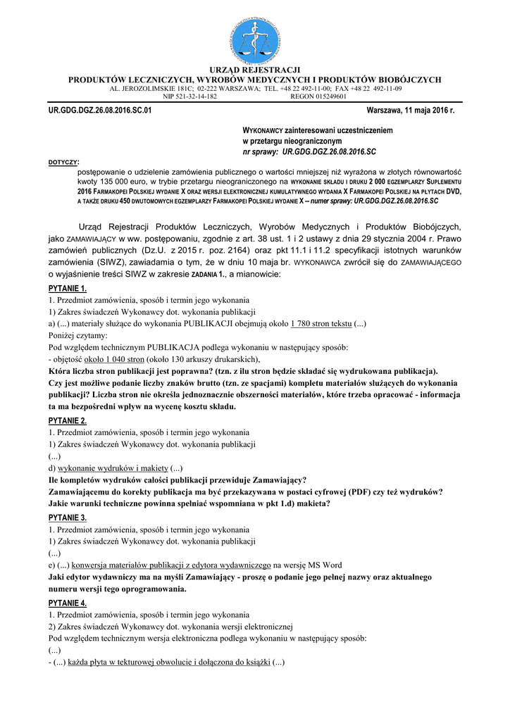 URZĄD REJESTRACJI PRODUKTÓW LECZNICZYCH, WYROBÓW MEDYCZNYCH I PRODUKTÓW BIOBÓJCZYCH AL. JEROZOLIMSKIE 181C; 02-222 WARSZAWA; TEL. +48 22 492-11-00; FAX +48 22 492-11-09 NIP 521-32-14-182 REGON 015249601 UR.GDG.DGZ.26.08.2016.SC.01 Warszawa, 11 maja 2016 r. WYKONAWCY zainteresowani uczestniczeniem w przetargu nieograniczonym nr sprawy: UR.GDG.DGZ.26.08.2016.SC DOTYCZY: postępowanie o udzielenie zamówienia publicznego o wartości mniejszej niż wyrażona w złotych równowartość kwoty 135 000 euro, w trybie przetargu nieograniczonego na WYKONANIE SKŁADU I DRUKU 2 000 EGZEMPLARZY SUPLEMENTU 2016 FARMAKOPEI POLSKIEJ WYDANIE X ORAZ WERSJI ELEKTRONICZNEJ KUMULATYWNEGO WYDANIA X FARMAKOPEI POLSKIEJ NA PŁYTACH DVD, A TAKŻE DRUKU 450 DWUTOMOWYCH EGZEMPLARZY FARMAKOPEI POLSKIEJ WYDANIE X – numer sprawy: UR.GDG.DGZ.26.08.2016.SC Urząd Rejestracji Produktów Leczniczych, Wyrobów Medycznych i Produktów Biobójczych, jako ZAMAWIAJĄCY w ww. postępowaniu, zgodnie z art. 38 ust. 1 i 2 ustawy z dnia 29 stycznia 2004 r. Prawo zamówień publicznych (Dz.U. z 2015 r. poz. 2164) oraz pkt 11.1 i 11.2 specyfikacji istotnych warunków zamówienia (SIWZ), zawiadamia o tym, że w dniu 10 maja br. WYKONAWCA zwrócił się do ZAMAWIAJĄCEGO o wyjaśnienie treści SIWZ w zakresie ZADANIA 1., a mianowicie: PYTANIE 1. 1. Przedmiot zamówienia, sposób i termin jego wykonania 1) Zakres świadczeń Wykonawcy dot. wykonania publikacji a) (...) materiały służące do wykonania PUBLIKACJI obejmują około 1 780 stron tekstu (...) Poniżej czytamy: Pod względem technicznym PUBLIKACJA podlega wykonaniu w następujący sposób: - objętość około 1 040 stron (około 130 arkuszy drukarskich), Która liczba stron publikacji jest poprawna? (tzn. z ilu stron będzie składać się wydrukowana publikacja). Czy jest możliwe podanie liczby znaków brutto (tzn. ze spacjami) kompletu materiałów służących do wykonania publikacji? Liczba stron nie określa jednoznacznie obszerności materiałów, które trzeba opracować - informacja ta ma bezpośredni wpływ na wycenę kosztu składu. PYTANIE 2. 1. Przedmiot zamówienia, sposób i termin jego wykonania 1) Zakres świadczeń Wykonawcy dot. wykonania publikacji (...) d) wykonanie wydruków i makiety (...) Ile kompletów wydruków całości publikacji przewiduje Zamawiający? Zamawiającemu do korekty publikacja ma być przekazywana w postaci cyfrowej (PDF) czy też wydruków? Jakie warunki techniczne powinna spełniać wspomniana w pkt 1.d) makieta? PYTANIE 3. 1. Przedmiot zamówienia, sposób i termin jego wykonania 1) Zakres świadczeń Wykonawcy dot. wykonania publikacji (...) e) (...) konwersja materiałów publikacji z edytora wydawniczego na wersję MS Word Jaki edytor wydawniczy ma na myśli Zamawiający - proszę o podanie jego pełnej nazwy oraz aktualnego numeru wersji tego oprogramowania. PYTANIE 4. 1. Przedmiot zamówienia, sposób i termin jego wykonania 2) Zakres świadczeń Wykonawcy dot. wykonania wersji elektronicznej Pod względem technicznym wersja elektroniczna podlega wykonaniu w następujący sposób: (...) - (...) każda płyta w tekturowej obwolucie i dołączona do książki (...) Czy tekturowa obwoluta płyty (koperta) ma być trwale zamykana (tak jak np. zamykane są koperty listowe) czy też zamykanie nie jest wymagane? Jak zadrukowana ma być w/w koperta? (druk jednokolorowy? druk pełnokolorowy?) Czy nadruki na kopertach dla płyt w systemie Macintosh i Windows mają różnić się od siebie? Czy koperty mają być trwale dołączone do książki (np. doklejane do wewnętrznej okładki)? PYTANIE 5. Wskazówki dotyczące składu Suplementu 2016 FP X oraz sporządzenia próbnej wersji (składu) po konwersji plików Ms Word na pliki CtP Plik "Przekładka.doc" różni się swoją zawartością od pozostałych czterech dokumentów wymaganych do przedstawienia w próbce. Ponadto nie ma swojego odpowiednika w przedstawionych wzorach. Wygląda on jak fragment spisu treści - ze schodkowym układem tytułów oraz tabulatorami. Proszę o określenie wymagań dotyczących opracowania tego tekstu oraz o przedstawienie wzoru poprawnego składu dla tego dokumentu. Brak w/w informacji będzie preferować wykonawców wcześniejszych edycji Farmakopei. W odpowiedzi uprzejmie wyjaśniamy: Ad.1. Objętość około 1 780 stron dotyczy materiału/tekstu przekazywanego przez ZAMAWIAJĄCEGO w formacie MS WORD. Ten tekst WYKONAWCA poddaje procesowi konwersji do formatu wydawniczego, który obejmować powinien około 1 040 stron (około 130 arkuszy wydawniczych), tak samo jak książka SUPLEMENT 2016 FARMAKOPEI POLSKIEJ WYDANIE X, wydrukowana w liczbie 2 000 egzemplarzy jednotomowych. Publikacja ma charakter specjalistyczny, zawiera liczne wzory, tabele, schematy, itp. dlatego nie jest praktycznie możliwe wiarygodne określenie liczby znaków. W myśl zaleceń podanych w pkt 1 i 11.2 SIWZ ZAMAWIAJĄCY zaprasza do Departamentu Farmakopei w celu wglądu do poprzednich wydań FP. Publikacja jest też dostępna w ogólnodostępnych bibliotekach np. uczelni medycznych, GBL. Ad.2. Na podstawie wieloletniego doświadczenia w procesach składu FP, wykonywane są 3-4 korekty „wydawnicze” publikacji (tzw. szczotki) na przekazywanych ZAMAWIAJĄCEMU przez WYKONAWCĘ wydrukach papierowych. Korekty obejmują m.in. zmiany merytoryczne wprowadzane do złożonego materiału przez Departament Farmakopei ZAMAWIAJĄCEGO. Wykonanie makiety w formie arkuszy drukarskich związane jest z przekazaniem materiału do druku. Ad.3. Postanowienie dotyczy procesu „odwrotnego”, tj. konwersji złożonego materiału po korektach plików PDF przez pracowników Departament Farmakopei, do wersji MS WORD, niezbędnej do przygotowywania w przyszłości kolejnych publikacji FP. ZAMAWIAJĄCY nie definiuje oprogramowania stosowanego przez WYKONAWCĘ w procesie składu. Weryfikacji podlega efekt/rezultat konwersji materiałów, tj. pliki. Ad.4. W załączeniu podajemy fotografie obwolut 