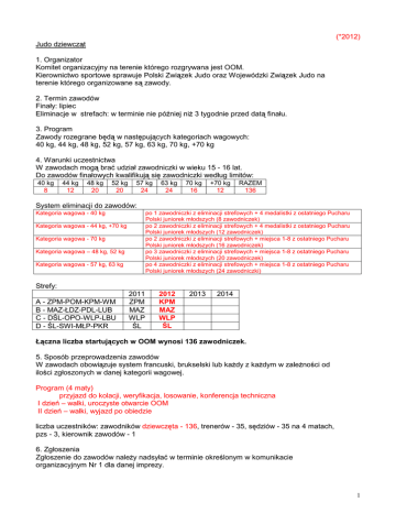 (*2012) Judo dziewcząt 1. Organizator Komitet organizacyjny na terenie którego rozgrywana jest OOM. Kierownictwo sportowe sprawuje Polski Związek Judo oraz Wojewódzki Związek Judo na terenie którego organizowane są zawody. 2. Termin zawodów Finały: lipiec Eliminacje w strefach: w terminie nie później niż 3 tygodnie przed datą finału. 3. Program Zawody rozegrane będą w następujących kategoriach wagowych: 40 kg, 44 kg, 48 kg, 52 kg, 57 kg, 63 kg, 70 kg, +70 kg 4. Warunki uczestnictwa W zawodach mogą brać udział zawodniczki w wieku 15 - 16 lat. Do zawodów finałowych kwalifikują się zawodniczki według limitów: 40 kg 8 44 kg 12 48 kg 20 52 kg 20 57 kg 24 63 kg 24 70 kg 16 +70 kg 12 RAZEM 136 System eliminacji do zawodów: Kategoria wagowa - 40 kg po 1 zawodniczki z eliminacji strefowych + 4 medalistki z ostatniego Pucharu Polski juniorek młodszych (8 zawodniczek) po 2 zawodniczki z eliminacji strefowych + 4 medalistki z ostatniego Pucharu Polski juniorek młodszych (12 zawodniczek) po 2 zawodniczki z eliminacji strefowych + miejsca 1-8 z ostatniego Pucharu Polski juniorek młodszych (16 zawodniczek) po 3 zawodniczki z eliminacji strefowych + miejsca 1-8 z ostatniego Pucharu Polski juniorek młodszych (20 zawodniczek) po 4 zawodniczki z eliminacji strefowych + miejsca 1-8 z ostatniego Pucharu Polski juniorek młodszych (24 zawodniczki) Kategoria wagowa - 44 kg, +70 kg Kategoria wagowa - 70 kg Kategoria wagowa – 48 kg, 52 kg Kategoria wagowa - 57 kg, 63 kg Strefy: A - ZPM-POM-KPM-WM B - MAZ-ŁDZ-PDL-LUB C - DŚL-OPO-WLP-LBU D - ŚL-SWI-MŁP-PKR 2011 ZPM MAZ WLP ŚL 2012 KPM MAZ WLP ŚL 2013 2014 Łączna liczba startujących w OOM wynosi 136 zawodniczek. 5. Sposób przeprowadzenia zawodów W zawodach obowiązuje system francuski, brukselski lub każdy z każdym w zależności od ilości zgłoszonych w danej kategorii wagowej. Program (4 maty) przyjazd do kolacji, weryfikacja, losowanie, konferencja techniczna I dzień – walki, uroczyste otwarcie OOM II dzień – walki, wyjazd po obiedzie liczba uczestników: zawodników dziewczęta - 136, trenerów - 35, sędziów - 35 na 4 matach, pzs - 3, kierownik zawodów - 1 6. Zgłoszenia Zgłoszenie do zawodów należy nadsyłać w terminie określonym w komunikacie organizacyjnym Nr 1 dla danej imprezy. 1 Imienne zgłoszenie sportowe (w celu weryfikacji startujących zawodniczek i zawodników do losowania zawodów) składają poszczególne kluby do Polskiego Związku Judo w trybie określonym w Regulaminie Sportowym PZJ. Punktacja (wszystkie zawodniczki które awansowały i wystartowały, oraz do Systemu zawodniczki z eliminacji wg tabeli) Lok. 1 2 3-4 5-6 7-8 9-12 13-24 PKT 9 7 5 4 3 2 1 60 Punktacja za eliminacje Kategoria wagowa Liczba zawodników w finale Eliminacje regionalne (pkt do Systemu) N – liczba zawodników zakwalifikowanych do Finałów OOM z eliminacji w danej strefie (w danej kategorii wagowej) 40 kg 8 44 kg 12 48 kg 20 52 kg 20 57 kg 24 63 kg 24 70 kg 16 +70 kg 12 Miejsce N+1 – 2 pkt Miejsca N+2,3,4 po 1pkt Miejsca N+1,2,3 po 1 pkt Miejsca N+1 po 1pkt Miejsca N+1 po 1pkt - - N+1,2 po 1pkt Miejsca N+1,2,3 po 1pkt Judo chłopców 1. Organizator Komitet organizacyjny na terenie którego rozgrywana jest OOM. Kierownictwo sportowe sprawuje Polski Związek Judo oraz Wojewódzki Związek Judo na terenie którego organizowane są zawody. 2. Termin zawodów Finały: lipiec Eliminacje w strefach: w terminie nie później niż 3 tygodnie przed datą finału. 3. Program Zawody rozegrane będą w następujących kategoriach wagowych: 46 kg, 50 kg, 55 kg, 60 kg, 66 kg, 73 kg, 81 kg, 90 kg, + 90 kg 4. Warunki uczestnictwa W zawodach mogą brać udział zawodnicy w wieku 15 - 16 lat. Do zawodów finałowych kwalifikują się zawodnicy według limitów: 46 kg 12 50 kg 20 55 kg 20 60 kg 24 66 kg 24 73 kg 24 81 kg 24 90 kg 20 + 90 kg 12 RAZEM 180 System eliminacji do zawodów: Kategoria wagowa - 46 kg, +90 kg Kategoria wagowa - 50 kg, 55 kg, 90 kg Kategoria wagowa – 60 kg, 66 kg, 73 kg, 81 kg po 2 zawodników z eliminacji strefowych + miejsca 1-3 z ostatniego Pucharu Polski juniorów młodszych (12 zawodników) po 3 zawodników z eliminacji strefowych + miejsca 1-8 z ostatniego Pucharu Polski juniorów młodszych (20 zawodników) po 4 zawodników z eliminacji strefowych + miejsca 1-8 z ostatniego Pucharu Polski juniorów młodszych (24 zawodników) Strefy: A - ZPM-POM-KPM-WM B - MAZ-ŁDZ-PDL-LUB C - DŚL-OPO-WLP-LBU D - ŚL-SWI-MŁP-PKR 2011 ZPM MAZ WLP ŚL 2012 KPM MAZ WLP ŚL 2013 2014 Łączna liczba startujących w OOM wynosi 180 zawodników. 5. Sposób przeprowadzenia zawodów W zawodach obowiązuje system francuski, brukselski lub każdy z każdym w zależności od ilości zgłoszonych w danej kategorii wagowej. 2 Program Program (4 maty) przyjazd do kolacji, weryfikacja, losowanie, konferencja techniczna I dzień – walki, uroczyste otwarcie OOM II dzień – walki, wyjazd po obiedzie liczba uczestników chłopców: zawodników - 180, trenerów - 45, sędziów – 35 na 4 matach (ci sami co w judo K), pzs - 3, kierownik zawodów - 1 6. Zgłoszenia Zgłoszenie do zawodów należy nadsyłać w terminie określonym w komunikacie organizacyjnym Nr 1 dla danej imprezy. Imienne zgłoszenie sportowe (w celu weryfikacji startujących zawodniczek i zawodników do losowania zawodów) składają poszczególne kluby do Polskiego Związku Judo w trybie określonym w Regulaminie Sportowym PZJ. 7. Punktacja (wszyscy zawodnicy którzy awansowali i wystartowali, oraz do Systemu zawodnicy z eliminacji wg tabeli) Lok. 1 2 3-4 5-6 7-8 9-12 13-24 PKT 9 7 5 4 3 2 1 60 Punktacja za eliminacje Kategoria wagowa Liczba zawodników w finale Eliminacje regionalne (pkt do Systemu) N – liczba zawodników zakwalifikowanych do Finałów OOM z eliminacji w danej strefie (w danej kategorii wagowej) 46 kg 12 Miejsca N+1,2,3 po 1 pkt 50 kg 20 55 kg 60 kg 66 kg 73 kg 81 kg 20 24 24 24 24 Miejsca Miejsca N+1 po N+1 po 1 pkt 1 pkt - - - - 90 kg 