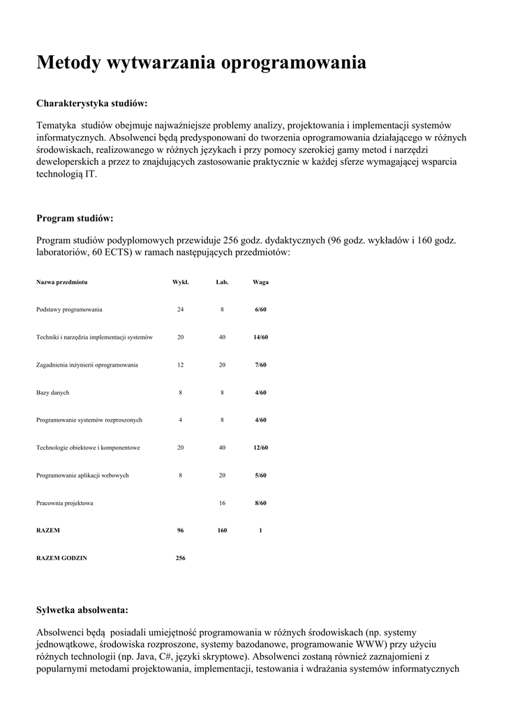 Metody wytwarzania oprogramowania Charakterystyka studiów: Tematyka studiów obejmuje najważniejsze problemy analizy, projektowania i implementacji systemów informatycznych. Absolwenci będą predysponowani do tworzenia oprogramowania działającego w różnych środowiskach, realizowanego w różnych językach i przy pomocy szerokiej gamy metod i narzędzi deweloperskich a przez to znajdujących zastosowanie praktycznie w każdej sferze wymagającej wsparcia technologią IT. Program studiów: Program studiów podyplomowych przewiduje 256 godz. dydaktycznych (96 godz. wykładów i 160 godz. laboratoriów, 60 ECTS) w ramach następujących przedmiotów: Nazwa przedmiotu Wykł. Lab. Waga Podstawy programowania 24 8 6/60 Techniki i narzędzia implementacji systemów 20 40 14/60 Zagadnienia inżynierii oprogramowania 12 20 7/60 Bazy danych 8 8 4/60 Programowanie systemów rozproszonych 4 8 4/60 Technologie obiektowe i komponentowe 20 40 12/60 Programowanie aplikacji webowych 8 20 5/60 16 8/60 160 1 Pracownia projektowa RAZEM 96 RAZEM GODZIN 256 Sylwetka absolwenta: Absolwenci będą posiadali umiejętność programowania w różnych środowiskach (np. systemy jednowątkowe, środowiska rozproszone, systemy bazodanowe, programowanie WWW) przy użyciu różnych technologii (np. Java, C#, języki skryptowe). Absolwenci zostaną również zaznajomieni z popularnymi metodami projektowania, implementacji, testowania i wdrażania systemów informatycznych jednowątkowe, środowiska rozproszone, systemy bazodanowe, programowanie WWW) przy użyciu różnych technologii (np. Java, C#, języki skryptowe). Absolwenci zostaną również zaznajomieni z popularnymi metodami projektowania, implementacji, testowania i wdrażania systemów informatycznych (np. RUP, MSF) i dzięki temu będą mogli z powodzeniem włączać się w proces konstrukcji oprogramowania czy to pełniąc funkcję eksperta dziedzinowego, analityka, projektanta, programisty, testera bądź wdrożeniowca. Wiedza zdobyta w ramach studiów Metody wytwarzania oprogramowania będzie stanowić zarówno uzupełnienie i pogłębienie wiadomości już posiadanych jak też umożliwiać dalszy rozwój czy to na specjalistycznych kursach, czy też w ramach studiów uzupełniających I lub II stopnia. Czas trwania: 2 semestry (od X 2016 r. do VI 2017 r.) Termin zgłoszeń: od V do IX 2016 r. Wymagane dokumenty: podanie o przyjęcie na studia, kwestionariusz osobowy (dostępny na stronie studiów), odpis dyplomu ukończenia studiów wyższych (I lub II stopnia) na dowolnym kierunku, poświadczenie wniesienia opłaty operacyjnej w wysokości 100 zł. Tryb zgłoszeń: kolejność zgłoszeń Liczba miejsc: min. 20, maks. 40 Miejsce zgłoszeń: AGH, Wydział Informatyki, Elektroniki i Telekomunikacji ul. Kawiory 21, 30-055 Kraków, pawilon D-17 (Centrum Informatyki), pokój 2.7 Osoba przyjmująca zgłoszenia: mgr inż. Małgorzata Urban (tel.: 12 328 33 22) Opłaty: 5 600 zł (w tym opłata operacyjna w wysokości 100 zł) Informacje dodatkowe: Program przewiduje 256 godz. zajęć. Zajęcia odbywają się w soboty i niedziele (łącznie ok. 16 zjazdów weekendowych). Organizator studiów podyplomowych: Wydział Informatyki, Elektroniki i Telekomunikacji Katedra Informatyki Adres organizatora: al. Mickiewicza 30, 30-059 Kraków pawilon D-17, pokój 2.7 (Centrum Informatyki, ul. Kawiory 21) tel.: 12 328 33 22 e-mail: [email protected] http://informatyka.podyplomowe.agh.edu.pl/ Kierownik: dr hab. inż. Aleksander Byrski Osoba do kontaktu: mgr inż. Małgorzata Urban