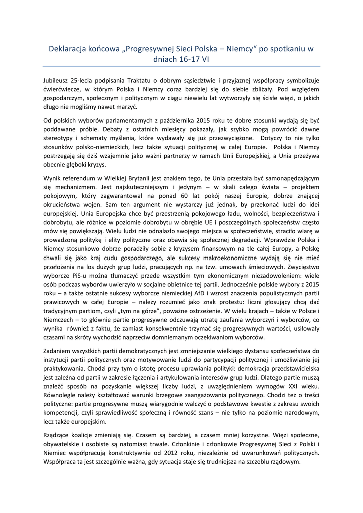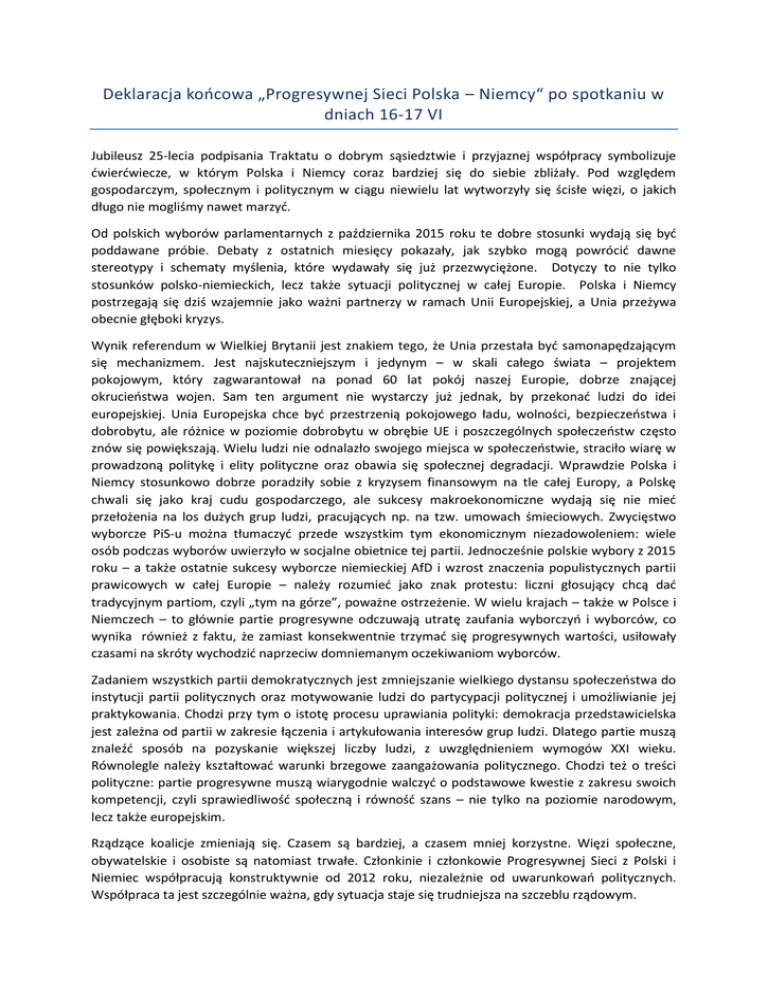 Deklaracja końcowa „Progresywnej Sieci Polska – Niemcy“ po spotkaniu w dniach 16-17 VI Jubileusz 25-lecia podpisania Traktatu o dobrym sąsiedztwie i przyjaznej współpracy symbolizuje ćwierćwiecze, w którym Polska i Niemcy coraz bardziej się do siebie zbliżały. Pod względem gospodarczym, społecznym i politycznym w ciągu niewielu lat wytworzyły się ścisłe więzi, o jakich długo nie mogliśmy nawet marzyć. Od polskich wyborów parlamentarnych z października 2015 roku te dobre stosunki wydają się być poddawane próbie. Debaty z ostatnich miesięcy pokazały, jak szybko mogą powrócić dawne stereotypy i schematy myślenia, które wydawały się już przezwyciężone. Dotyczy to nie tylko stosunków polsko-niemieckich, lecz także sytuacji politycznej w całej Europie. Polska i Niemcy postrzegają się dziś wzajemnie jako ważni partnerzy w ramach Unii Europejskiej, a Unia przeżywa obecnie głęboki kryzys. Wynik referendum w Wielkiej Brytanii jest znakiem tego, że Unia przestała być samonapędzającym się mechanizmem. Jest najskuteczniejszym i jedynym – w skali całego świata – projektem pokojowym, który zagwarantował na ponad 60 lat pokój naszej Europie, dobrze znającej okrucieństwa wojen. Sam ten argument nie wystarczy już jednak, by przekonać ludzi do idei europejskiej. Unia Europejska chce być przestrzenią pokojowego ładu, wolności, bezpieczeństwa i dobrobytu, ale różnice w poziomie dobrobytu w obrębie UE i poszczególnych społeczeństw często znów się powiększają. Wielu ludzi nie odnalazło swojego miejsca w społeczeństwie, straciło wiarę w prowadzoną politykę i elity polityczne oraz obawia się społecznej degradacji. Wprawdzie Polska i Niemcy stosunkowo dobrze poradziły sobie z kryzysem finansowym na tle całej Europy, a Polskę chwali się jako kraj cudu gospodarczego, ale sukcesy makroekonomiczne wydają się nie mieć przełożenia na los dużych grup ludzi, pracujących np. na tzw. umowach śmieciowych. Zwycięstwo wyborcze PiS-u można tłumaczyć przede wszystkim tym ekonomicznym niezadowoleniem: wiele osób podczas wyborów uwierzyło w socjalne obietnice tej partii. Jednocześnie polskie wybory z 2015 roku – a także ostatnie sukcesy wyborcze niemieckiej AfD i wzrost znaczenia populistycznych partii prawicowych w całej Europie – należy rozumieć jako znak protestu: liczni głosujący chcą dać tradycyjnym partiom, czyli „tym na górze”, poważne ostrzeżenie. W wielu krajach – także w Polsce i Niemczech – to głównie partie progresywne odczuwają utratę zaufania wyborczyń i wyborców, co wynika również z faktu, że zamiast konsekwentnie trzymać się progresywnych wartości, usiłowały czasami na skróty wychodzić naprzeciw domniemanym oczekiwaniom wyborców. Zadaniem wszystkich partii demokratycznych jest zmniejszanie wielkiego dystansu społeczeństwa do instytucji partii politycznych oraz motywowanie ludzi do partycypacji politycznej i umożliwianie jej praktykowania. Chodzi przy tym o istotę procesu uprawiania polityki: demokracja przedstawicielska jest zależna od partii w zakresie łączenia i artykułowania interesów grup ludzi. Dlatego partie muszą znaleźć sposób na pozyskanie większej liczby ludzi, z uwzględnieniem wymogów XXI wieku. Równolegle należy kształtować warunki brzegowe zaangażowania politycznego. Chodzi też o treści polityczne: partie progresywne muszą wiarygodnie walczyć o podstawowe kwestie z zakresu swoich kompetencji, czyli sprawiedliwość społeczną i równość szans – nie tylko na poziomie narodowym, lecz także europejskim. Rządzące koalicje zmieniają się. Czasem są bardziej, a czasem mniej korzystne. Więzi społeczne, obywatelskie i osobiste są natomiast trwałe. Członkinie i członkowie Progresywnej Sieci z Polski i Niemiec współpracują konstruktywnie od 2012 roku, niezależnie od uwarunkowań politycznych. Współpraca ta jest szczególnie ważna, gdy sytuacja staje się trudniejsza na szczeblu rządowym.