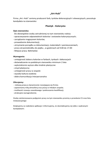 „Art-Hub” Firma „Art.-Hub” ceniony producent farb, tynków dekoracyjnych i elewacyjnych, poszukuje kandydata na stanowisko: Plastyk - Kolorysta Opis stanowiska: Do obowiązków osoby zatrudnionej na tym stanowisku należy: - opracowywanie odpowiednich kolorów i zestawów kolorystycznych; - zarządzanie magazynem kolorów; - prowadzenie dokumentacji; - utrzymanie porządku w dokumentacji, materiałach i pomieszczeniach; - praca od poniedziałku do piątku , w godzinach od 9.00 do 17.00 - Miejsce pracy: Bełchatów Wymagania: - umiejętność doboru kolorów w farbach, tynkach i dekoracjach - doświadczenie na podobnym stanowisku minimum 2 lata - wykształcenie wyższe albo średnie plastyczne - zmysł plastyczny - umiejętność pracy w zespole - wysoka kultura osobista - dobra komunikacja interpersonalna Oferujemy: - ciekawą pracę w dynamicznie rozwijającej się firmie; - zapewniamy miłą atmosferę oraz pracę w młodym zespole; - możliwość rozwoju zawodowego i podnoszenia kwalifikacji; - atrakcyjne wynagrodzenie; Osoby zainteresowane podjęciem pracy na tym stanowisku prosimy o przesłanie CV oraz listu motywacyjnego Dziękujemy za nadesłane aplikacje i informujemy, że skontaktujemy się tylko z wybranymi kandydatami.