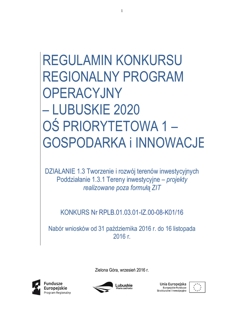 1 REGULAMIN KONKURSU REGIONALNY PROGRAM OPERACYJNY – LUBUSKIE 2020 OŚ PRIORYTETOWA 1 – GOSPODARKA i INNOWACJE DZIAŁANIE 1.3 Tworzenie i rozwój terenów inwestycyjnych Poddziałanie 1.3.1 Tereny inwestycyjne – projekty realizowane poza formułą ZIT KONKURS Nr RPLB.01.03.01-IZ.00-08-K01/16 Nabór wniosków od 31 października 2016 r. do 16 listopada 2016 r. Zielona Góra, sierpień 2016 Zielona Góra, wrzesień 2016 r. 2 Spis treści I. Informacje ogólne........................................................................................................................................ 3 II. Organizacja konkursu ................................................................................................................................ 4 1. Nazwa i adres właściwej instytucji .................................................................................................. 4 2. Przedmiot konkursu ........................................................................................................................ 4 3. Okres realizacji projektu ................................................................................................................. 6 4. Typy Beneficjentów......................................................................................................................... 6 5. Kwota przeznaczona na dofinansowanie projektów w konkursie.................................................... 7 6. Maksymalna wartość wydatków kwalifikowanych projektu ............................................................. 7 7. Maksymalny poziom dofinansowania projektu ................................................................................ 8 8. Projekty generujące dochód ........................................................................................................... 8 9. Termin składania wniosków o dofinansowanie projektu ................................................................. 9 10. Miejsce składania wniosków o dofinansowanie projektu ................................................................ 9 11. Forma składania wniosków o dofinansowanie projektu ................................................................ 10 12. Lista załączników wymaganych przez IZ RPO-L2020 .................................................................. 12 13. Przebieg konkursu ........................................................................................................................ 13 14. Ocena formalna ............................................................................................................................ 14 15. Ocena merytoryczna..................................................................................................................... 16 16. Wybór projektów do dofinansowania ............................................................................................ 17 17. Zabezpieczenie umowy ................................................................................................................ 18 18. Kryteria wyboru projektów wraz z podaniem ich znaczenia .......................................................... 18 19. Forma i sposób udzielania Wnioskodawcy wyjaśnień w kwestiach dotyczących konkursu .......... 18 20. Sposób podania do publicznej wiadomości wyników konkursu oraz informacje o sposobie postępowania z wnioskami o dofinansowanie po rozstrzygnięciu konkursu ................................. 19 21. Środki odwoławcze przysługujące Wnioskodawcy ....................................................................... 19 22. Anulowanie konkursu.................................................................................................................... 21 23. Wskaźniki monitorowania postępu rzeczowego w ramach projektu ............................................. 21 24. Kwalifikowalność wydatków .......................................................................................................... 23 25. Dokumenty strategiczne i branżowe ............................................................................................. 24 26. Wzór wniosku o dofinansowanie projektu ..................................................................................... 24 27. Wzór umowy o dofinansowanie/wzór Decyzji o przyznaniu dofinansowania ................................ 24 28. Załączniki do Regulaminu............................................................................................................. 24 3 I. Informacje ogólne 1. Regulamin w szczególności określa cel i zakres konkursu, zasady jego organizacji, warunki uczestnictwa, sposób wyboru projektów oraz pozostałe informacje niezbędne podczas przygotowywania wniosków o dofinansowanie realizacji projektu w ramach Regionalnego Programu Operacyjnego – Lubuskie 2020 Osi Priorytetowej 1 – Gospodarka i innowacje Działania 1.3 – Tworzenie i rozwój terenów inwestycyjnych, Poddziałanie 1.3.1 Tereny inwestycyjne – projekty realizowane poza formułą ZIT. 2. Regulamin oraz wszystkie niezbędne do złożenia na konkurs dokumenty są dostępne na stronie internetowej RPO – Lubuskie 2020: www.rpo.lubuskie.pl. 3. Stosownie do art. 50 ustawy z dnia 11 lipca 2014 r. o zasadach realizacji programów w zakresie polityki spójności finansowanych w perspektywie finansowej 2014-2020 (Dz. U. z 2016 r., poz. 217), zwanej dalej ustawą wdrożeniową, do postępowania w zakresie ubiegania się o dofinansowanie oraz udzielania dofinansowania na podstawie ustawy nie stosuje się przepisów ustawy z dnia 14 czerwca 1960 r. Kodeks postępowania administracyjnego, z wyjątkiem przepisów dotyczących wyłączenia pracowników organu, doręczeń i sposobu obliczania terminów. 4. W przypadku ukazania się nowych przepisów prawnych lub wytycznych Ministerstwa Rozwoju, Instytucja Organizująca Konkurs (pod warunkiem dochowania zgodności z przepisami określonymi w ustawie wdrożeniowej