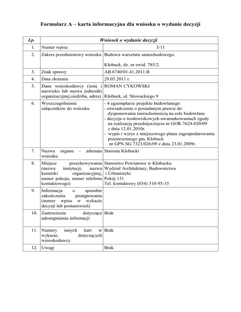 Formularz A – karta informacyjna dla wniosku o wydanie decyzji Wniosek o wydanie decyzji Lp. 1. Numer wpisu 3/11 2. Zakres przedmiotowy wniosku Budowa warsztatu samochodowego. Kłobuck, dz. nr ewid. 785/2. 3. Znak sprawy AB.6740/01.41.2011.B 4. Data złożenia 29.03.2011 r. 5. Dane wnioskodawcy (imię i ROMAN CYKOWSKI nazwisko lub nazwa jednostki organizacyjnej,siedziba, adres) Kłobuck, ul. Słowackiego 9 6. Wyszczególnienie załączników do wniosku 7. Nazwa organu wniosku 8. Miejsce przechowywania (nazwa instytucji, nazwa komórki organizacyjnej, numer pokoju, numer telefonu kontaktowego) 9. Informacja o sposobie zakończenia postępowania (numer wpisu w wykazie decyzji lub postanowień) - - 4 egzemplarze projektu budowlanego - oświadczenie o posiadanym prawie do dysponowania nieruchomością na cele budowlane - decyzja o środowiskowych uwarunkowaniach zgody na realizację przedsięwzięcia nr GOR.7624-020/09 z dnia 12.01.2010r. - wypis i wyrys z miejscowego planu zagospodarowania przestrzennego gm, Kłobuck nr GPN.SG.7323/026/09 z dnia 23.01.2009r. adresata Starosta Kłobucki Starostwo Powiatowe w Kłobucku Wydział Architektury, Budownictwa i Urbanistyki Pokój 131 Tel. kontaktowy (034) 310-95-35 10. Zastrzeżenia dotyczące Brak udostępniania informacji 11. Numery innych kart w Brak wykazie, dotyczących wnioskodawcy 12. Uwagi Brak