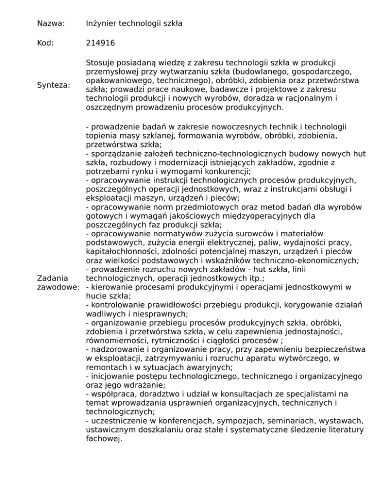 Nazwa: Inżynier technologii szkła Kod: 214916 Synteza: Stosuje