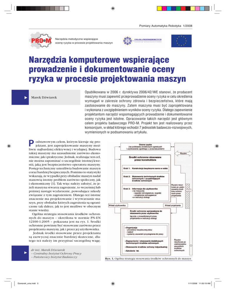 Pomiary Automatyka Robotyka 1/2008 Narzędzia metodyczne wspierające ocenę ryzyka w procesie projektowania maszyn Narzędzia komputerowe wspierające prowadzenie i dokumentowanie oceny ryzyka w procesie projektowania maszyn Marek Dźwiarek Opublikowana w 2006 r. dyrektywa 2006/42/WE stanowi, że producent maszyny musi zapewnić przeprowadzenie oceny ryzyka w celu określenia wymagań w zakresie ochrony zdrowia i bezpieczeństwa, które mają zastosowanie do maszyny. Zatem maszyna musi być zaprojektowana i wykonana z uwzględnieniem wyników oceny ryzyka. Dlatego zapewnienie projektantom narzędzi wspomagających prowadzenie i dokumentowanie oceny ryzyka jest istotne. Opracowanie takich narzędzi jest głównym celem projektu badawczego PRO-M. Projekt ten jest realizowany przez konsorcjum, w skład którego wchodzi 7 jednostek badawczo-rozwojowych, wymienionych w podsumowaniu artykułu. odstawowym celem, którym kieruje się projektant, jest zaprojektowanie maszyny możliwie najbardziej efektywnej i wydajnej. Budowa takiej maszyny ma uzasadnienie zarówno ekonomiczne, jak i praktyczne. Jednak, realizując ten cel, nie można zapominać o szczególnie istotnej kwestii, jaką jest bezpieczeństwo operatora maszyny. Postęp techniczny umożliwia budowanie maszyn coraz bardziej bezpiecznych. Pomimo to statystyki wskazują, że wypadki przy obsłudze maszyn nadal stanowią istotny problem zarówno społeczny, jak i ekonomiczny [1]. Tak więc należy założyć, że jeżeli maszyna stwarza zagrożenie, to wcześniej lub później nastąpi wydarzenie, powodujące szkody związane z tym zagrożeniem. Dlatego też istotne znaczenie ma projektowanie i wytwarzanie maszyn, przy obsłudze których zagrożenia są ograniczone tak dalece, jak to jest możliwe w obecnym stanie wiedzy. Ogólna strategia stosowania środków ochronnych do maszyn – określona w normie PN-EN 12100-1:2005 – pokazana jest na rys. 1. Środki ochronne powinny być stosowane zarówno przez projektanta maszyny, jak i przez jej użytkownika. Jednak środki stosowane przez projektanta są zazwyczaj znacznie bardziej skuteczne, dlatego też należy im przypisać szczególną wagę. dr inż. Marek Dźwiarek – Centralny Instytut Ochrony Pracy – Państwowy Instytut Badawczy Dzwiarek_unia.indd 5 Rys. 1. Ogólna strategia stosowania środków ochronnych do maszyn 1/11/2008 11:00:19 AM Pomiary Automatyka Robotyka 1/2008 Projektant maszyny, dobierając środki ochronne, powinien stosować następującą hierarchię postępowania: 1. Konstrukcja bezpieczna sama w sobie: przy formułowaniu założeń oraz projektowaniu maszyny należy w miarę możliwości dobierać materiały i rozwiązania techniczne stwarzające możliwie jak najmniej zagrożeń. 2. Stosowanie technicznych i uzupełniających środków ochronnych: zagrożenia, których nie dało się wyeliminować poprzez zastosowanie konstrukcji bezpiecznych samych w sobie, ogranicza się, stosując techniczne środki bezpieczeństwa (osłony, funkcje bezpieczeństwa itp.). 3. Informowanie o ryzyku resztkowym: wszystkie działania projektanta maszyny są ukierunkowane na wyeliminowanie ryzyka w możliwie jak największym stopniu. Jeśli jednak zastosowanie wszelkich zgodnych ze stanem wiedzy środków redukcji ryzyka nie wystarcza do jego wyeliminowania, to pozostanie ryzyko resztkowe (na rys. 1 oznaczone obszarem kratkowanym ukośnie), które może wyeliminować jedynie użytkownik maszyny. Użytkownik maszyny powinien być poinformowany o pozostającym ryzyku resztkowym za pomocą sygnałów ostrzegawczych oraz w „Instrukcji obsługi”. Widać więc, że niezwykle istotne jest właściwe uwzględnienie aspektów bezpieczeństwa przez projektanta maszyny. Dlatego też celowym jest podejmowanie wszelkich działań mogących wspierać projektanta w realizacji tego zadania. Podstawy prawne Podstawowe obowiązki producenta maszyny określone są w dyrektywie maszynowej 98/37/WE. W 2006 roku opublikowana została dyrektywa 2006/42/WE będąca nowelizacją dyrektywy 98/37/WE. Państwa członkowskie UE zobowiązane są do stosowania dyrektywy 2006/42/WE zamiast dyrektywy 98/37/WE od dn. 29 grudnia 2009 r. Tak więc projektanci maszyn powinni posługiwać się dyrektywą 2006/42/WE, gdyż maszyna teraz projektowana zostanie wprowadzona na rynek najprawdopodobniej już w czasie obowiązywania nowej dyrektywy maszynowej. Dyrektywa ta (Załącznik I, p. 1) wymaga: 1. Producent maszyny lub jego upoważniony przedstawiciel musi zapewnić przeprowadzenie oceny ryzyka, aby określić wymagania w zakresie ochrony zdrowia i bezpieczeństwa, które mają zastosowanie do maszyny; zatem maszyna musi być zaprojektowana i wykonana z uwzględnieniem wyników oceny ryzyka. Za pomocą iteracyjnego procesu oceny ryzyka i zmniejszania ryzyka, o którym mowa powyżej, producent lub jego upoważniony przedstawiciel: – określa ograniczenia dotyczące maszyny, w tym zamierzonego używania i możliwego do przewidzenia w uzasadniony sposób niewłaściwego jej użycia – określa zagrożenia, jakie może stwarzać maszyna i związane z tym niebezpieczne sytuacje – szacuje ryzyko, biorąc pod uwagę stopień możliwych obrażeń lub uszczerbku na zdrowiu i prawdopodobieństwo ich wystąpienia – ocenia ryzyko, mając na celu ustalenie czy wymagane jest zmniejszenie ryzyka, zgodnie z celem niniejszej dyrektywy – eliminuje zagrożenia lub zmniejsza ryzyko związane z takimi zagrożeniami poprzez zastosowanie środków ochronnych, zgodnie z hierarchią ważności ustanowioną w sekcji 1.1.2.b)*. Hierarchia określona w sekcji 1.1.2b)* jest analogiczna jak pokazana na rys. 1. Wymagania te znajdują także odzwierciedlenie w zakresie dokumentacji wymaganej od producenta maszyny. Dokumentacja ta, określona w Załączniku VII do dyrektywy, powinna zawierać, między innymi: — dokumentację oceny ryzyka przedstawiającą zastosowaną procedurę, zawierającą: i) wykaz zasadniczych wymagań w zakresie 