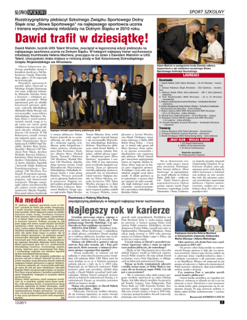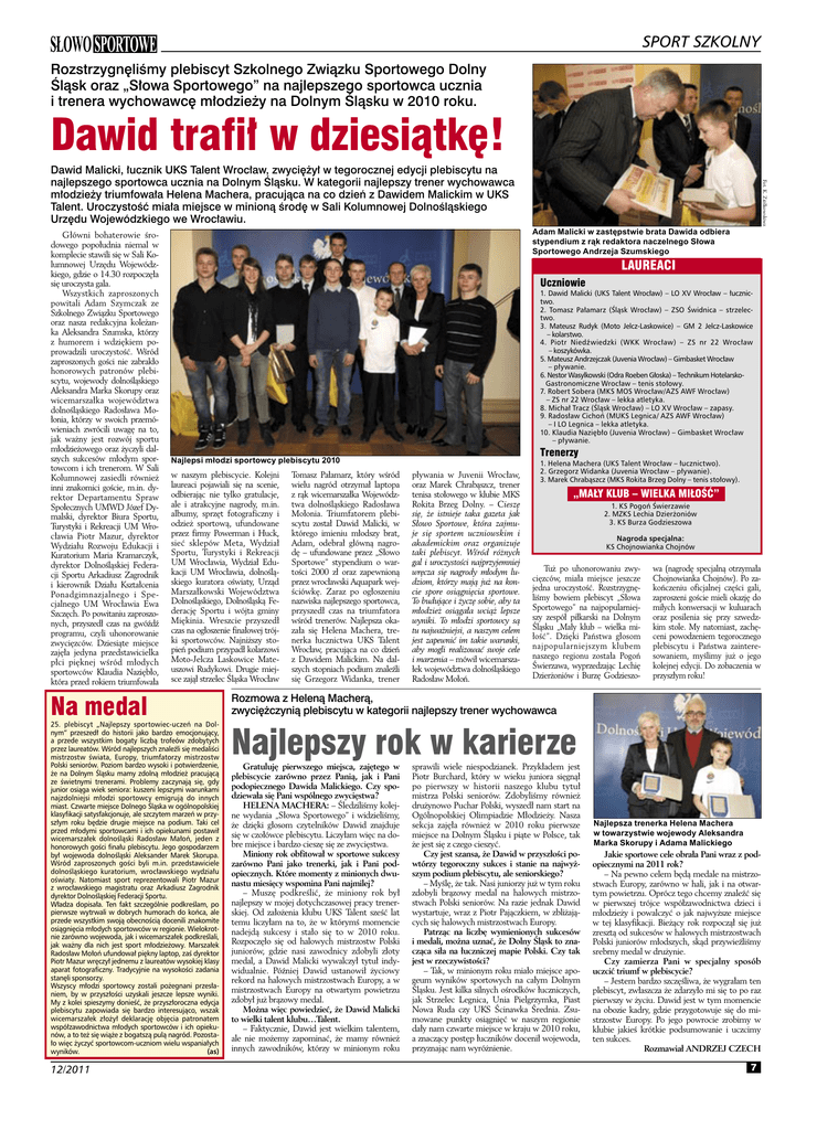 SPORT SZKOLNY Rozstrzygnęliśmy plebiscyt Szkolnego Związku Sportowego Dolny Śląsk oraz „Słowa Sportowego” na najlepszego sportowca ucznia i trenera wychowawcę młodzieży na Dolnym Śląsku w 2010 roku. Dawid trafił w dziesiątkę! Główni bohaterowie środowego popołudnia niemal w komplecie stawili się w Sali Kolumnowej Urzędu Wojewódzkiego, gdzie o 14.30 rozpoczęła się uroczysta gala. Wszystkich zaproszonych powitali Adam Szymczak ze Szkolnego Związku Sportowego oraz nasza redakcyjna koleżanka Aleksandra Szumska, którzy z humorem i wdziękiem poprowadzili uroczystość. Wśród zaproszonych gości nie zabrakło honorowych patronów plebiscytu, wojewody dolnośląskiego Aleksandra Marka Skorupy oraz wicemarszałka województwa dolnośląskiego Radosława Mołonia, którzy w swoich przemówieniach zwrócili uwagę na to, jak ważny jest rozwój sportu młodzieżowego oraz życzyli dalszych sukcesów młodym sportowcom i ich trenerom. W Sali Kolumnowej zasiedli również inni znakomici goście, m.in. dyrektor Departamentu Spraw Społecznych UMWD Józef Dymalski, dyrektor Biura Sportu, Turystyki i Rekreacji UM Wrocławia Piotr Mazur, dyrektor Wydziału Rozwoju Edukacji i Kuratorium Maria Kramarczyk, dyrektor Dolnośląskiej Federacji Sportu Arkadiusz Zagrodnik i kierownik Działu Kształcenia Ponadgimnazjalnego i Specjalnego UM Wrocławia Ewa Szczęch. Po powitaniu zaproszonych, przyszedł czas na gwóźdź programu, czyli uhonorowanie zwycięzców. Dziesiąte miejsce zajęła jedyna przedstawicielka płci pięknej wśród młodych sportowców Klaudia Naziębło, która przed rokiem triumfowała Na medal Adam Malicki w zastępstwie brata Dawida odbiera stypendium z rąk redaktora naczelnego Słowa Sportowego Andrzeja Szumskiego LAUREACI Uczniowie 1. Dawid Malicki (UKS Talent Wrocław) – LO XV Wrocław – łucznictwo. 2. Tomasz Pałamarz (Śląsk Wrocław) – ZSO Świdnica – strzelectwo. 3. Mateusz Rudyk (Moto Jelcz-Laskowice) – GM 2 Jelcz-Laskowice – kolarstwo. 4. Piotr Niedźwiedzki (WKK Wrocław) – ZS nr 22 Wrocław – koszykówka. 5. Mateusz Andrzejczak (Juvenia Wrocław) – Gimbasket Wrocław – pływanie. 6. Nestor Wasylkowski (Odra Roeben Głoska) – Technikum HotelarskoGastronomiczne Wrocław – tenis stołowy. 7. Robert Sobera (MKS MOS Wrocław/AZS AWF Wrocław) – ZS nr 22 Wrocław – lekka atletyka. 8. Michał Tracz (Śląsk Wrocław) – LO XV Wrocław – zapasy. 9. Radosław Cichoń (MUKS Legnica/ AZS AWF Wrocław) – I LO Legnica – lekka atletyka. 10. Klaudia Naziębło (Juvenia Wrocław) – Gimbasket Wrocław – pływanie. Trenerzy Najlepsi młodzi sportowcy plebiscytu 2010 w naszym plebiscycie. Kolejni laureaci pojawiali się na scenie, odbierając nie tylko gratulacje, ale i atrakcyjne nagrody, m.in. albumy, sprzęt fotograficzny i odzież sportową, ufundowane przez firmy Powerman i Huck, sieć sklepów Meta, Wydział Sportu, Turystyki i Rekreacji UM Wrocławia, Wydział Edukacji UM Wrocławia, dolnośląskiego kuratora oświaty, Urząd Marszałkowski Województwa Dolnośląskiego, Dolnośląską Federację Sportu i wójta gminy Miękinia. Wreszcie przyszedł czas na ogłoszenie finałowej trójki sportowców. Najniższy stopień podium przypadł kolarzowi Moto-Jelcza Laskowice Mateuszowi Rudykowi. Drugie miejsce zajął strzelec Śląska Wrocław 25. plebiscyt „Najlepszy sportowiec-uczeń na Dolnym” przeszedł do historii jako bardzo emocjonujący, a przede wszystkim bogaty liczbą trofeów zdobytych przez laureatów. Wśród najlepszych znaleźli się medaliści mistrzostw świata, Europy, triumfatorzy mistrzostw Polski seniorów. Poziom bardzo wysoki i potwierdzenie, że na Dolnym Śląsku mamy zdolną młodzież pracującą ze świetnymi trenerami. Problemy zaczynają się, gdy junior osiąga wiek seniora: kuszeni lepszymi warunkami najzdolniejsi młodzi sportowcy emigrują do innych miast. Czwarte miejsce Dolnego Śląska w ogólnopolskiej klasyfikacji satysfakcjonuje, ale szczytem marzeń w przyszłym roku będzie drugie miejsce na podium. Taki cel przed młodymi sportowcami i ich opiekunami postawił wicemarszałek dolnośląski Radosław Małoń, jeden z honorowych gości finału plebiscytu. Jego gospodarzem był wojewoda dolnośląski Aleksander Marek Skorupa. Wśród zaproszonych gości byli m.in. przedstawiciele dolnośląskiego kuratorium, wrocławskiego wydziału oświaty. Natomiast sport reprezentowali Piotr Mazur z wrocławskiego magistratu oraz Arkadiusz Zagrodnik dyrektor Dolnośląskiej Federacji Sportu. Władza dopisała. Ten fakt szczególnie podkreślam, po pierwsze wytrwali w dobrych humorach do końca, ale przede wszystkim swoją obecnością docenili znakomite osiągnięcia młodych sportowców w regionie. Wielokrotnie zarówno wojewoda, jak i wicemarszałek podkreślali, jak ważny dla nich jest sport młodzieżowy. Marszałek Radosław Mołoń ufundował piękny laptop, zaś dyrektor Piotr Mazur wręczył jednemu z laureatów wysokiej klasy aparat fotograficzny. Tradycyjnie na wysokości zadania stanęli sponsorzy. Wszyscy młodzi sportowcy zostali pożegnani przesłaniem, by w przyszłości uzyskali jeszcze lepsze wyniki. My z kolei spieszymy donieść, że przyszłoroczna edycja plebiscytu zapowiada się bardzo interesująco, wszak wicemarszałek złożył deklarację objęcia patronatem współzawodnictwa młodych sportowców i ich opiekunów, a to też się wiąże z bogatszą pulą nagród. Pozostało więc życzyć sportowcom-uczniom wielu wspaniałych wyników. (as) 12/2011 Fot. K. Ziółkowskiwz Dawid Malicki, łucznik UKS Talent Wrocław, zwyciężył w tegorocznej edycji plebiscytu na najlepszego sportowca ucznia na Dolnym Śląsku. W kategorii najlepszy trener wychowawca młodzieży triumfowała Helena Machera, pracująca na co dzień z Dawidem Malickim w UKS Talent. Uroczystość miała miejsce w minioną środę w Sali Kolumnowej Dolnośląskiego Urzędu Wojewódzkiego we Wrocławiu.