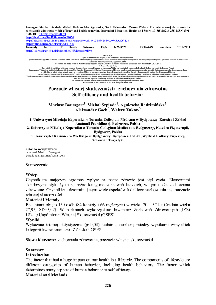 Baumgart Mariusz, Szpinda Michał, Radzimińska Agnieszka, Goch Aleksander, Zukow Walery. Poczucie własnej skuteczności a zachowania zdrowotne = Self-efficacy and health behawior. Journal of Education, Health and Sport. 2015;5(8):226-235. ISSN 23918306. DOI 10.5281/zenodo.28074 http://dx.doi.org/10.5281/zenodo.28074 http://ojs.ukw.edu.pl/index.php/johs/article/view/2015%3B5%288%29%3A226-235 https://pbn.nauka.gov.pl/works/607775 Formerly Journal of Health Sciences. ISSN 1429-9623 / 2300-665X. Archives 2011–2014 http://journal.rsw.edu.pl/index.php/JHS/issue/archive Deklaracja. Specyfika i zawartość merytoryczna czasopisma nie ulega zmianie. Zgodnie z informacją MNiSW z dnia 2 czerwca 2014 r., że w roku 2014 nie będzie przeprowadzana ocena czasopism naukowych; czasopismo o zmienionym tytule otrzymuje tyle samo punktów co na wykazie czasopism naukowych z dnia 31 grudnia 2014 r. The journal has had 5 points in Ministry of Science and Higher Education of Poland parametric evaluation. Part B item 1089. (31.12.2014). © The Author (s) 2015; This article is published with open access at Licensee Open Journal Systems of Kazimierz Wielki University in Bydgoszcz, Poland and Radom University in Radom, Poland Open Access. This article is distributed under the terms of the Creative Commons Attribution Noncommercial License which permits any noncommercial use, distribution, and reproduction in any medium, provided the original author(s) and source are credited. This is an open access article licensed under the terms of the Creative Commons Attribution Non Commercial License (http://creativecommons.org/licenses/by-nc/3.0/) which permits unrestricted, non commercial use, distribution and reproduction in any medium, provided the work is properly cited. This is an open access article licensed under the terms of the Creative Commons Attribution Non Commercial License (http://creativecommons.org/licenses/by-nc/3.0/) which permits unrestricted, non commercial use, distribution and reproduction in any medium, provided the work is properly cited. The authors declare that there is no conflict of interests regarding the publication of this paper. Received: 05.06.2015. Revised 15.07.2015. Accepted: 12.08.2015. Poczucie własnej skuteczności a zachowania zdrowotne Self-efficacy and health behavior Mariusz Baumgart1, Michał Szpinda1, Agnieszka Radzimińska2, Aleksander Goch2, Walery Zukow3 1. Uniwersytet Mikołaja Kopernika w Toruniu, Collegium Medicum w Bydgoszczy, Katedra i Zakład Anatomii Prawidłowej, Bydgoszcz, Polska 2. Uniwersytet Mikołaja Kopernika w Toruniu Collegium Medicum w Bydgoszczy, Katedra Fizjoterapii, Bydgoszcz, Polska 3. Uniwersytet Kazimierza Wielkiego w Bydgoszczy, Bydgoszcz, Polska, Wydział Kultury Fizycznej, Zdrowia i Turystyki Autor do korespondencji dr. n.med. Mariusz Baumgart e-mail: [email protected] Streszczenie Wstęp Czynnikiem mającym ogromny wpływ na nasze zdrowie jest styl życia. Elementami składowymi stylu życia są różne kategorie zachowań ludzkich, w tym także zachowania zdrowotne. Czynnikiem determinującym wiele aspektów ludzkiego zachowania jest poczucie własnej skuteczności. Materiał i Metody Badaniami objęto 150 osób (84 kobiety i 66 mężczyzn) w wieku 20 – 37 lat (średnia wieku 27,95, SD=5,02). W badaniach wykorzystano Inwentarz Zachowań Zdrowotnych (IZZ) i Skalę Uogólnionej Własnej Skuteczności (GSES). Wyniki Wykazano istotną statystycznie (p<0,05) dodatnią korelację między wynikami wszystkich kategorii kwestionariusza IZZ i skali GSES. Słowa kluczowe: zachowania zdrowotne, poczucie własnej skuteczności. Summary Introduction The factor that had a huge impact on our health is a lifestyle. The components of lifestyle are different categories of human behavior, including health behaviors. The factor which determines many aspects of human behavior is self-efficacy. Material and Methods 226 The study involved 150 people (84 women and 66 men) aged 20 - 37 years (mean age 27.95, SD = 5.02). The study used the Health Behaviour Inventory and Generalized Self Efficacy Scale. Results It has been shown statistically significant (p <0.05) positive correlation between the results of all categories IZZ questionnaire and GSES. Key words: health behavior, self-efficacy. Wstęp Czynnikiem mającym ogromny wpływ na nasze zdrowie jest styl życia. Elementami składowymi stylu życia są różne kategorie zachowań ludzkich, w tym także zachowania zdrowotne, rozumiane jako „wszelkie przejawiane przez ludzi formy zachowań, związanych ze sferą zdrowia, czyli zachowań, które w świetle współczesnej wiedzy medycznej zwykle wywołują określone (pozytywne lub negatywne) skutki zdrowotne” [1,2]. Czynnikiem determinującym wiele aspektów ludzkiego zachowania, w tym zachowania zdrowotnego jest poczucie własnej skuteczności [3]. Albert Bandura przekonanie o własnej skuteczności zalicza do „podstawowych przekonań, na podstawie których kształtują się wszystkie pozostałe przekonania, obejmujące pełne funkcjonowanie człowieka” [3]. Bandura utrzymuje, że „oczekiwania dotyczące własnej skuteczności są głównym wyznacznikiem wyboru zachowania, ilości włożonego wysiłku i siły podtrzymania zachowania. Im silniejsze poczucie własnej skuteczności i związane z nim oczekiwanie, tym większe przekonanie o możliwości osiągnięcia przez siebie dobrych wyników, trwałych skutków oraz konsekwentnego – mimo przeszkód – podtrzymywania działań prowadzących do celu” [3]. Ludzie, którzy skutecznie radzą sobie z trudnymi zadaniami. nabywają doświadczeń, które zwrotnie wzmacniają ich poczucie własnej skuteczności [4,5]. Własna skuteczność może wpływać na zachowanie zdrowotne bezpośrednio, oraz pośrednio poprzez działanie na inne determinanty zachowania [6]. Im silniejsze poczucie własnej skuteczności, tym ludzie chętniej podejmują zachowania zdrowotne, mają silne przekonanie, że cele są możliwe o