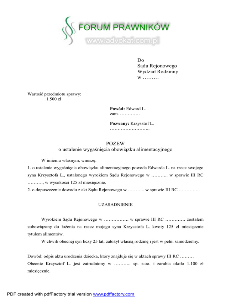 Do Sądu Rejonowego Wydział Rodzinny w ……… Wartość przedmiotu sprawy: 1.500 zł Powód: Edward L. zam. …………. Pozwany: Krzysztof L. …………………….. POZEW o ustalenie wygaśnięcia obowiązku alimentacyjnego W imieniu własnym, wnoszę: 1. o ustalenie wygaśnięcia obowiązku alimentacyjnego powoda Edwarda L. na rzecz swojego syna Krzysztofa L., ustalonego wyrokiem Sądu Rejonowego w ……….. w sprawie III RC ………., w wysokości 125 zł miesięcznie. 2. o dopuszczenie dowodu z akt Sądu Rejonowego w ……….. w sprawie III RC ………….. UZASADNIENIE Wyrokiem Sądu Rejonowego w ……………. w sprawie III RC …………. zostałem zobowiązany do łożenia na rzecz mojego syna Krzysztofa L. kwoty 125 zł miesięcznie tytułem alimentów. W chwili obecnej syn liczy 25 lat, założył własną rodzinę i jest w pełni samodzielny. Dowód: odpis aktu urodzenia dziecka, który znajduje się w aktach sprawy III RC ……… Obecnie Krzysztof L. jest zatrudniony w ……….. sp. z.oo. i zarabia około 1.100 zł miesięcznie. PDF created with pdfFactory trial version www.pdffactory.com W tej sytuacji, w oparciu o art. 133 § 1 krio pozew o ustalenie wygaśnięcia obowiązku alimentacyjnego jest w pełni uzasadniony. Edward L. PDF created with pdfFactory trial version www.pdffactory.com