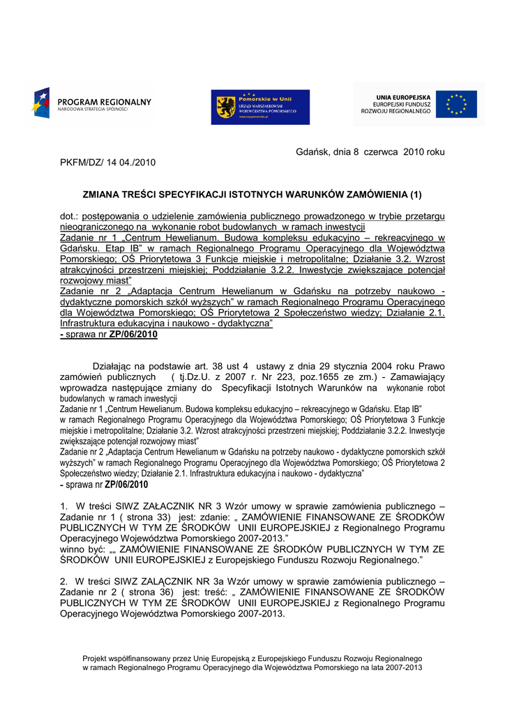 Gdańsk, dnia 8 czerwca 2010 roku PKFM/DZ/ 14 04./2010 ZMIANA TREŚCI SPECYFIKACJI ISTOTNYCH WARUNKÓW ZAMÓWIENIA (1) dot.: postępowania o udzielenie zamówienia publicznego prowadzonego w trybie przetargu nieograniczonego na wykonanie robot budowlanych w ramach inwestycji Zadanie nr 1 „Centrum Hewelianum. Budowa kompleksu edukacyjno – rekreacyjnego w Gdańsku. Etap IB” w ramach Regionalnego Programu Operacyjnego dla Województwa Pomorskiego; OŚ Priorytetowa 3 Funkcje miejskie i metropolitalne; Działanie 3.2. Wzrost atrakcyjności przestrzeni miejskiej; Poddziałanie 3.2.2. Inwestycje zwiększające potencjał rozwojowy miast” Zadanie nr 2 „Adaptacja Centrum Hewelianum w Gdańsku na potrzeby naukowo dydaktyczne pomorskich szkół wyŜszych” w ramach Regionalnego Programu Operacyjnego dla Województwa Pomorskiego; OŚ Priorytetowa 2 Społeczeństwo wiedzy; Działanie 2.1. Infrastruktura edukacyjna i naukowo - dydaktyczna” - sprawa nr ZP/06/2010 Działając na podstawie art. 38 ust 4 ustawy z dnia 29 stycznia 2004 roku Prawo zamówień publicznych ( tj.Dz.U. z 2007 r. Nr 223, poz.1655 ze zm.) - Zamawiający wprowadza następujące zmiany do Specyfikacji Istotnych Warunków na wykonanie robot budowlanych w ramach inwestycji Zadanie nr 1 „Centrum Hewelianum. Budowa kompleksu edukacyjno – rekreacyjnego w Gdańsku. Etap IB” w ramach Regionalnego Programu Operacyjnego dla Województwa Pomorskiego; OŚ Priorytetowa 3 Funkcje miejskie i metropolitalne; Działanie 3.2. Wzrost atrakcyjności przestrzeni miejskiej; Poddziałanie 3.2.2. Inwestycje zwiększające potencjał rozwojowy miast” Zadanie nr 2 „Adaptacja Centrum Hewelianum w Gdańsku na potrzeby naukowo - dydaktyczne pomorskich szkół wyŜszych” w ramach Regionalnego Programu Operacyjnego dla Województwa Pomorskiego; OŚ Priorytetowa 2 Społeczeństwo wiedzy; Działanie 2.1. Infrastruktura edukacyjna i naukowo - dydaktyczna” - sprawa nr ZP/06/2010 1. W treści SIWZ ZAŁACZNIK NR 3 Wzór umowy w sprawie zamówienia publicznego – Zadanie nr 1 ( strona 33) jest: zdanie: „ ZAMÓWIENIE FINANSOWANE ZE ŚRODKÓW PUBLICZNYCH W TYM ZE ŚRODKÓW UNII EUROPEJSKIEJ z Regionalnego Programu Operacyjnego Województwa Pomorskiego 2007-2013.” winno być: „„ ZAMÓWIENIE FINANSOWANE ZE ŚRODKÓW PUBLICZNYCH W TYM ZE ŚRODKÓW UNII EUROPEJSKIEJ z Europejskiego Funduszu Rozwoju Regionalnego.” 2. W treści SIWZ ZALĄCZNIK NR 3a Wzór umowy w sprawie zamówienia publicznego – Zadanie nr 2 ( strona 36) jest: treść: „ ZAMÓWIENIE FINANSOWANE ZE ŚRODKÓW PUBLICZNYCH W TYM ZE ŚRODKÓW UNII EUROPEJSKIEJ z Regionalnego Programu Operacyjnego Województwa Pomorskiego 2007-2013. Projekt współfinansowany przez Unię Europejską z Europejskiego Funduszu Rozwoju Regionalnego w ramach Regionalnego Programu Operacyjnego dla Województwa Pomorskiego na lata 2007-2013 Roboty budowlane w ramach inwestycji Zadanie nr 1 „Centrum Hewelianum. Budowa kompleksu edukacyjno – rekreacyjnego w Gdańsku. Etap IB” w ramach Regionalnego Programu Operacyjnego dla Województwa Pomorskiego; OŚ Priorytetowa 3 Funkcje miejskie i metropolitalne; Działanie 3.2. Wzrost atrakcyjności przestrzeni miejskiej; Poddziałanie 3.2.2. Inwestycje zwiększające potencjał rozwojowy miast” Zadanie nr 2 „Adaptacja Centrum Hewelianum w Gdańsku na potrzeby naukowo dydaktyczne pomorskich szkół wyŜszych” w ramach Regionalnego Programu Operacyjnego dla Województwa Pomorskiego; OŚ Priorytetowa 2 Społeczeństwo wiedzy; Działanie 2.1. Infrastruktura edukacyjna i naukowo - dydaktyczna”1” winno być: „„ ZAMÓWIENIE FINANSOWANE ZE ŚRODKÓW PUBLICZNYCH W TYM ZE ŚRODKÓW UNII EUROPEJSKIEJ z Europejskiego Funduszu Rozwoju Regionalnego.” Roboty budowlane w ramach inwestycji Zadanie nr 2 „Adaptacja Centrum Hewelianum w Gdańsku na potrzeby naukowo dydaktyczne pomorskich szkół wyŜszych” w ramach Regionalnego Programu Operacyjnego dla Województwa Pomorskiego; OŚ Priorytetowa 2 Społeczeństwo wiedzy; Działanie 2.1. Infrastruktura edukacyjna i naukowo - dydaktyczna” 3. Do treści SIWZ dodaje się treść załącznika „n” wymienionego w treści pkt.2 Wzoru umowy ZAŁĄCZNIK NR 3 strona 34 i Załącznik nr 3a strona 37 (treść Załącznika „n” Karta gwarancyjna .w załączeniu). 4. Pozostała treść Specyfikacji Istotnych Warunków Zamówienia - nie zmienia się. z powaŜaniem Przemysław Guzow Dyrektor Projekt współfinansowany przez Unię Europejską z Europejskiego Funduszu Rozwoju Regionalnego w ramach Regionalnego Programu Operacyjnego dla Województwa Pomorskiego na lata 2007-2013 Załącznik „n” Karta gwarancyjnap FORMULARZ ZABEZPIECZENIA WYKONANIA – GWARANCJI NA śĄDANIE Krótki opis Kontraktu:……………………………. Nazwa i adres Beneficjenta:……………………..(którego Zamawiającym) Kontrakt nazywa poinformowani, Zostaliśmy Ŝe………………………………………………………………………… „Mocodawca” jest waszym wykonawcą na mocy tego Kontraktu, który wymaga od niego uzyskania gwarancji wykonania. Na Ŝądanie mocodawcy my, (nazwa banku)…………………………………….. zobowiązujemy się niniejszym nieodwołalnie zapłacić wam, Beneficjentowi/Zamawiającemu kaŜdą kwotę lub kwoty nie przekraczającej łącznie kwoty……………………………….(„kwoty gwarancji”, słownie:………………………………………) po otrzymaniu od was pisemnego Ŝądania, stwierdzającego: (a) śe Mocodawca uchybił wypełnieniu swoich obowiązków objętych Kontraktem, oraz (b) Przedmiot uchybienia Mocodawcy. [W następstwie otrzymania przez nas potwierdzonej kopii świadectwa przejęcia dla całości robót na mocy rozdziału 10 Warunków kontraktowych, ta gwarantowana kwota będzie zmniejszona o ….%. W przypadku otrzymania przez nas takiego świadectwa i odpowiednim zmniejszeniu gwarantowanej kwoty zostaniecie niezwłocznie przez nas poi