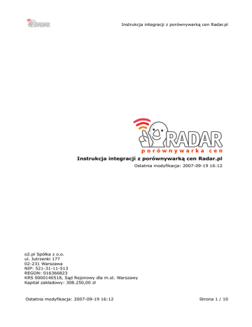 Instrukcja integracji z porównywarką cen Radar.pl Instrukcja integracji z porównywarką cen Radar.pl Ostatnia modyfikacja: 2007-09-19 16:12 o2.pl Spółka z o.o. ul. Jutrzenki 177 02-231 Warszawa NIP: 521-31-11-513 REGON: 016366823 KRS 0000140518, Sąd Rejonowy dla m.st. Warszawy Kapitał zakładowy: 308.250,00 zł Ostatnia modyfikacja: 2007-09-19 16:12 Strona 1 / 10 Instrukcja integracji z porównywarką cen Radar.pl Spis treści: I. Informacje ogólne 1. Zasady funkcjonowania systemu 2. Istniejące rozwiązania sklepowe 3. Samodzielna integracja z systemem Radar.pl II. Specyfikacja techniczna protokołu Radar XML 1. Struktura przykładowego pliku XML 2. Opis i specyfikacja dostępnych pól w pliku XML 3. Najczęstsze błedy popełniane podczas tworzenia plików XML 4. Uaktualnianie danych znajdujących się w bazie produktów 5. Kodowanie znaków znajdujących się w plikach XML III. Informacje dodatkowe 1. Mapa kategorii systemu Radar.pl w formacie XML Ostatnia modyfikacja: 2007-09-19 16:12 Strona 2 / 10 Instrukcja integracji z porównywarką cen Radar.pl 1. Informacje ogólne Zasady funkcjonowania systemu Podczas tworzenia porównywarki cen Radar.pl naszym przyświecał nam jeden cel – stworzenie systemu, który będzie wymagał jak najmniejszego nakładu ludzkiej pracy, a co za tym idzie, skrócenie czasu oczekiwania na wprowadzenie nowych klientów do bazy danych. Dzięki temu jesteśmy pierwszym na rynku serwisem, w którym czas dodania nowych ofert od momentu rejestracji nie przekracza dwóch dni! Wszystko za sprawą wyspecjalizowanego systemu, który podczas działania potrafi trafnie decydować o powiązaniach kategorii klienta z naszymi. Bez jakiejkolwiek ingerencji ze strony człowieka! Zasada działania jest bardzo prosta: – użytkownik wypełnia poprawnie formularz rejestracyjny dostępny pod adresem http://www.radar.pl/Rejestracja a następnie aktywuje założone konto, klikając na link aktywacyjny przesłany na adres e-mail podany podczas rejestracji, – odrazu po aktywacji konta, użytkownik otrzymuje dostęp do Panelu Sprzedawcy znajdującym się pod adresem http://www.radar.pl/VN7N6V2/. Od tego momentu ma on pełny dostęp do informacji o własnej firmie oraz funkcjonujących w jej ramach sklepach internetowych. – Po zalogowaniu się do Panelu Sprzedawcy, użytkownik może przystąpić do dodawania nieograniczonej ilości nowych sklepów! Aby oferty znajdujące się w sklepie użytkownika były widoczne, musi on udostępnić swoją ofertę w formacie Radar XML szczegółowo opisanym w dalszej części tego dokumentu. Bardzo ważnym jest, aby oferta sklepu udostępniona była publicznie oraz – w przypadku korzystania z własnych rozwiązań – aby umieszczony w niej dane dostępne były w sposób ciągły, tj. aby połączenie z serwerem WWW nie podlegało kontroli ze strony oprogramowania typu firewall. W przypadku specyficznych rozwiązań, prosimy o kontakt z naszymi specjalistami pod adresem [email protected]. Po pierwszej udanej integracji z bazą danych oraz wstępnym przypisaniu kategorii przez nasz system, nasi specjaliści rozpoczynają tworzenie powiązań kategorii pomiędzy sklepem klienta a kategoriami znajdującymi się w naszej bazie. Dodatkowo – w przypadku błędnego przypisania kategorii przez system, moderatorzy tworzą nowe, poprawne powiązania. Szczegółowe informacje na temat powiązań widoczne są na bieżąco w Panelu Sprzedawcy. W przypadku jakichkolwiek uwag bądź sugestii, prosimy o kontakt z naszymi specjalistami pod adresem [email protected]. Ostatnia modyfikacja: 2007-09-19 16:12 Strona 3 / 10 Instrukcja integracji z porównywarką cen Radar.pl Istniejące rozwiązania sklepowe W celu przyspieszenia procesu integracji, użytkownicy korzystający z gotowych rozwiązań sklepowych mogą użyć istniejących i sprawdzonych rozwiązań, które automatyzują dodawanie produktów do naszej bazy danych. Współpracujemy z następującymi dostawcami oprogramowania sklepowego: ■ GoShop.pl ■ IAI-System.com ■ KQS.pl ■ Netcart.pl ■ SOTE.pl ■ Triger.com.pl Jeżeli jednak jesteś użytkownikiem platformy osCommerce, w Panelu Sprzedawcy systemu Radar.pl umieściliśmy opcję dedykowaną temu rozwiązaniu: Rys 1.1: Panel sprzedawcy, pozycja “Integracja z systemem”. Wybierając pozycję “Radar XML – wtyczka osCommerce” otrzymasz możliwość pobrania skryptu, generującego poprawny plik XML z ofertą sklepu korzystającego z platformy osCommerce. Wszelkie instrukcje dotyczące instalacji oraz konfiguracji wtyczki dołączone są do pliku pomocy znajdującego się w archiwum ZIP wraz z kodem źródłowym wtyczki. Samodzielna integracja z systemem Radar.pl Dla wszystkich zaawansowanych użytkowników, pod adresem http://www.radar.pl/Integracja przygotowaliśmy przykładowy skrypt PHP generujący poprawny plik XML z ofertą sklepu bez względu na zastosowaną budowę bazy danych. Staraliśmy się opisać kod źródłowy wspomnianego skryptu tak, aby każdy bez większych problemów poradził sobie z jego personalizacją. W przypadku jakichkolwiek uwag, sugestii, bądź problemów prosimy o kontakt z naszymi specjalistami pod adresem [email protected]. Ostatnia modyfikacja: 2007-09-19 16:12 Strona 4 / 10 Instrukcja integracji z porównywarką cen Radar.pl 2. Specyfikacja techniczna protokołu Radar XML Struktura przykładowego pliku XML Poniższy plik XML zawiera dwie przykładowe oferty, zawierające dane które z pewnością zostaną poprawnie dodane do systemu Radar.pl: <?xml version="1.0" encoding="UTF-8"?> <radar wersja="1.0"> <oferta> <produkt> <grupa1> <nazwa><![CDATA[F.E.A.R.]]></nazwa> <producent><![CDATA[CD PROJEKT]]></producent> <opis><![CDATA[F.E.A.R. to doskonałe połączenie gry akcji z intrygującą fabułą rodem z najpopularniejszych azjatyckich horrorów(...)]]> </opis> <id>1234</id> <url>http://sklep.pl/oferta1234.html</url> <foto>http://sklep.pl/zdjecia/1234.jpg</foto> <kategoria> Gry i Konsole / Ko