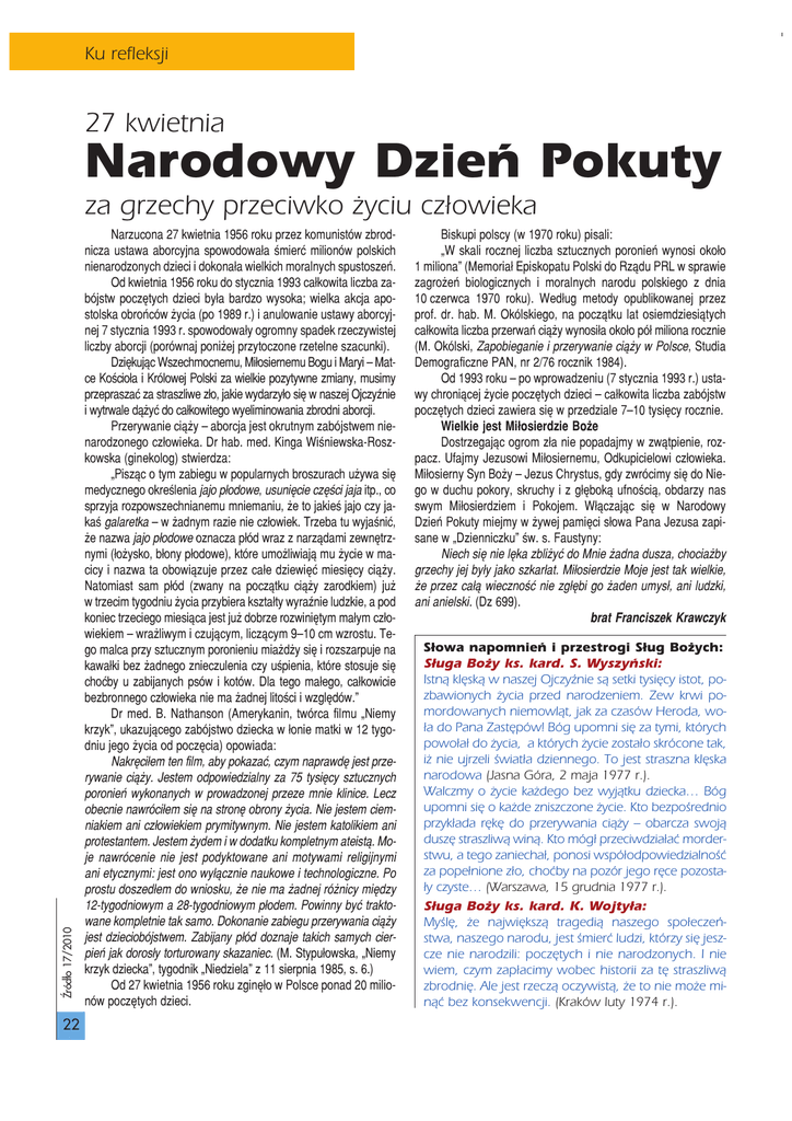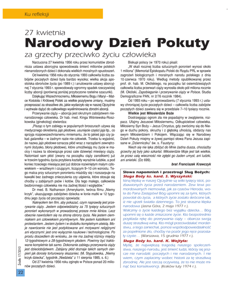 Ku refleksji 27 kwietnia Narodowy Dzień Pokuty Źródło 17/2010 za grzechy przeciwko życiu człowieka 22 Narzucona 27 kwietnia 1956 roku przez komunistów zbrod− nicza ustawa aborcyjna spowodowała śmierć milionów polskich nienarodzonych dzieci i dokonała wielkich moralnych spustoszeń. Od kwietnia 1956 roku do stycznia 1993 całkowita liczba za− bójstw poczętych dzieci była bardzo wysoka; wielka akcja apo− stolska obrońców życia (po 1989 r.) i anulowanie ustawy aborcyj− nej 7 stycznia 1993 r. spowodowały ogromny spadek rzeczywistej liczby aborcji (porównaj poniżej przytoczone rzetelne szacunki). Dziękując Wszechmocnemu, Miłosiernemu Bogu i Maryi – Mat− ce Kościoła i Królowej Polski za wielkie pozytywne zmiany, musimy przepraszać za straszliwe zło, jakie wydarzyło się w naszej Ojczyźnie i wytrwale dążyć do całkowitego wyeliminowania zbrodni aborcji. Przerywanie ciąży – aborcja jest okrutnym zabójstwem nie− narodzonego człowieka. Dr hab. med. Kinga Wiśniewska−Rosz− kowska (ginekolog) stwierdza: „Pisząc o tym zabiegu w popularnych broszurach używa się medycznego określenia jajo płodowe, usunięcie części jaja itp., co sprzyja rozpowszechnianemu mniemaniu, że to jakieś jajo czy ja− kaś galaretka – w żadnym razie nie człowiek. Trzeba tu wyjaśnić, że nazwa jajo płodowe oznacza płód wraz z narządami zewnętrz− nymi (łożysko, błony płodowe), które umożliwiają mu życie w ma− cicy i nazwa ta obowiązuje przez całe dziewięć miesięcy ciąży. Natomiast sam płód (zwany na początku ciąży zarodkiem) już w trzecim tygodniu życia przybiera kształty wyraźnie ludzkie, a pod koniec trzeciego miesiąca jest już dobrze rozwiniętym małym czło− wiekiem – wrażliwym i czującym, liczącym 9–10 cm wzrostu. Te− go malca przy sztucznym poronieniu miażdży się i rozszarpuje na kawałki bez żadnego znieczulenia czy uśpienia, które stosuje się choćby u zabijanych psów i kotów. Dla tego małego, całkowicie bezbronnego człowieka nie ma żadnej litości i względów.” Dr med. B. Nathanson (Amerykanin, twórca filmu „Niemy krzyk”, ukazującego zabójstwo dziecka w łonie matki w 12 tygo− dniu jego życia od poczęcia) opowiada: Nakręciłem ten film, aby pokazać, czym naprawdę jest prze− rywanie ciąży. Jestem odpowiedzialny za 75 tysięcy sztucznych poronień wykonanych w prowadzonej przeze mnie klinice. Lecz obecnie nawróciłem się na stronę obrony życia. Nie jestem ciem− niakiem ani człowiekiem prymitywnym. Nie jestem katolikiem ani protestantem. Jestem żydem i w dodatku kompletnym ateistą. Mo− je nawrócenie nie jest podyktowane ani motywami religijnymi ani etycznymi: jest ono wyłącznie naukowe i technologiczne. Po prostu doszedłem do wniosku, że nie ma żadnej różnicy między 12−tygodniowym a 28−tygodniowym płodem. Powinny być trakto− wane kompletnie tak samo. Dokonanie zabiegu przerywania ciąży jest dzieciobójstwem. Zabijany płód doznaje takich samych cier− pień jak dorosły torturowany skazaniec. (M. Stypułowska, „Niemy krzyk dziecka”, tygodnik „Niedziela” z 11 sierpnia 1985, s. 6.) Od 27 kwietnia 1956 roku zginęło w Polsce ponad 20 milio− nów poczętych dzieci. Biskupi polscy (w 1970 roku) pisali: „W skali rocznej liczba sztucznych poronień wynosi około 1 miliona” (Memoriał Episkopatu Polski do Rządu PRL w sprawie zagrożeń biologicznych i moralnych narodu polskiego z dnia 10 czerwca 1970 roku). Według metody opublikowanej przez prof. dr. hab. M. Okólskiego, na początku lat osiemdziesiątych całkowita liczba przerwań ciąży wynosiła około pół miliona rocznie (M. Okólski, Zapobieganie i przerywanie ciąży w Polsce, Studia Demograficzne PAN, nr 2/76 rocznik 1984). Od 1993 roku – po wprowadzeniu (7 stycznia 1993 r.) usta− wy chroniącej życie poczętych dzieci – całkowita liczba zabójstw poczętych dzieci zawiera się w przedziale 7–10 tysięcy rocznie. Wielkie jest Miłosierdzie Boże Dostrzegając ogrom zła nie popadajmy w zwątpienie, roz− pacz. Ufajmy Jezusowi Miłosiernemu, Odkupicielowi człowieka. Miłosierny Syn Boży – Jezus Chrystus, gdy zwrócimy się do Nie− go w duchu pokory, skruchy i z głęboką ufnością, obdarzy nas swym Miłosierdziem i Pokojem. Włączając się w Narodowy Dzień Pokuty miejmy w żywej pamięci słowa Pana Jezusa zapi− sane w „Dzienniczku” św. s. Faustyny: Niech się nie lęka zbliżyć do Mnie żadna dusza, chociażby grzechy jej były jako szkarłat. Miłosierdzie Moje jest tak wielkie, że przez całą wieczność nie zgłębi go żaden umysł, ani ludzki, ani anielski. (Dz 699). brat Franciszek Krawczyk Słowa napomnień i przestrogi Sług Bożych: Sługa Boży ks. kard. S. Wyszyński: Istną klęską w naszej Ojczyźnie są setki tysięcy istot, po− zbawionych życia przed narodzeniem. Zew krwi po− mordowanych niemowląt, jak za czasów Heroda, wo− ła do Pana Zastępów! Bóg upomni się za tymi, których powołał do życia, a których życie zostało skrócone tak, iż nie ujrzeli światła dziennego. To jest straszna klęska narodowa (Jasna Góra, 2 maja 1977 r.). Walczmy o życie każdego bez wyjątku dziecka… Bóg upomni się o każde zniszczone życie. Kto bezpośrednio przykłada rękę do przerywania ciąży – obarcza swoją duszę straszliwą winą. Kto mógł przeciwdziałać morder− stwu, a tego zaniechał, ponosi współodpowiedzialność za popełnione zło, choćby na pozór jego ręce pozosta− ły czyste… (Warszawa, 15 grudnia 1977 r.). Sługa Boży ks. kard. K. Wojtyła: Myślę, że największą tragedią naszego społeczeń− stwa, naszego narodu, jest śmierć ludzi, którzy się jesz− cze nie narodzili: poczętych i nie narodzonych. I nie wiem, czym zapłacimy wobec historii za tę straszliwą zbrodnię. Ale jest rzeczą oczywistą, że to nie może mi− nąć bez konsekwencji. (Kraków luty 1974 r.). O