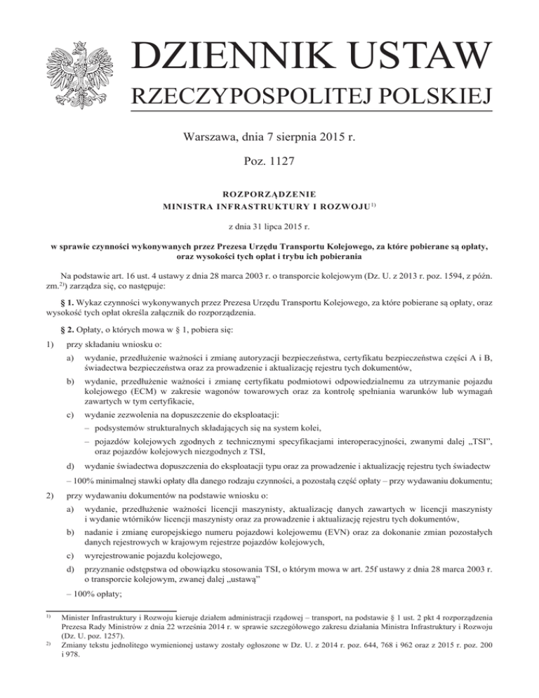DZIENNIK USTAW RZECZYPOSPOLITEJ POLSKIEJ Warszawa, dnia 7 sierpnia 2015 r. Poz. 1127 ROZPORZĄDZENIE MINISTRA INFRASTRUKTURY I ROZWOJU 1) z dnia 31 lipca 2015 r. w sprawie czynności wykonywanych przez Prezesa Urzędu Transportu Kolejowego, za które pobierane są opłaty, oraz wysokości tych opłat i trybu ich pobierania Na podstawie art. 16 ust. 4 ustawy z dnia 28 marca 2003 r. o transporcie kolejowym (Dz. U. z 2013 r. poz. 1594, z późn. zm.2)) zarządza się, co następuje: § 1. Wykaz czynności wykonywanych przez Prezesa Urzędu Transportu Kolejowego, za które pobierane są opłaty, oraz wysokość tych opłat określa załącznik do rozporządzenia. § 2. Opłaty, o których mowa w § 1, pobiera się: 1) przy składaniu wniosku o: a) wydanie, przedłużenie ważności i zmianę autoryzacji bezpieczeństwa, certyfikatu bezpieczeństwa części A i B, świadectwa bezpieczeństwa oraz za prowadzenie i aktualizację rejestru tych dokumentów, b) wydanie, przedłużenie ważności i zmianę certyfikatu podmiotowi odpowiedzialnemu za utrzymanie pojazdu kolejowego (ECM) w zakresie wagonów towarowych oraz za kontrolę spełniania warunków lub wymagań zawartych w tym certyfikacie, c) wydanie zezwolenia na dopuszczenie do eksploatacji: – podsystemów strukturalnych składających się na system kolei, – pojazdów kolejowych zgodnych z technicznymi specyfikacjami interoperacyjności, zwanymi dalej „TSI”, oraz pojazdów kolejowych niezgodnych z TSI, d) wydanie świadectwa dopuszczenia do eksploatacji typu oraz za prowadzenie i aktualizację rejestru tych świadectw – 100% minimalnej stawki opłaty dla danego rodzaju czynności, a pozostałą część opłaty – przy wydawaniu dokumentu; 2) przy wydawaniu dokumentów na podstawie wniosku o: a) wydanie, przedłużenie ważności licencji maszynisty, aktualizację danych zawartych w licencji maszynisty i wydanie wtórników licencji maszynisty oraz za prowadzenie i aktualizację rejestru tych dokumentów, b) nadanie i zmianę europejskiego numeru pojazdowi kolejowemu (EVN) oraz za dokonanie zmian pozostałych danych rejestrowych w krajowym rejestrze pojazdów kolejowych, c) wyrejestrowanie pojazdu kolejowego, d) przyznanie odstępstwa od obowiązku stosowania TSI, o którym mowa w art. 25f ustawy z dnia 28 marca 2003 r. o transporcie kolejowym, zwanej dalej „ustawą” – 100% opłaty; Minister Infrastruktury i Rozwoju kieruje działem administracji rządowej – transport, na podstawie § 1 ust. 2 pkt 4 rozporządzenia Prezesa Rady Ministrów z dnia 22 września 2014 r. w sprawie szczegółowego zakresu działania Ministra Infrastruktury i Rozwoju (Dz. U. poz. 1257). 2) Zmiany tekstu jednolitego wymienionej ustawy zostały ogłoszone w Dz. U. z 2014 r. poz. 644, 768 i 962 oraz z 2015 r. poz. 200 i 978. 1) Dziennik Ustaw 3) –2– Poz. 1127 w każdym roku kalendarzowym za nadzór nad: a) ośrodkami szkolenia i egzaminowania maszynistów oraz kandydatów na maszynistów, b) podmiotami uprawnionymi do przeprowadzania badań lekarskich i psychologicznych oraz orzekania w celu sprawdzenia spełnienia wymagań zdrowotnych, fizycznych i psychicznych, niezbędnych do uzyskania licencji maszynisty oraz świadectwa maszynisty, także zachowania ich ważności – 100% opłaty płatnej w terminie 30 dni od dnia sporządzenia protokołu kontroli; 4) za czynności związane z kontrolą, o której mowa w art. 13 ust. 1a pkt 6 ustawy, o ile polegają one na wykonywaniu badań i pomiarów – 50% minimalnej stawki opłaty dla danego rodzaju czynności przy rozpoczęciu kontroli, a pozostałą część opłaty – przy odbiorze protokołu kontroli. § 3. Wysokość opłat za wydanie, przedłużenie ważności i zmianę autoryzacji bezpieczeństwa, certyfikatu bezpieczeństwa, świadectw bezpieczeństwa oraz za wydawanie świadectw dopuszczenia do eksploatacji typu budowli, typu urządzeń oraz typu eksploatowanego pojazdu kolejowego: 1) wpisanego do rejestru zabytków, zgodnie z ustawą z dnia 23 lipca 2003 r. o ochronie zabytków i opiece nad zabytkami (Dz. U. z 2014 r. poz. 1446 oraz z 2015 r. poz. 397 i 774), lub do inwentarza muzealiów, zgodnie z ustawą z dnia 21 listopada 1996 r. o muzeach (Dz. U. z 2012 r. poz. 987), i eksploatowanych w celu prowadzenia przewozów okolicznościowych pociągami „Retro” – wynosi 10% opłaty dla danego rodzaju czynności; 2) eksploatowanego w celach rekreacyjno-wypoczynkowych, w tym kolei wąskotorowych – wynosi 20% opłaty dla danego rodzaju czynności. § 4. Rozporządzenie wchodzi w życie z dniem następującym po dniu ogłoszenia.3) Minister Infrastruktury i Rozwoju: M. Wasiak 3) Niniejsze rozporządzenie było poprzedzone rozporządzeniem Ministra Transportu, Budownictwa i Gospodarki Morskiej z dnia 2 maja 2012 r. w sprawie czynności wykonywanych przez Prezesa Urzędu Transportu Kolejowego, za które pobierane są opłaty, oraz wysokości tych opłat i trybu ich pobierania (Dz. U. z 2014 r. poz. 1016), które na podstawie art. 10 ustawy z dnia 30 sierpnia 2013 r. o zmianie ustawy o transporcie kolejowym (Dz. U. poz. 1152) utraciło moc z dniem 31 marca 2015 r. Dziennik Ustaw –3– Poz. 1127 Załącznik do rozporządzenia Ministra Infrastruktury i Rozwoju z dnia 31 lipca 2015 r. (poz. 1127) WYKAZ CZYNNOŚCI WYKONYWANYCH PRZEZ PREZESA URZĘDU TRANSPORTU KOLEJOWEGO, ZA KTÓRE POBIERANE SĄ OPŁATY, ORAZ WYSOKOŚĆ TYCH OPŁAT Nr poz. Rodzaj czynności 1 I. 2 Dotyczące autoryzacji bezpieczeństwa 1. Wysokość opłat (PLN) Pracochłonność 5 6 30 do 40 40 do 50 godzin godzin 3 do 10 godzin 4 10 do 30 godzin Wydawanie dokumentu autoryzacja bezpieczeństwa 7000 9000 12000 15000 równowartość w złotych 5500 euro* 2. Przedłużanie ważności autoryzacji bezpieczeństwa 4000 7000 8000 9000 10000 3. Zmiana autoryzacji bezpieczeństwa 2000 2500 3000 4000 5000 II. Dotyczące certyfikatów bezpieczeństwa część A do 10 godzin 10 do 30 godzin 30 do 40 godzin 40 do 50 godzin opłata maksymal