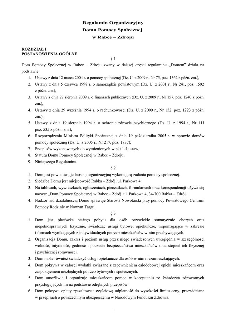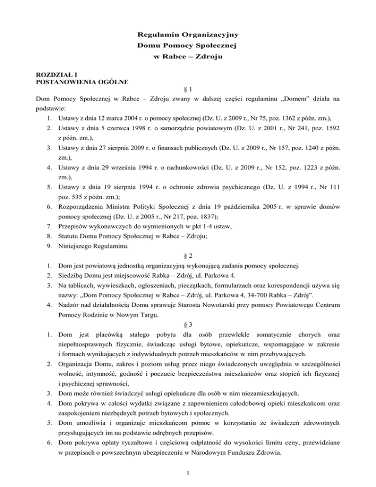 Regulamin Organizacyjny Domu Pomocy Społecznej w Rabce – Zdroju ROZDZIAŁ I POSTANOWIENIA OGÓLNE §1 Dom Pomocy Społecznej w Rabce – Zdroju zwany w dalszej części regulaminu „Domem” działa na podstawie: 1. Ustawy z dnia 12 marca 2004 r. o pomocy społecznej (Dz. U. z 2009 r., Nr 75, poz. 1362 z późn. zm.), 2. Ustawy z dnia 5 czerwca 1998 r. o samorządzie powiatowym (Dz. U. z 2001 r., Nr 241, poz. 1592 z późn. zm.), 3. Ustawy z dnia 27 sierpnia 2009 r. o finansach publicznych (Dz. U. z 2009 r., Nr 157, poz. 1240 z późn. zm.), 4. Ustawy z dnia 29 września 1994 r. o rachunkowości (Dz. U. z 2009 r., Nr 152, poz. 1223 z późn. zm.), 5. Ustawy z dnia 19 sierpnia 1994 r. o ochronie zdrowia psychicznego (Dz. U. z 1994 r., Nr 111 poz. 535 z późn. zm.); 6. Rozporządzenia Ministra Polityki Społecznej z dnia 19 października 2005 r. w sprawie domów pomocy społecznej (Dz. U. z 2005 r., Nr 217, poz. 1837); 7. Przepisów wykonawczych do wymienionych w pkt 1-4 ustaw, 8. Statutu Domu Pomocy Społecznej w Rabce – Zdroju; 9. Niniejszego Regulaminu. §2 1. Dom jest powiatową jednostką organizacyjną wykonującą zadania pomocy społecznej. 2. Siedzibą Domu jest miejscowość Rabka – Zdrój, ul. Parkowa 4. 3. Na tablicach, wywieszkach, ogłoszeniach, pieczątkach, formularzach oraz korespondencji używa się nazwy: „Dom Pomocy Społecznej w Rabce – Zdrój, ul. Parkowa 4, 34-700 Rabka – Zdrój”. 4. Nadzór nad działalnością Domu sprawuje Starosta Nowotarski przy pomocy Powiatowego Centrum Pomocy Rodzinie w Nowym Targu. §3 1. Dom jest placówką stałego pobytu dla osób przewlekle somatycznie chorych oraz niepełnosprawnych fizycznie, świadcząc usługi bytowe, opiekuńcze, wspomagające w zakresie i formach wynikających z indywidualnych potrzeb mieszkańców w nim przebywających. 2. Organizacja Domu, zakres i poziom usług przez niego świadczonych uwzględnia w szczególności wolność, intymność, godność i poczucie bezpieczeństwa mieszkańców oraz stopień ich fizycznej i psychicznej sprawności. 3. Dom może również świadczyć usługi opiekuńcze dla osób w nim niezamieszkujących. 4. Dom pokrywa w całości wydatki związane z zapewnieniem całodobowej opieki mieszkańcom oraz zaspokojeniem niezbędnych potrzeb bytowych i społecznych. 5. Dom umożliwia i organizuje mieszkańcom pomoc w korzystaniu ze świadczeń zdrowotnych przysługujących im na podstawie odrębnych przepisów. 6. Dom pokrywa opłaty ryczałtowe i częściową odpłatność do wysokości limitu ceny, przewidziane w przepisach o powszechnym ubezpieczeniu w Narodowym Funduszu Zdrowia. 1 ROZDZIAŁ II ORGANIZACJA WEWNĘTRZNA DOMU §4 1. Domem kieruje dyrektor przy pomocy: a) głównego księgowego, b) kierowników działów. 2. Dyrektor jest powoływany i odwoływany przez Zarząd Powiatu. 3. Dyrektor jest dla wszystkich pracowników Domu zwierzchnikiem służbowym i pracodawcą w rozumieniu Kodeksu pracy. 4. W przypadku nieobecności Dyrektora, jego uprawnienia przejmuje główny księgowy lub upoważniony przez dyrektora Domu kierownik działu. 5. Do zadań dyrektora należy w szczególności: a) kierowanie Domem i reprezentowanie go na zewnątrz, b) sprawowanie nadzoru nad właściwą realizacją standardów obowiązujących podstawowych usług świadczonych przez Dom, c) nadzorowanie funkcjonujących komórek organizacyjnych, d) dysponowanie środkami określonymi w planie finansowym Domu i ponoszenie odpowiedzialności za ich prawidłowe wykorzystanie, a także organizowanie administracyjnej, finansowej i gospodarczej obsługi Domu, e) wykonywanie zadań pokontrolnych, f) tworzenie warunków do realizacji zadań Domu według określonych standardów, g) kształtowanie twórczej atmosfery pracy w domu, właściwych warunków pracy i stosunków pracowniczych, h) administrowanie zakładowym funduszem socjalnym, i) zapewnienie odpowiedniego stanu bezpieczeństwa i higieny pracy. §5 W skład Domu wchodzą następujące komórki organizacyjne: I. Dział administracyjno – gospodarczy 1. Do zadań działu administracyjno – gospodarczego należy: a) utrzymanie obiektów, urządzeń, narzędzi i maszyn będących w posiadaniu lub użytkowaniu Domu w należytym stanie technicznym, dokonywanie przeglądów stanu technicznego budynków, warunków pracy a także prawidłowe prowadzenie niezbędnej dokumentacji eksploatacyjnej, b) zabezpieczenie i ochrona mienia będącego w dyspozycji Domu c) obsługa transportowa Domu, d) zapewnienie usług pralniczych na rzecz Domu oraz pomoc w konserwacji, praniu, naprawie i utrzymaniu w czystości rzeczy osobistych mieszkańców, e) zaopatrzenie Domu w żywność, sprzęt i środki czystości, materiały techniczne i prowadzenie dokumentacji dotyczących zakupów, f) racjonalne prowadzenie gospodarki paliwowej, energetycznej, wodno – ściekowej, 2 g) prowadzenie remontów, napraw, utrzymywanie w czystości otoczenia Domu, a także dbanie o racjonalne wykorzystanie środków rzeczowych i finansowych przeznaczonych na te cele, h) współpraca z głównym księgowym w przygotowaniu i opracowywaniu rocznych planów wydatków budżetowych w zakresie usług świadczonych przez dział, i) współudział we wszystkich działaniach pozostałych działów Domu mającym na celu zapewnienie mieszkańcom odpowiedniego poziomu świadczonych usług, j) przygotowywanie przetargów i prowadzenie spraw związanych z prawem zamówień publicznych oraz nadzorowanie prawidłowości stosowania przepisów ustawy, k) tworzenie polityki kadrowej Domu, l) prowadzenie spraw socjalnych, m) prowadzenie archiwum zakładowego, n) prowadzenie księgowości, kasy, likwidatury, rachunków bankowych, o) opracowanie projektu i wykonanie budżetu Domu, p) dokonywanie analiz ekonomicznych kosztów ogólnych, jednostkowych oraz wykonywanie funduszu płac, q) realizacja operacji finansowych i gospodarczych związanych z wykonaniem budżetu Domu, prowadzenie rozliczenia z budżetem
