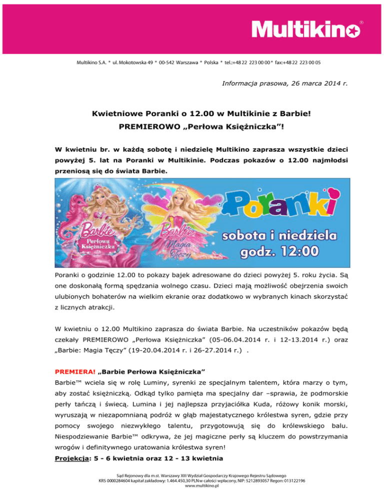 Informacja prasowa, 26 marca 2014 r. Kwietniowe Poranki o 12.00 w Multikinie z Barbie! PREMIEROWO „Perłowa Księżniczka”! W kwietniu br. w każdą sobotę i niedzielę Multikino zaprasza wszystkie dzieci powyżej 5. lat na Poranki w Multikinie. Podczas pokazów o 12.00 najmłodsi przeniosą się do świata Barbie. Poranki o godzinie 12.00 to pokazy bajek adresowane do dzieci powyżej 5. roku życia. Są one doskonałą formą spędzania wolnego czasu. Dzieci mają możliwość obejrzenia swoich ulubionych bohaterów na wielkim ekranie oraz dodatkowo w wybranych kinach skorzystać z licznych atrakcji. W kwietniu o 12.00 Multikino zaprasza do świata Barbie. Na uczestników pokazów będą czekały PREMIEROWO „Perłowa Księżniczka” (05-06.04.2014 r. i 12-13.2014 r.) oraz „Barbie: Magia Tęczy” (19-20.04.2014 r. i 26-27.2014 r.) . PREMIERA! „Barbie Perłowa Księżniczka” Barbie™ wciela się w rolę Luminy, syrenki ze specjalnym talentem, która marzy o tym, aby zostać księżniczką. Odkąd tylko pamięta ma specjalny dar –sprawia, że podmorskie perły tańczą i świecą. Lumina i jej najlepsza przyjaciółka Kuda, różowy konik morski, wyruszają w niezapomnianą podróż w głąb majestatycznego królestwa syren, gdzie przy pomocy swojego niezwykłego talentu, przygotowują się do królewskiego balu. Niespodziewanie Barbie™ odkrywa, że jej magiczne perły są kluczem do powstrzymania wrogów i definitywnego uratowania królestwa syren! Projekcja: 5 - 6 kwietnia oraz 12 - 13 kwietnia „Barbie i Magia Tęcza” Przyłącz się do Barbie i Eliny w kolejnej przygodzie z krainy baśni. Elina właśnie wyrusza ze swoją ulubioną purchawką Bibble, do szkoły dla wróżek znajdującej się w przecudownym Kryształowym Pałacu. Tam spotka wiele innych kandydatek na wróżki, przygotowujących się do corocznego Wiosennego Szybowania, podczas którego powstanie pierwsza tęcza roku. Tymczasem zła Laverna czyni wszystko, by powstrzymać lot, i spowodować by Bajkotopia pogroziła się na dziesięć lat w srogiej zimie. Elina i jej nowi przyjaciele już wkrótce dowiedzą się, że w „jedności siła”. Ale czy wystarczy im tej siły do pokonania Laverny i stworzenia pięknej tęczy? Projekcja: 19 - 20 kwietnia oraz 26 – 27 kwietnia Kwietniowe Poranki o 12.00 odbędą się w Multikinie: Bydgoszcz, Elbląg, Gdańsk, Gdynia, Katowice, Kielce, Koszalin, Kraków, Lubin, Poznań Malta, Poznań 51, Radom, Rumia, Rybnik, Rzeszów, Słupsk, Sopot, Szczecin, Tychy, Warszawa Targówek, Warszawa Ursynów, Warszawa Złote Tarasy, Warszawa Wola, Włocławek, Wrocław Arkady, Wrocław Pasaż Grunwaldzki, Zabrze, Łódź Silver Screen. Bilet w cenie 12 zł już dziś można nabyć we wszystkich kasach biletowych kin sieci Multikino i Silver Screen Łódź oraz na stronie www.multikino.pl. Poranki i ofert dla Przedszkoli W tygodniu, od poniedziałku do piątku, istnieje możliwość zorganizowana Poranków dla grup przedszkolnych (minimalna wielkość grupy to 20 dzieci). Więcej o Porankach na http://multikino.pl/pl/wydarzenia/dzieci/ *** Informacje o spółce Multikino: Multikino jest pierwszym operatorem, który w 1998 roku uruchomił w Polsce kino wieloekranowe (multipleks). Od tego czasu Multikino wyznacza najwyższe standardy w budowie i prowadzeniu kin. Grupa prowadzi działalność w segmencie kinowym i dystrybucji filmów. Multikino jest operatorem 31 kin w 25 miastach Polski z łączną liczbą 253 ekranów i 53 716 miejscami. W sierpniu 2007 r. Multikino otworzyło wyjątkowe kino w centrum handlowym Złote Tarasy w Warszawie. Obiekt składa się z 8 nowoczesnych sal, w tym Sali Premierowej na 777 osób, wyposażonej w projektory cyfrowe Barco DP 4K, fenomenalny system dźwięku Martin Audio i największy w Europie ekran przystosowany do projekcji cyfrowej (prawie 300 m2). W sierpniu 2010 roku Grupa otworzyła pierwsze kino za granicą w Rydze (8 ekranów i 1620 miejsc), a we wrześniu w Wilnie (7 ekranów i 1547 miejsca). Multikino to więcej niż kino! To największe premiery filmowe oraz koncerty, maratony, transmisje sportowe, Opery HD, Kino na obcasach, Multibabykino i wiele więcej. Multikino to także oryginalna sieć kawiarni Cavablanca Cinema Cafe. Od lat Multikino jest partnerem najważniejszych festiwali filmowych w Polsce w tym Festiwalu Polskich Filmów Fabularnych w Gdyni, Camerimage i Warszawskiego Festiwalu Filmowego. Multikino jest w gronie światowych liderów kinowej cyfryzacji, dzięki wyposażeniu sal kinowych w projektory firmy BARCO i systemy do projekcji trójwymiarowej Dolby 3D. Sieć z powodzeniem prezentuje w technologii 3D: filmy, koncerty, wydarzenia sportowe, opery oraz balet. Multikino jest liderem cyfryzacji w Europie czyli technologicznego i jakościowego przełomu w branży kinowej. Kontakt dla mediów: Natalia Kaleta-Nguyen, Specjalista ds. PR w spółce Multikino tel.: +48 519 520 984 e-mail: [email protected] Igor Przespolewski, Specjalista ds. Projektów Specjalnych w spółce Multikino tel.: +48 502 555 698 e-mail: [email protected]