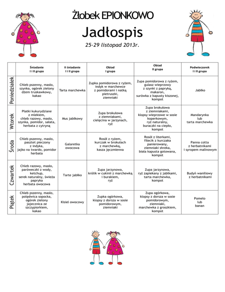 Żłobek EPIONKOWO Jadłospis 25-29 listopad 2013r. Chleb pszenny, masło, szynka, ogórek zielony dżem truskawkowy, kakao Środa Chleb pszenny, masło, pasztet pieczony z indyka, jajko na twardo, pomidor herbata Czwartek Płatki kukurydziane z mlekiem, chleb razowy, masło, szynka, pomidor, sałata, herbata z cytryną Chleb razowy, masło, paróweczki z wody, ketchup, serek naturalny, świeża papryka herbata owocowa Piątek Wtorek Poniedziałek Śniadanie I i II grupa Chleb pszenny, masło, polędwica sopocka, ogórek zielony jajecznica ze szczypiorkiem, kakao II śniadanie I i II grupa Obiad I grupa Obiad II grupa Podwieczorek I i II grupa Zupa pomidorowa z ryżem, gulasz wieprzowy z szynki z papryką, makaron, surówka z kapusty kiszonej, kompot Jabłko Zupa brokułowa z ziemniakami, klopsy wieprzowe w sosie koperkowym, ryż naturalny, buraczki na ciepło, kompot Mandarynka lub tarta marchewka Rosół z literkami, filecik z kurczaka panierowany, ziemniaki shreka, biała kapusta gotowana, kompot Panna cotta z herbatnikami i syropem malinowym Tarte jabłko Zupa jarzynowa, królik w cukinii z marchewką i burakiem, ryż Zupa jarzynowa, ryż zapiekany z jabłkami, tarta marchewka, kompot Budyń waniliowy z herbatnikami Kisiel owocowy Zupka ogórkowa, klopsy z dorsza w sosie pomidorowym, ziemniaki Zupa ogórkowa, klopsy z dorsza w sosie pomidorowym, ziemniaki, marchewka z groszkiem, kompot Pomelo lub banan Zupka pomidorowa z ryżem, indyk w marchewce Tarta marchewka z pomidorami i natką pietruszki, ziemniaki Mus jabłkowy Galaretka owocowa Zupa brokułowa z ziemniakami, cielęcina w jarzynach, ryż Rosół z ryżem, kurczak w brokułach z marchewką, kasza jęczmienna