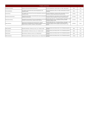 Projekty standardowe Cennik ogólny Wizytówka internetowa pojedyńcza strona bez elementów dynamicznych logo, dane teleadresowe, skrócona oferta, do 5 zdjęć, mapka dojazdu 300 zł 7 dni Strona standardowa do 5 podstron, bez elementów Flash, jedna wersja językowa, brak zarządzania treśćią logo, dane teleadresowe, oferta, do 10 zdjęć, mapka dojazdu, forumularz kontaktowy 600 zł 7 dni Strona firmowa do 15 podstron, bez elementów Flash, jedna wersja językowa, ograniczone logo, dane teleadresowe, rozszerzona oferta, mapa dojazdu, formularz zarządzanie treścią kontaktowy, moŜliwość edycji wybranych elementów strony od 900 zł 14 dni Rozszerzony serwis firmowy nieograniczona ilość podstron, bez elementów Flash, jedna wersja językowa,logo, dane teleadresowe, mapa dojazdu, formularz kontaktowy, system zarządzanie treścią serwisu zarządzania treścią (z dodatkowymi modułami: aktualności, galeria) od 1300 zł 14 dni Mały sklep internetowy dane firmy (logo, adres, etc…), formularz kontaktowy, mapa dojazdu, system szata graficzna bez elementów Flash, jedna wersja językowa, wyszukiwarka, zarządzania treścią (z modułami: aktualności, promocje, produkty, zarządzanie zawartością sklepu, obsługa zamówień i płatności zamówienia, płatności on-line) od 1600 zł 18 dni Sklep internetowy dane firmy (logo, adres, etc…), formularz kontaktowy, mapa dojazdu, system zaawansowana szata graficzna bez elementów Flash, moŜliwość zarządzania treścią (z modułami: aktualności, promocje, produkty, zdefiniowania do 3 wersji językowych, wyszukiwarka, zarządzania sklepem, zamówienia, płatności on-line, newsletter, produkty powiązane, opcja obsługa zamówień i płatności, newsletter, moduły dodatkowe prezent) od 2200 zł 25 dni Pakiet wizytówka Wizytówka internetowa + domena (.pl, com.pl, .eu) + hosting "na start" rejestracja domeny oraz hosting na okres 1 roku. PrzedłuŜenie zgnodnie z cennikiem 380 zł 7 dni Pakiet standard Strona standardowa + domena (.pl, com.pl, .eu) + hosting "na start" rejestracja domeny oraz hosting na okres 1 roku. PrzedłuŜenie zgnodnie z cennikiem 650 zł 7 dni Pakiet firmowy Strona firmowa + domena (.pl, com.pl, .eu) + hosting "biznes" rejestracja domeny oraz hosting na okres 1 roku. PrzedłuŜenie zgnodnie z cennikiem 950 zł 14 dni Pakiet rozszerzony Rozszerzony serwis firmowy + domena (.pl, com.pl, .eu) + hosting "biznes" rejestracja domeny oraz hosting na okres 1 roku. PrzedłuŜenie zgnodnie z cennikiem 1 350 zł 14 dni
