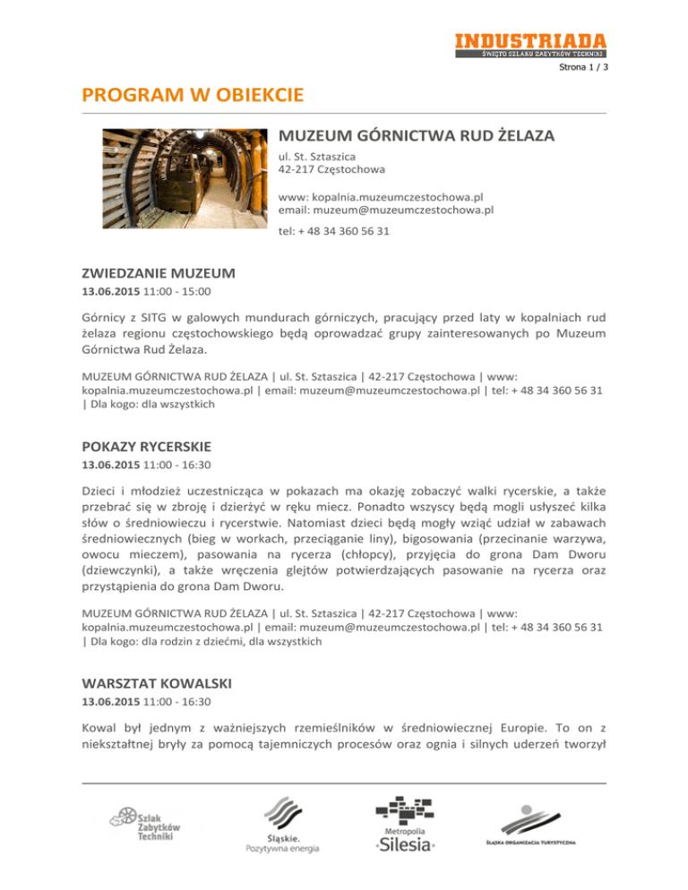 Strona 1 / 3 PROGRAM W OBIEKCIE MUZEUM GÓRNICTWA RUD ŻELAZA ul. St. Sztaszica 42-217 Częstochowa www: kopalnia.muzeumczestochowa.pl email: [email protected] tel: + 48 34 360 56 31 ZWIEDZANIE MUZEUM 13.06.2015 11:00 - 15:00 Górnicy z SITG w galowych mundurach górniczych, pracujący przed laty w kopalniach rud żelaza regionu częstochowskiego będą oprowadzać grupy zainteresowanych po Muzeum Górnictwa Rud Żelaza. MUZEUM GÓRNICTWA RUD ŻELAZA | ul. St. Sztaszica | 42-217 Częstochowa | www: kopalnia.muzeumczestochowa.pl | email: [email protected] | tel: + 48 34 360 56 31 | Dla kogo: dla wszystkich POKAZY RYCERSKIE 13.06.2015 11:00 - 16:30 Dzieci i młodzież uczestnicząca w pokazach ma okazję zobaczyć walki rycerskie, a także przebrać się w zbroję i dzierżyć w ręku miecz. Ponadto wszyscy będą mogli usłyszeć kilka słów o średniowieczu i rycerstwie. Natomiast dzieci będą mogły wziąć udział w zabawach średniowiecznych (bieg w workach, przeciąganie liny), bigosowania (przecinanie warzywa, owocu mieczem), pasowania na rycerza (chłopcy), przyjęcia do grona Dam Dworu (dziewczynki), a także wręczenia glejtów potwierdzających pasowanie na rycerza oraz przystąpienia do grona Dam Dworu. MUZEUM GÓRNICTWA RUD ŻELAZA | ul. St. Sztaszica | 42-217 Częstochowa | www: kopalnia.muzeumczestochowa.pl | email: [email protected] | tel: + 48 34 360 56 31 | Dla kogo: dla rodzin z dziećmi, dla wszystkich WARSZTAT KOWALSKI 13.06.2015 11:00 - 16:30 Kowal był jednym z ważniejszych rzemieślników w średniowiecznej Europie. To on z niekształtnej bryły za pomocą tajemniczych procesów oraz ognia i silnych uderzeń tworzył Strona 2 / 3 cenne i trwałe artefakty, od przedmiotów codziennego użytku – jak narzędzia rolnicze, okucia do drzwi, skrzyń, kraty, zawiasy – po nieodzowną w historii ludzkości broń: miecze, włócznie, topory, tarcze, pancerze itp. Zapraszamy się do zapoznania z tym niezwykłym zawodem oraz procesem twórczym i technicznym. Jak również do podjęcia próby samodzielnego wykucia stalowych elementów oraz wczucia się w rolę dawnego rzemieślnika. MUZEUM GÓRNICTWA RUD ŻELAZA | ul. St. Sztaszica | 42-217 Częstochowa | www: kopalnia.muzeumczestochowa.pl | email: [email protected] | tel: + 48 34 360 56 31 | Dla kogo: dla pasjonatów techniki, dla wszystkich ZAKUJ DZIADKA W ZBROJĘ – PREZENTACJA STROJÓW RYCERSKICH 13.06.2015 11:00 - 16:30 Dużą atrakcją będzie możliwość przyjrzenia się z bliska, a przez niektóre dzieci, włożenia zbroi na dziadka, wraz z hełmem wchodzącym w skład ówczesnego wyposażenia rycerza. Zabawa bedzie integrowała pokolenia, jak również zapoznawała wszystkich z wagą oraz – co najważniejsze – z poszczególnymi częściami zbroi rycerskiej. Dorośli będą mogli – nawet po raz pierwszy w życiu – poczuć się jak prawdziwi rycerze! MUZEUM GÓRNICTWA RUD ŻELAZA | ul. St. Sztaszica | 42-217 Częstochowa | www: kopalnia.muzeumczestochowa.pl | email: [email protected] | tel: + 48 34 360 56 31 | Dla kogo: dla pasjonatów techniki, dla wszystkich PARK MĄDREJ ROZRYWKI – EKSPERYMENTY 13.06.2015 11:00 - 16:30 Park Mądrej rozrywki, przygotowany przez pracowników naukowych Politechniki Częstochowskiej zaprasza dzieci i młodzież i dorosłych do wspólnej nauki i zabawy. Doświadczenia fizyczne, prezentacja trójkołowego pojazdu elektrycznego, badania wytrzymałości betonu, pokaz urządzeń do oceny jakości nawierzchni to tylko niektóre atrakcje, które goście INDUSTRIADY odnajdą w namiotach przygotowanych przez Wydziały Politechniki Częstochowskiej. MUZEUM GÓRNICTWA RUD ŻELAZA | ul. St. Sztaszica | 42-217 Częstochowa | www: kopalnia.muzeumczestochowa.pl | email: [email protected] | tel: + 48 34 360 56 31 | Dla kogo: dla rodzin z dziećmi, dla wszystkich SKRZYNIA RUDY – WYDOBYWANIE RUDY ŻELAZA 13.06.2015 11:00 - 16:45 Zabawa będzie polegała na wydobywaniu z drewnianej skrzyni zatopionej w glinie rudy Strona 3 / 3 żelaza przy użyciu narzędzia górniczego używanego na Częstochowskim Obszarze Rudonośnym – szpicaka. Każdy uczestnik za wydobytą rudę żalaza otrzyma w prezencie minerał lub skamielinę wraz z informnacją z jakiego okresu i miejsca pochodzi. MUZEUM GÓRNICTWA RUD ŻELAZA | ul. St. Sztaszica | 42-217 Częstochowa | www: kopalnia.muzeumczestochowa.pl | email: [email protected] | tel: + 48 34 360 56 31 | Dla kogo: dla rodzin z dziećmi, dla wszystkich SMYCZENIE KIBLA 13.06.2015 11:00 - 16:45 Zabawa będzie polegała na „smyczeniu” na odległość 8 m drewnianego kibla (wiadra) z urobkiem (rudą żelaza) po zwilżonej połowicy drewnianego smyka. W zabawie każdorazowo potrzeba dwóch osób: przesuwającego urobek oraz „kropacza“, który nawilża smyk. Dla najlepszych przewidziane będą pamiątkowe dyplomy. MUZEUM GÓRNICTWA RUD ŻELAZA | ul. St. Sztaszica | 42-217 Częstochowa | www: kopalnia.muzeumczestochowa.pl | email: [email protected] | tel: + 48 34 360 56 31 | Dla kogo: dla rodzin z dziećmi, dla wszystkich