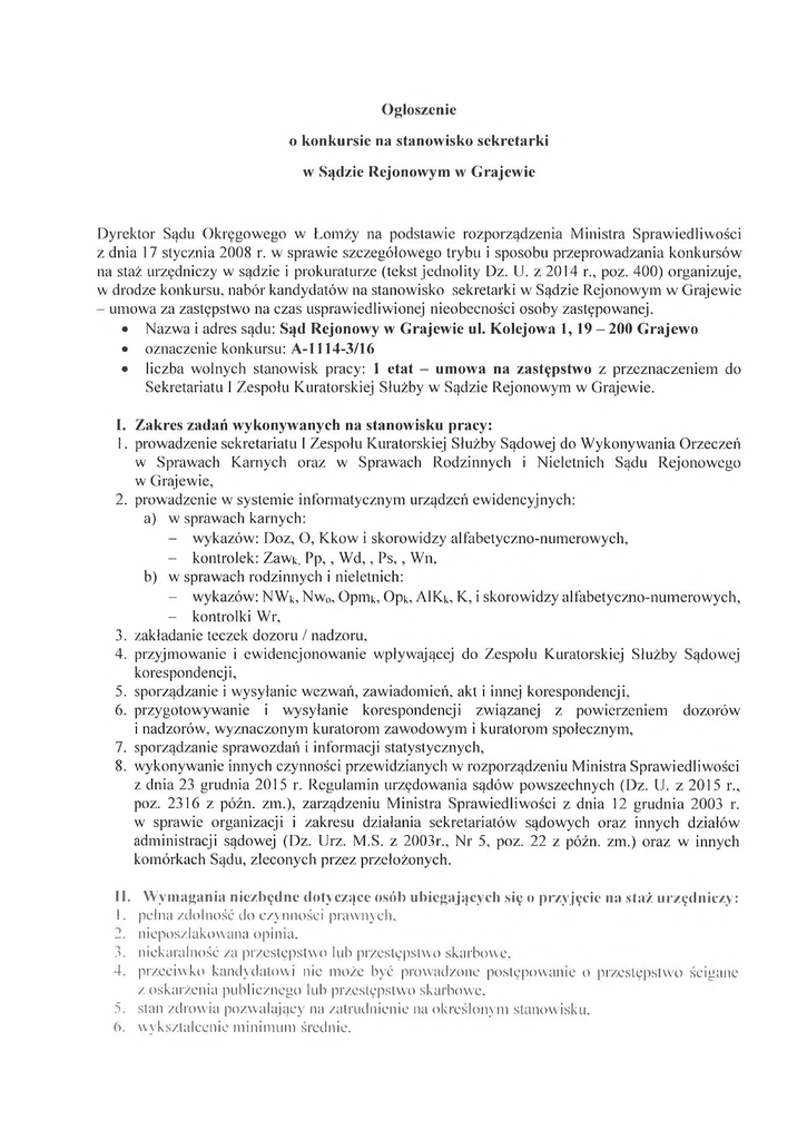 Ogłoszenie o konkursie na stanowisko sekretarki w Sądzie Rejonowym w Grajewie Dyrektor Sądu Okręgowego w Łomży na podstawie rozporządzenia Ministra Sprawiedliwości z dnia 17 stycznia 2008 r. w sprawie szczegółowego trybu i sposobu przeprowadzania konkursów na staż urzędniczy w sądzie i prokuraturze (tekst jednolity Dz. U. z 2014 r., poz. 400) organizuje, w drodze konkursu, nabór kandydatów na stanowisko sekretarki w Sądzie Rejonowym w Grajewie - umowa za zastępstwo na czas usprawiedliwionej nieobecności osoby zastępowanej. • Nazwa i adres sądu: Sąd Rejonowy w Grajewie ul. Kolejowa 1 , 1 9 - 200 Grajewo • oznaczenie konkursu: A-l 114-3/16 • liczba wolnych stanowisk pracy: 1 etat - umowa na zastępstwo z przeznaczeniem do Sekretariatu I Zespołu Kuratorskiej Służby w Sądzie Rejonowym w Grajewie. I. Zakres zadań wykonywanych na stanowisku pracy: 1. prowadzenie sekretariatu I Zespołu Kuratorskiej Służby Sądowej do Wykonywania Orzeczeń w Sprawach Karnych oraz w Sprawach Rodzinnych i Nieletnich Sądu Rejonowego w Grajewie, 2. prowadzenie w systemie informatycznym urządzeń ewidencyjnych: a) w sprawach karnych: - wykazów: Doz, O, Kkow i skorowidzy alfabetyczno-numerowych, - kontrolek: Zawk. P p,, W d,, P s,, Wn, b) w sprawach rodzinnych i nieletnich: - wykazów: NWk, Nw0, Opnik, Opk, AlKk, K, i skorowidzy alfabety czno-numerowych, - kontrolki Wr, 3. zakładanie teczek dozoru / nadzoru, 4. przyjmowanie i ewidencjonowanie wpływającej do Zespołu Kuratorskiej Służby Sądowej korespondencji, 5. sporządzanie i wysyłanie wezwań, zawiadomień, akt i innej korespondencji, 6. przygotowywanie i wysyłanie korespondencji związanej z powierzeniem dozorów i nadzorów, wyznaczonym kuratorom zawodowym i kuratorom społecznym, 7. sporządzanie sprawozdań i informacji statystycznych, 8. wykonywanie innych czynności przewidzianych w rozporządzeniu Ministra Sprawiedliwości z dnia 23 grudnia 2015 r. Regulamin urzędowania sądów powszechnych (Dz. U. z 2015 r., poz. 2316 z późn. zm.), zarządzeniu Ministra Sprawiedliwości z dnia 12 grudnia 2003 r. w sprawie organizacji i zakresu działania sekretariatów sądowych oraz innych działów administracji sądowej (Dz. Urz. M.S. z 2003r., Nr 5, poz. 22 z późn. zm.) oraz w innych komórkach Sądu, zleconych przez przełożonych. II. 1. 2. 3. 4. Wymagania niezbędne dotyczące osób ubiegających się o przyjęcie na staż urzędniczy: pełna zdolność do czynności prawnych, nieposzlakowana opinia. niekaralność za przestępstwo lub przestępstwo skarbowe, przeciwko kandydatowi nie może być prowadzone postępowanie o przestępstwo ścigane / oskarżenia publicznego lub przestępstwo skarbowe. 5. stan zdrowia pozwalający na zatrudnienie na określonym stanowisku. 6. wykształcenie minimum średnie. 7. dobra znajomość komputera i urządzeń biurowych. III. Wymagania dodatkowe: 1. znajomość metod i technik pracy biurowej. 2. umiejętność szybkiego pozyskiwania i praktycznego stosowania nowej wiedzy. 3. umiejętność pracy w zespole, 4. odporność na stres, 5. terminowość, odpow iedzialność, rzetelność i komunikatywność, 6. wysoki poziom wiedzy ogólnej i kultury osobistej. 7. umiejętność planowania i organizowania własnej pracy. Dodatkowe atuty: 1. staż pracy w sądzie lub w prokuraturze. 2. znajomość ustawy z dnia 27 lipea 2001 r. Prawo o ustroju sądów powszechnych (tekst jednolity L)z. U. z 2015 r.. poz. 133 z późn. zm.). rozporządzenia Ministra Sprawiedliwości z dnia 23 grudnia 2015 r. Regulamin urzędowania sądów powszechnych (Dz. U. z 2015 r.. poz. 2316 z późn. zm.). zarządzenia Ministra Sprawiedliwości z dnia 12 grudnia 2003 r. w sprawie organizacji i zakresu działania sekretariatów sądowych oraz innych działów administracji sądowej (Dz. Urz. MS. z 2003 r.. Nr 5, poz. 22 z późn. zm.), ustawy o pracownikach sądów i prokuratury (tekst jednolity Dz. U. z 2015 r., poz. 1241 z późn. zm.). IV. Wymagane dokumenty, termin i miejsce ich złożenia 1. w lasnoręcznie podpisane cv z przebiegiem nauki i pracy zawodowej, 2. list motywacyjny. 3. kwestionariusz osobowy dla osoby ubiegającej sic o zatrudnienie, 4. kserokopie dokumentów potwierdzających posiadane wykształcenie. 5. kserokopie dokumentów poświadczających dośw iadczenie zawodowe; 6. podpisane przez kandydata oświadczenia: • o posiadaniu pełnej zdolności do czynności prawnych. • o nieposzlakowanej opinii. • o niekaralności za przestępstwo lub przestępstwo skarbowe. • o nieprowadzeniu przeciwko kandydatowi postępowania o przestępstwo ścigane z. oskarżenia publicznego lub przestępstwo skarbowe. • o posiadaniu stanu zdrowia pozwalającego na zatrudnienie na określonym stanowisku. 7. własnoręcznie podpisana przez kandydata zgoda na przetwarzanie danych osobowych do celów rekrutacji zgodnie z. ustawą z dnia 28 sierpnia 199 7r. o ochronie danych osobowych (tekst jednolity: Dz. U. z 2015 r.. poz.2135 z późn.zm.), 8. kserokopie dodatkowych dokumentów potwierdzających kwalillkacje i osiągnięcia kandydata. Dokumenty (z podaniem sygnatury konkursu) należy przesłać w terminie do dnia 16 maja 2016 r\, na adres: Sąd Okręgowy w Łomży. ul. Dworna 16. 18-400 Łomży, lub złożyć bezpośrednio w siedzibie Sądu, tj. w Biurze Podawczym Sądu Okręgowego w Łomży (pokój nr 14) w godzinach od 7'n -15'" od poniedziałku do piątku. Konkurs składa się z trzech etapów: 1. etap pierwszy - wstępna selekcja zgłoszeń kandydatów pod kątem spełnienia wymogów formalnych, 2. etap drugi - praktyczny sprawdzian umiejętności. 3. etap trzeci - rozmowa kwalifikacyjna, podczas której komisja konkursowa oceni w szczególności umiejętności kandydata dotyczące wykorzystania w praktyce jego wiedzy z zakresu zadań wykonywanych na stanowisku pracy, którego konkurs dotyczy. Inne informacje: Oferty złożone po terminie nie będą rozpatrywane. W przypadku nadania dokumentów za pośrednict