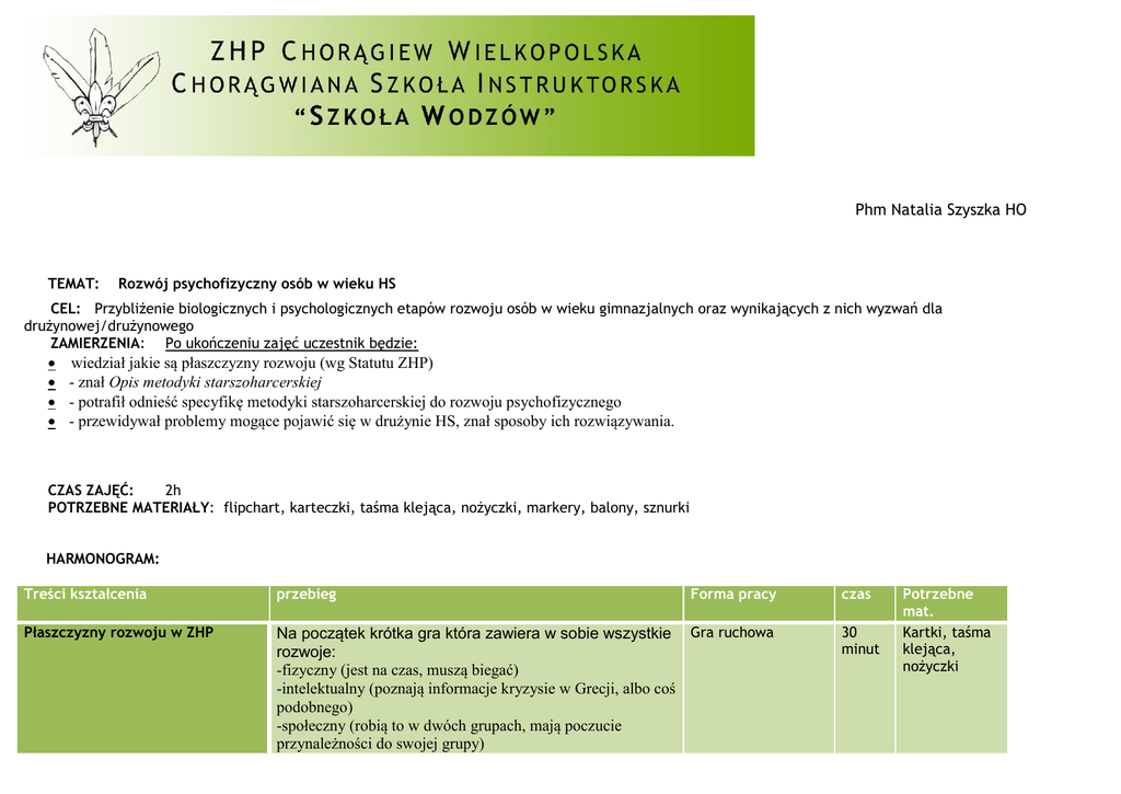 Phm Natalia Szyszka HO TEMAT: Rozwój psychofizyczny osób w wieku HS CEL: Przybliżenie biologicznych i psychologicznych etapów rozwoju osób w wieku gimnazjalnych oraz wynikających z nich wyzwań dla drużynowej/drużynowego ZAMIERZENIA: Po ukończeniu zajęć uczestnik będzie: wiedział jakie są płaszczyzny rozwoju (wg Statutu ZHP) - znał Opis metodyki starszoharcerskiej - potrafił odnieść specyfikę metodyki starszoharcerskiej do rozwoju psychofizycznego - przewidywał problemy mogące pojawić się w drużynie HS, znał sposoby ich rozwiązywania. CZAS ZAJĘĆ: 2h POTRZEBNE MATERIAŁY: flipchart, karteczki, taśma klejąca, nożyczki, markery, balony, sznurki HARMONOGRAM: Treści kształcenia przebieg Forma pracy Płaszczyzny rozwoju w ZHP Na początek krótka gra która zawiera w sobie wszystkie Gra ruchowa rozwoje: -fizyczny (jest na czas, muszą biegać) -intelektualny (poznają informacje kryzysie w Grecji, albo coś podobnego) -społeczny (robią to w dwóch grupach, mają poczucie przynależności do swojej grupy) czas 30 minut Potrzebne mat. Kartki, taśma klejąca, nożyczki Specyfika metodyki starszoharcerskiej Metodyka HS a rozwój psychofizyczny -emocjonalny (rywalizacja) -duchowy (trudny temat – czy pomagać? ) Ok i potem dostają opisy rozwojów i pytanie – jakie rozwoje w tej grze były (i były wszystkie :P) i porem rozmowa o tym jak można dany rozwój „rozwijać” – na dużych planszach (potem ja to spiszę i im wrzucę na płytę) Łuzganina – dzielę ich na dwie małe ekipy-jedna to „wstęp” i „funkcjonowanie elementów metody harcerskiej”, a druga „Instrumenty metodyczne” i „Działanie drużyny”. Każda ekipa dostaje nadmuchane balony (po dwa na osobę), w których są karteczki z treścią potrzebną drugiej ekipie. To są życia – każda osoba ma dwa – jak straci jedno to bierze drugie, ale potem już odpada z gry. Balony mogą sobie przywiązać w dowolnym miejscu, ale nie pod ubraniem. Cel łuzganiny: skompletować swoją połowę opisu metodyki i przeszkodzić w tym drugiej grupie. Potem omawiamy to, co im się uda w końcu skompletować i zaznaczałam, że użyliśmy tu metodę małych grup Mamy chłopca i dziewczynkę. Dostają ich opis na podstawie którego muszą podać takie ogólne cechy rozwoju psychofizycznego w tym wieku, np.: „Ola bardzo lubi pisać pamiętnik i rozmawiać z przyjaciółką przez telefon” -> potrzeba ekspresji, zwierzenia. „Gdy Rafał odbiera telefon, coraz częściej jest mylony ze swoim tatą” -> (to może frajerski przykład) chodzi o obniżenie tonacji głosu. Potem, jak już zbierzemy w ten sposób info dot. rozwoju to dopasowują do niego elementy metodyki->robimy słoneczka. Np. pośrodku jest „system małych grup” i do tego można dołożyc karteczki: Gra ruchowa w grupach, dyskusja 30 min Balony, karteczki, sznurki Burza mózgów, praca z flipchartem 30 min Flipchart, małe karteczki, przygotowane opisy -potrzeba przynależności do grupy - identyfikacja z grupą -kryzys autorytetu rodziców -rozwój przyjaźni Problemy młodzieży w wieku HS – przewidywanie ich wystąpienia, sposoby ich rozwiązywania Robimy to przy użyciu takiej mapy : Obszar zielony to problemy dotyczące interakcji ze środowiskiem – szkoła (nauka), subkultury, relacje z płcią przeciwną. Obszar czerwony to problemy z samym sobą – kompleksy, niska samoocena, eksperymentowanie z wyglądem. Obszar żołty to problemy „harcerskie” – w drużynie, szczepie. Pewnie częściowo będą się pokrywać z obszarem zielonym. Drużynowy/drużyna to gwiazda, która obejmuje wszystkie 3 obszary, ale całościowo znajduje się na żółtym – więc to na niego ma największy wpływ, ale też „z niego” może wpływać także na dwa sąsiednie obszary Burza mózgów 30 min Mapa, karteczki
