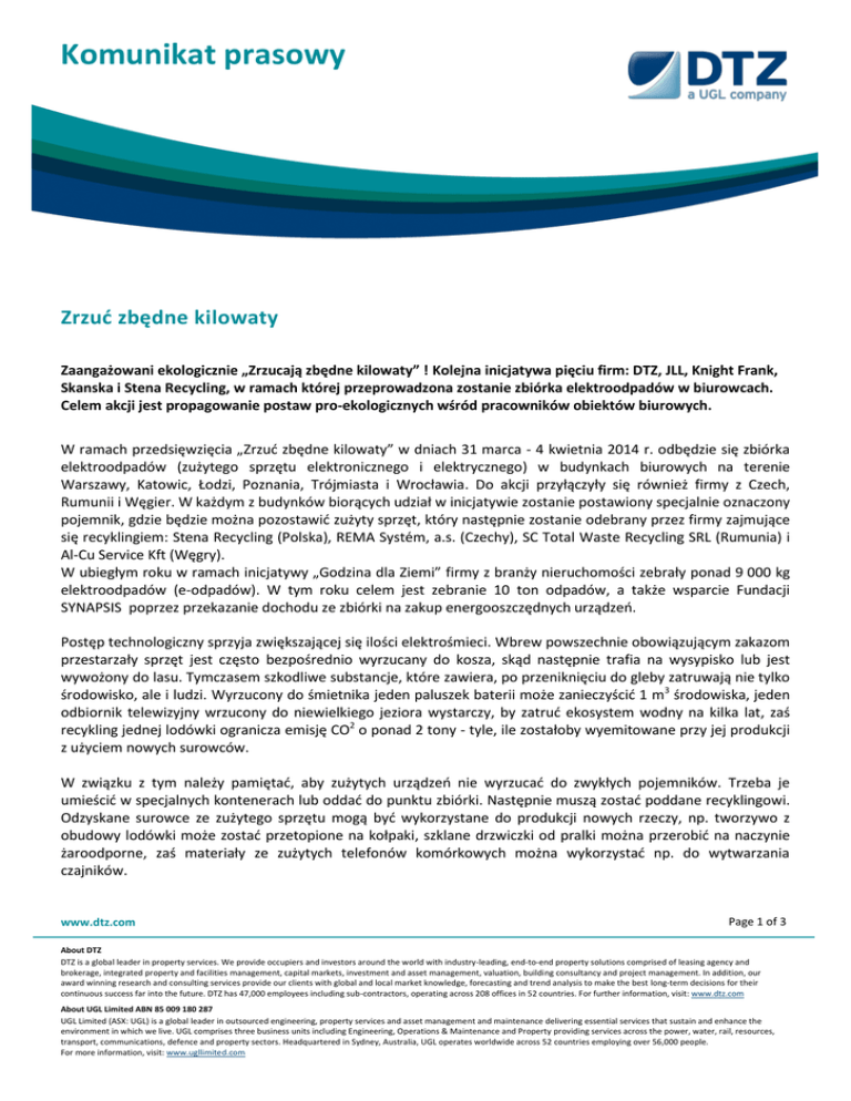 Komunikat prasowy Zrzuć zbędne kilowaty Zaangażowani ekologicznie „Zrzucają zbędne kilowaty” ! Kolejna inicjatywa pięciu firm: DTZ, JLL, Knight Frank, Skanska i Stena Recycling, w ramach której przeprowadzona zostanie zbiórka elektroodpadów w biurowcach. Celem akcji jest propagowanie postaw pro-ekologicznych wśród pracowników obiektów biurowych. W ramach przedsięwzięcia „Zrzuć zbędne kilowaty” w dniach 31 marca - 4 kwietnia 2014 r. odbędzie się zbiórka elektroodpadów (zużytego sprzętu elektronicznego i elektrycznego) w budynkach biurowych na terenie Warszawy, Katowic, Łodzi, Poznania, Trójmiasta i Wrocławia. Do akcji przyłączyły się również firmy z Czech, Rumunii i Węgier. W każdym z budynków biorących udział w inicjatywie zostanie postawiony specjalnie oznaczony pojemnik, gdzie będzie można pozostawić zużyty sprzęt, który następnie zostanie odebrany przez firmy zajmujące się recyklingiem: Stena Recycling (Polska), REMA Systém, a.s. (Czechy), SC Total Waste Recycling SRL (Rumunia) i Al-Cu Service Kft (Węgry). W ubiegłym roku w ramach inicjatywy „Godzina dla Ziemi” firmy z branży nieruchomości zebrały ponad 9 000 kg elektroodpadów (e-odpadów). W tym roku celem jest zebranie 10 ton odpadów, a także wsparcie Fundacji SYNAPSIS poprzez przekazanie dochodu ze zbiórki na zakup energooszczędnych urządzeń. Postęp technologiczny sprzyja zwiększającej się ilości elektrośmieci. Wbrew powszechnie obowiązującym zakazom przestarzały sprzęt jest często bezpośrednio wyrzucany do kosza, skąd następnie trafia na wysypisko lub jest wywożony do lasu. Tymczasem szkodliwe substancje, które zawiera, po przeniknięciu do gleby zatruwają nie tylko środowisko, ale i ludzi. Wyrzucony do śmietnika jeden paluszek baterii może zanieczyścić 1 m3 środowiska, jeden odbiornik telewizyjny wrzucony do niewielkiego jeziora wystarczy, by zatruć ekosystem wodny na kilka lat, zaś recykling jednej lodówki ogranicza emisję CO2 o ponad 2 tony - tyle, ile zostałoby wyemitowane przy jej produkcji z użyciem nowych surowców. W związku z tym należy pamiętać, aby zużytych urządzeń nie wyrzucać do zwykłych pojemników. Trzeba je umieścić w specjalnych kontenerach lub oddać do punktu zbiórki. Następnie muszą zostać poddane recyklingowi. Odzyskane surowce ze zużytego sprzętu mogą być wykorzystane do produkcji nowych rzeczy, np. tworzywo z obudowy lodówki może zostać przetopione na kołpaki, szklane drzwiczki od pralki można przerobić na naczynie żaroodporne, zaś materiały ze zużytych telefonów komórkowych można wykorzystać np. do wytwarzania czajników. www.dtz.com Page 1 of 3 Page 1 of 3 About DTZ DTZ is a global leader in property services. We provide occupiers and investors around the world with industry-leading, end-to-end property solutions comprised of leasing agency and brokerage, integrated property and facilities management, capital markets, investment and asset management, valuation, building consultancy and project management. In addition, our award winning research and consulting services provide our clients with global and local market knowledge, forecasting and trend analysis to make the best long-term decisions for their continuous success far into the future. DTZ has 47,000 employees including sub-contractors, operating across 208 offices in 52 countries. For further information, visit: www.dtz.com About UGL Limited ABN 85 009 180 287 UGL Limited (ASX: UGL) is a global leader in outsourced engineering, property services and asset management and maintenance delivering essential services that sustain and enhance the environment in which we live. UGL comprises three business units including Engineering, Operations & Maintenance and Property providing services across the power, water, rail, resources, transport, communications, defence and property sectors. Headquartered in Sydney, Australia, UGL operates worldwide across 52 countries employing over 56,000 people. For more information, visit: www.ugllimited.com O firmach: DTZ a UGL company Firma dostarcza klientom biznesowym, najemcom powierzchni komercyjnych oraz inwestorom kompleksowych usług, w skład, których wchodzą: pośrednictwo w wynajmie powierzchni handlowych, biurowych i magazynowych, zintegrowane usługi z zakresu zarządzania nieruchomościami komercyjnymi, doradztwo w zakresie rynków kapitałowych, doradztwo inwestycyjne, wyceny, doradztwo inwestycyjno-budowlane. Dodatkowo dzięki najwyższej jakości usług z zakresu badań i doradztwa rynkowego dostarczamy naszym klientom wiedzy na temat globalnych i lokalnych rynków. Prognozujemy rozwój sytuacji i trendów na rynkach, przez co wspomagamy naszych klientów w podejmowaniu najlepszych, długoterminowych decyzji. DTZ zatrudnia 47 500 osób wliczając w to podwykonawców, którzy pracują poprzez sieć 208 oddziałów zlokalizowanych na terenie 52 krajów. DTZ w Polsce zatrudnia ponad 290 osób. JLL JLL jest międzynarodową firmą doradczą świadczącą kompleksowe usługi na rynku nieruchomości, umożliwiając wzrost wartości klientom zainteresowanym najmem, obrotem lub inwestowaniem na tym rynku. JLL obsługuje klientów w 75 krajach w ponad 1000 lokalizacjach na świecie. Dochód firmy w 2013 roku wyniósł ponad 4,0 mld USD. JLL zarządza obiektami o łącznej powierzchni ok. 280 mln mkw. na całym świecie. W 2013 r. firma zrealizowała na całym świecie transakcje o łącznej wartości 99 mld USD. LaSalle Investment Management (spółka w ramach grupy), zarządza aktywami o łącznej sumie około 47,6 mld USD. Knight Frank Knight Frank Sp. z o.o. jest częścią Grupy Knight Frank – międzynarodowej firmy doradczej w dziedzinie nieruchomości. Knight Frank z siedzibą w Londynie zrzeszony z partnerem Newmark Knight Frank funkcjonującym w Nowym Jorku prowadzi działalność w przeszło 330 biurach na rozwiniętych i rozwijających się rynkach nieruchomości pięci