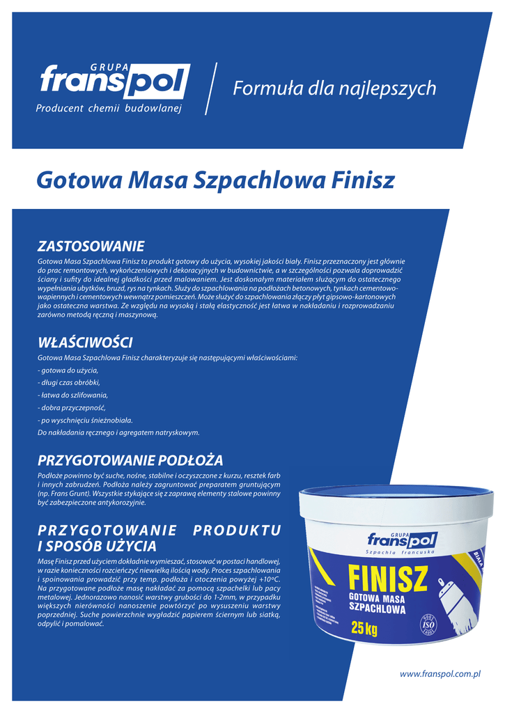 Gotowa Masa Szpachlowa Finisz ZASTOSOWANIE Gotowa Masa Szpachlowa Finisz to produkt gotowy do użycia, wysokiej jakości biały. Finisz przeznaczony jest głównie do prac remontowych, wykończeniowych i dekoracyjnych w budownictwie, a w szczególności pozwala doprowadzić ściany i sufity do idealnej gładkości przed malowaniem. Jest doskonałym materiałem służącym do ostatecznego wypełniania ubytków, bruzd, rys na tynkach. Służy do szpachlowania na podłożach betonowych, tynkach cementowowapiennych i cementowych wewnątrz pomieszczeń. Może służyć do szpachlowania złączy płyt gipsowo-kartonowych jako ostateczna warstwa. Ze względu na wysoką i stałą elastyczność jest łatwa w nakładaniu i rozprowadzaniu zarówno metodą ręczną i maszynową. WŁAŚCIWOŚCI Gotowa Masa Szpachlowa Finisz charakteryzuje się następującymi właściwościami: - gotowa do użycia, - długi czas obróbki, - łatwa do szlifowania, - dobra przyczepność, - po wyschnięciu śnieżnobiała. Do nakładania ręcznego i agregatem natryskowym. PRZYGOTOWANIE PODŁOŻA Podłoże powinno być suche, nośne, stabilne i oczyszczone z kurzu, resztek farb i innych zabrudzeń. Podłoża należy zagruntować preparatem gruntującym (np. Frans Grunt). Wszystkie stykające się z zaprawą elementy stalowe powinny być zabezpieczone antykorozyjnie. P R Z YG OT O WA N I E I SPOSÓB UŻYCIA PRODUKTU Masę Finisz przed użyciem dokładnie wymieszać, stosować w postaci handlowej, w razie konieczności rozcieńczyć niewielką ilością wody. Proces szpachlowania i spoinowania prowadzić przy temp. podłoża i otoczenia powyżej +10ºC. Na przygotowane podłoże masę nakładać za pomocą szpachelki lub pacy metalowej. Jednorazowo nanosić warstwy grubości do 1-2mm, w przypadku większych nierówności nanoszenie powtórzyć po wysuszeniu warstwy poprzedniej. Suche powierzchnie wygładzić papierem ściernym lub siatką, odpylić i pomalować. www.franspol.com.pl PRZECHOWYWANIE I TRANSPORT Gotową Masę Szpachlową Finisz należy chronić przed mrozem, wysoką temperaturą oraz bezpośrednim działaniem promieni słonecznych. Produktu nie należy mieszać z innymi materiałami. Nieprzestrzeganie w/w zaleceń może mieć wpływ na parametry użytkowe produktu. Okres przydatności do użycia wynosi 9 miesięcy od daty produkcji umieszczonej na opakowaniu. DANE TECHNICZNE Stopień twardości przy szlifowaniu Grubość jednej warstwy Kolor Zużycie kg/m2 przy 1mm grubości średnio twardy max. 2mm śnieżnobiały 0,5 Czas schnięcia: nie wcześniej niż 120min Przyczepność do podłoża: nie mniej niż 0,3MPa. Reakcja na ogień: 2A Temperatura podłoża i otoczenia: od +5°C do +25°C Max. grubość jednej warstwy: 2mm Wyrób spełnia wymagania PN-EN 15824:2009 Wyrób posiada atest PZH Deklaracja Zgodności 0007/DZ/2009 OPAKOWANIE Wiaderko 25kg, 8kg, 3kg, 1,5kg. UWAGA Gotowa Masa Szpachlowa Finisz jest produktem nietoksycznym w trakcie użycia i podczas eksploatacji, mimo to należy stosować odpowiednie środki ochronne. Należy chronić oczy, układ oddechowy i skórę. W przypadku bezpośredniego kontaktu przemyć dużą ilością wody. W przypadku wystąpienia jakichkolwiek negatywnych objawów należy skontaktować się z lekarzem. Chronić przed dziećmi. Karta charakterystyki dostępna na żądanie użytkownika. Producent nie ponosi odpowiedzialności za skutki powstałe w wyniku użycia wyrobu niezgodnie z powyższymi wskazówkami, zasadami sztuki budowlanej oraz przepisami BHP. Franspol Sp. z o.o. ul. Fabryczna 10 62-510 Konin tel. 63/ 240 85 53 fax 63/ 240 85 17 www.franspol.com.pl Gotowa Masa Szpachlowa Finisz www.franspol.com.pl