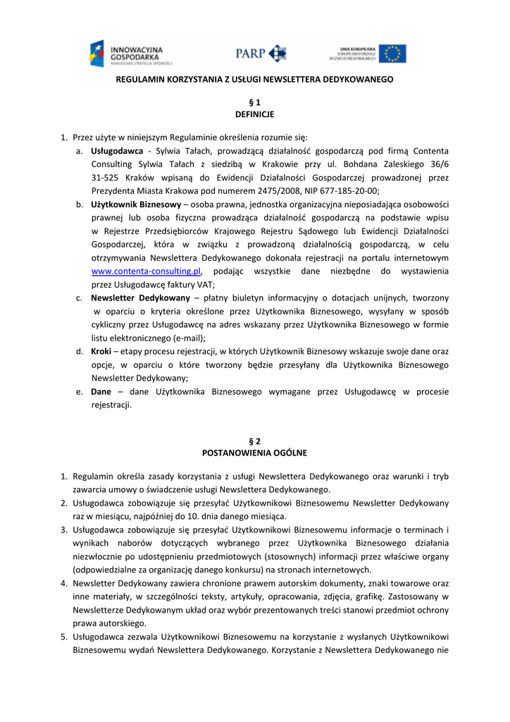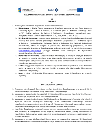 REGULAMIN KORZYSTANIA Z USŁUGI NEWSLETTERA DEDYKOWANEGO §1 DEFINICJE 1. Przez użyte w niniejszym Regulaminie określenia rozumie się: a. Usługodawca - Sylwia Tałach, prowadzącą działalnośd gospodarczą pod firmą Contenta Consulting Sylwia Tałach z siedzibą w Krakowie przy ul. Bohdana Zaleskiego 36/6 31-525 Kraków wpisaną do Ewidencji Działalności Gospodarczej prowadzonej przez Prezydenta Miasta Krakowa pod numerem 2475/2008, NIP 677-185-20-00; b. Użytkownik Biznesowy – osoba prawna, jednostka organizacyjna nieposiadająca osobowości prawnej lub osoba fizyczna prowadząca działalnośd gospodarczą na podstawie wpisu w Rejestrze Przedsiębiorców Krajowego Rejestru Sądowego lub Ewidencji Działalności Gospodarczej, która w związku z prowadzoną działalnością gospodarczą, w celu otrzymywania Newslettera Dedykowanego dokonała rejestracji na portalu internetowym www.contenta-consulting.pl, podając wszystkie dane niezbędne do wystawienia przez Usługodawcę faktury VAT; c. Newsletter Dedykowany – płatny biuletyn informacyjny o dotacjach unijnych, tworzony w oparciu o kryteria określone przez Użytkownika Biznesowego, wysyłany w sposób cykliczny przez Usługodawcę na adres wskazany przez Użytkownika Biznesowego w formie listu elektronicznego (e-mail); d. Kroki – etapy procesu rejestracji, w których Użytkownik Biznesowy wskazuje swoje dane oraz opcje, w oparciu o które tworzony będzie przesyłany dla Użytkownika Biznesowego Newsletter Dedykowany; e. Dane – dane Użytkownika Biznesowego wymagane przez Usługodawcę w procesie rejestracji. §2 POSTANOWIENIA OGÓLNE 1. Regulamin określa zasady korzystania z usługi Newslettera Dedykowanego oraz warunki i tryb zawarcia umowy o świadczenie usługi Newslettera Dedykowanego. 2. Usługodawca zobowiązuje się przesyład Użytkownikowi Biznesowemu Newsletter Dedykowany raz w miesiącu, najpóźniej do 10. dnia danego miesiąca. 3. Usługodawca zobowiązuje się przesyład Użytkownikowi Biznesowemu informacje o terminach i wynikach naborów dotyczących wybranego przez Użytkownika Biznesowego działania niezwłocznie po udostępnieniu przedmiotowych (stosownych) informacji przez właściwe organy (odpowiedzialne za organizację danego konkursu) na stronach internetowych. 4. Newsletter Dedykowany zawiera chronione prawem autorskim dokumenty, znaki towarowe oraz inne materiały, w szczególności teksty, artykuły, opracowania, zdjęcia, grafikę. Zastosowany w Newsletterze Dedykowanym układ oraz wybór prezentowanych treści stanowi przedmiot ochrony prawa autorskiego. 5. Usługodawca zezwala Użytkownikowi Biznesowemu na korzystanie z wysłanych Użytkownikowi Biznesowemu wydao Newslettera Dedykowanego. Korzystanie z Newslettera Dedykowanego nie oznacza nabycia przez Użytkownika Biznesowego jakichkolwiek praw na dobrach niematerialnych do treści zawartych w Newsletterze Dedykowanym. Użytkownik Biznesowy może korzystad z treści zawartych w Newsletterze Dedykowanym w zakresie dozwolonym przez obowiązujące przepisy prawa, a w szczególności przez przepisy Ustawy o prawie autorskim i prawach pokrewnych z dnia 4 lutego 1994 ( Dz. U. nr 24 poz.83); 6. Usługodawca nie ponosi odpowiedzialności w szczególności za: a. przerwy w świadczeniu usług wynikające z awarii lub wadliwego funkcjonowania systemów teleinformatycznych niezależnych od Usługodawcy; b. niemożnośd świadczenia usług z powodu utraty danych zarejestrowanego użytkownika spowodowanej awarią lub wadliwym funkcjonowaniem systemu teleinformatycznego; c. jakiekolwiek szkody wyrządzone osobom trzecim, powstałe w wyniku korzystania przez Użytkownika Biznesowego z dostępu do Newslettera Dedykowanego w sposób sprzeczny z Regulaminem lub obowiązującymi przepisami prawa; d. niezgodnośd treści Newslettera Dedykowanego ze stanem rzeczywistym, jeśli wynika ona z błędów zamieszczonych w tekstach źródłowych, z których korzysta Usługodawca przygotowując Newsletter Dedykowany takich, jak w szczególności strony internetowe instytucji zarządzających i wdrażających Programy Operacyjne; e. jakiekolwiek szkody poniesione przez Użytkownika Biznesowego lub osoby trzecie, będące następstwem wykorzystania informacji zawartych w Newsletterze Dedykowanym, w tym działao lub zaniechao podjętych pod wpływem treści jakichkolwiek tekstów i materiałów zamieszczonych w Newsletterze Dedykowanym; f. szkody wyrządzone osobom trzecim będące następstwem podania przez Użytkownika Biznesowego nieprawdziwych Danych na formularzu rejestracyjnym; g. utraty przez Użytkownika Biznesowego wszelkiego rodzaju danych spowodowanych działaniem czynników zewnętrznych, a w szczególności awarią kabla, sprzętu, oprogramowania lub też innymi okolicznościami niezależnymi od Usługodawcy, w szczególności działaniem osób trzecich; h. szkody wynikłe na skutek braku ciągłości dostarczania usług, będące następstwem okoliczności, za które Usługodawca nie ponosi odpowiedzialności, a w szczególności będące następstwem siły wyższej albo działania lub zaniechania osób trzecich; i. szkody powstałe w przypadku wystąpienia błędów w skonfigurowaniu urządzenia odbiorczego Użytkownika Biznesowego; j. szkody i straty poniesione przez zarejestrowanego użytkownika będące następstwem zagrożeo związanych z korzystaniem z sieci Internet, w szczególności działania wirusów komputerowych i włamania do systemu komputerowego. 7. Użytkownik Biznesowy oświadcza, iż jest przedsiębiorcą prowadzącym działalnośd gospodarczą na podstawie wpisu do Rejestru Przedsiębiorców Krajowego Rejestru Sądowego lub Ewidencji Działalności Gospodarczej. 8. Użytkownik Biznesowy jest zobowiązany do podania prawdziwych Danych. 9. Dane podane przez Użytkownika Biznesowego mają charakter wiążący. 10. Użytkownik Biznesowy zobowiązuje się niezwłocznie poinformowad Usługodawcę o zmianie Danych. 11. Rejestracja i akcepta