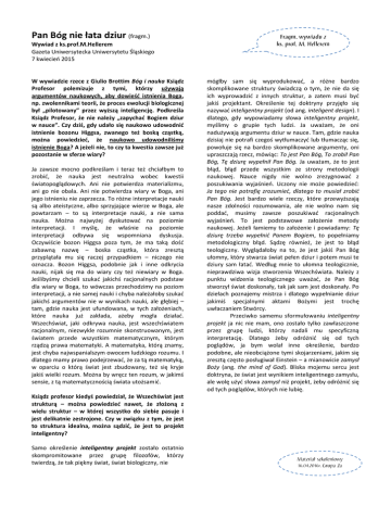 Pan Bóg nie łata dziur (fragm.) Wywiad z ks.prof.M.Hellerem Gazeta Uniwersytecka Uniwersytetu Śląskiego 7 kwiecień 2015 W wywiadzie rzece z Giulio Brottim Bóg i nauka Ksiądz Profesor polemizuje z tymi, którzy używają argumentów naukowych, aby dowieść istnienia Boga, np. zwolennikami teorii, że proces ewolucji biologicznej był „pilotowany” przez wyższą inteligencję. Podkreśla Ksiądz Profesor, że nie należy „zapychać Bogiem dziur w nauce”. Czy dziś, gdy udało się naukowo udowodnić istnienie bozonu Higgsa, zwanego też boską cząstką, można powiedzieć, że naukowo udowodniliśmy istnienie Boga? A jeżeli nie, to czy ta kwestia zawsze już pozostanie w sferze wiary? Ja zawsze mocno podkreślam i teraz też chciałbym to zrobić, że nauka jest neutralna wobec kwestii światopoglądowych. Ani nie potwierdza materializmu, ani go nie obala. Ani nie potwierdza wiary w Boga, ani jego istnieniu nie zaprzecza. To różne interpretacje nauki są albo ateistyczne, albo sprzyjające wierze w Boga, ale powtarzam – to są interpretacje nauki, a nie sama nauka. Można najwyżej dyskutować na poziomie interpretacji. I myślę, że właśnie na poziomie interpretacji odbywa się wspomniana dyskusja. Oczywiście bozon Higgsa poza tym, że ma taką dość zabawną nazwę – boska cząstka, która zresztą przyplątała mu się raczej przypadkiem – niczego nie oznacza. Bozon Higgsa, podobnie jak i inne odkrycia nauki, nijak się ma do wiary czy też niewiary w Boga. Jeślibyśmy chcieli szukać jakichś racjonalnych podstaw dla wiary w Boga, to wówczas przechodzimy na poziom interpretacji, a nie samej nauki i chyba należałoby szukać jakichś argumentów nie w wynikach nauki, ale głębiej – tam, gdzie nauka jest ufundowana, w tych założeniach, które nauka już zakłada, ażeby mogła działać. Wszechświat, jaki odkrywa nauka, jest wszechświatem racjonalnym, niezwykle rozumnie skonstruowanym, jest światem przede wszystkim matematycznym, którym rządzą prawa matematyki. A matematyka, którą znamy, jest chyba najwspanialszym owocem ludzkiego rozumu. I dlatego mamy prawo podejrzewać, że za tą matematyką, w oparciu o którą świat jest zbudowany, też się kryje jakiś wielki rozum. Można by wręcz ten rozum, w jakimś sensie, z tą matematycznością świata utożsamić. Ksiądz profesor kiedyś powiedział, że Wszechświat jest strukturą – można powiedzieć nawet, że złożoną z wielu struktur – w której wszystko do siebie pasuje i jest delikatnie zestrojone. Czy w związku z tym, że jest to struktura idealna, można sądzić, że jest to projekt inteligentny? Samo określenie inteligentny projekt zostało ostatnio skompromitowane przez grupę filozofów, którzy twierdzą, że tak piękny świat, świat biologiczny, nie mógłby sam się wyprodukować, a różne bardzo skomplikowane struktury świadczą o tym, że nie da się ich wyprowadzić z innych struktur, a zatem musi być jakiś projektant. Określenie tej doktryny przyjęło się nazywać inteligentny projekt (od ang. inteligent design). I dlatego, gdy wypowiadamy słowa inteligentny projekt, myślimy o grupie tych ludzi. Ja uważam, że oni nadużywają argumentu dziur w nauce. Tam, gdzie nauka dzisiaj nie potrafi czegoś wytłumaczyć lub tłumacząc się, powołuje się na bardzo skomplikowane argumenty, oni upraszczają rzecz, mówiąc: To jest Pan Bóg, To zrobił Pan Bóg, Tę dziurę wypełnił Pan Bóg. Ja uważam, że to jest błąd, błąd przede wszystkim ze strony metodologii naukowej. Nauce nigdy nie wolno zrezygnować z poszukiwania wyjaśnień. Uczony nie może powiedzieć: Ja tego nie potrafię zrozumieć, dlatego to musiał zrobić Pan Bóg. Jest bardzo wiele rzeczy, które przewyższają nasze zdolności rozumowania, ale nie wolno nam się poddać, musimy zawsze poszukiwać racjonalnych wyjaśnień. To jest podstawowe założenie metody naukowej. Jeżeli łamiemy to założenie i powiadamy: Tę dziurę trzeba wypełnić Panem Bogiem, to popełniamy metodologiczny błąd. Sądzę również, że jest to błąd teologiczny. Wyglądałoby na to, że jest jakiś Pan Bóg ułomny, który stwarza świat pełen dziur i potem musi te dziury sam łatać. Według mnie to ułomna teologicznie, nieprawdziwa wizja stworzenia Wszechświata. Należy z punktu widzenia teologicznego uważać, że Pan Bóg stworzył świat doskonały, tak jak sam jest doskonały. Po dziełach poznajemy mistrza i dlatego wypełnianie dziur jakimiś specjalnymi aktami Bożymi jest trochę uwłaczaniem Stwórcy. Przeciwko samemu sformułowaniu inteligentny projekt ja nic nie mam, ono zostało tylko zawłaszczone przez grupę ludzi, którzy nadali mu specyficzną interpretację. Dlatego żeby odróżnić się od tych poglądów, ja bym wolał inne określenie, bardzo podobne, ale nieobciążone tymi skojarzeniami, jakim się zresztą często posługiwał Einstein – a mianowicie zamysł Boży (ang. the mind of God). Bliska mojemu sercu jest doktryna, że świat jest wynikiem inteligentnego zamysłu, ale wolę użyć słowa zamysł niż projekt, żeby odróżnić się od tych poglądów, których nie lubię. Pan Bóg nie łata dziur (fragm.) Wywiad z ks.prof.M.Hellerem Gazeta Uniwersytecka Uniwersytetu Śląskiego 7 kwiecień 2015 Często mówi się, że światem rządzi przypadek. W takim razie musi być we Wszechświecie jakaś niestabilność, a wygląda on tak, a nie inaczej właśnie dzięki przypadkowi. Czy jest możliwe, że wyglądałby zupełnie inaczej, gdyby po drodze w historii Wszechświata wydarzyło się coś innego i czy w związku z tym można powiedzieć, parafrazując słowa Einsteina, że Bóg zagrał w kości? Ja nie sądzę, że światem rządzi przypadek. We Wszechświecie działają dwa, używając greckich terminów, żywioły – element prawa, konieczności i element przypadku. I te dwa elementy są sobie nawzajem potrzebne. Bez prawa, bez elementu konieczności, bez praw
