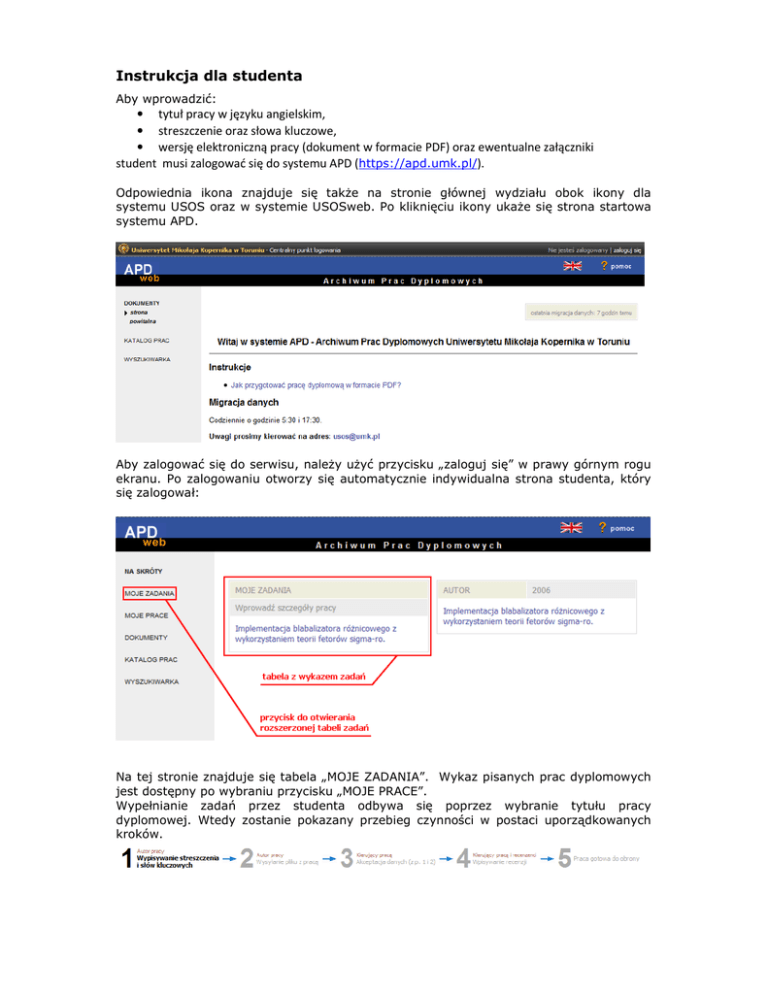 Instrukcja dla studenta Aby wprowadzić: • tytuł pracy w języku angielskim, • streszczenie oraz słowa kluczowe, • wersję elektroniczną pracy (dokument w formacie PDF) oraz ewentualne załączniki student musi zalogować się do systemu APD (https://apd.umk.pl/). Odpowiednia ikona znajduje się także na stronie głównej wydziału obok ikony dla systemu USOS oraz w systemie USOSweb. Po kliknięciu ikony ukaże się strona startowa systemu APD. Aby zalogować się do serwisu, należy użyć przycisku „zaloguj się” w prawy górnym rogu ekranu. Po zalogowaniu otworzy się automatycznie indywidualna strona studenta, który się zalogował: Na tej stronie znajduje się tabela „MOJE ZADANIA”. Wykaz pisanych prac dyplomowych jest dostępny po wybraniu przycisku „MOJE PRACE”. Wypełnianie zadań przez studenta odbywa się poprzez wybranie tytułu pracy dyplomowej. Wtedy zostanie pokazany przebieg czynności w postaci uporządkowanych kroków. KROK 1 – Wpisywanie streszczenia i słów kluczowych System czeka na wprowadzenie przez autora pracy streszczenia (w polu Streszczenie) i słów kluczowych (w polu Słowa kluczowe). Powinno to być streszczenie i słowa kluczowe zamieszczone w papierowej i elektronicznej wersji pracy. Po wypełnieniu pól należy zatwierdzić zmiany (służy do tego przycisk ZAPISZ). Wybranie przycisku „ZAPISZ” pozwala na przejście do kolejnego kroku. KROK 2 – Wysłanie pliku z pracą dyplomową System czeka na przesłanie przez autora pracy pliku z elektroniczną wersją pracy. Praca powinna mieć format PDF, czyli nadawać się do odczytania programem Acrobat Reader. Instrukcja „Jak przygotować pracę dyplomową w formacie PDF?” jest dostępna na stronie głównej aplikacji APD. UWAGA: Zaleca się, aby plik na dysku lokalnym komputera nie zawierał spacji w nazwie oraz nie znajdował się w folderze posiadającycm spacje. Zapisany plik będzie pojawiał się na liście wszystkich plików dołączonych do pracy dyplomowej. Do czasu zakończenia etapu wysyłania, autor pracy obok każdej nazwy pliku zobaczy dostępną ikonę służącą do usunięcia go z repozytorium. System oczekuje, że po wgraniu wszystkich plików (dodatkowe załączniki wysyłamy w postaci archiwum ZIP), autor potwierdzi, że operacja przesyłania plików została zakończona (służy to tego przycisk WYSŁANO WSZYSTKIE PLIKI). Przycisk „POPRAW DANE PRACY” służy do poprawienia tytułu w wersji angielskiej oraz streszczenia i słów kluczowych, jeśli opiekun pracy uznał, że należy je poprawić. Po zakończeniu pracy w systemie APD należy się wylogować. Służy do tego przycisk „WYLOGUJ SIĘ” w prawym górnym rogu ekranu.