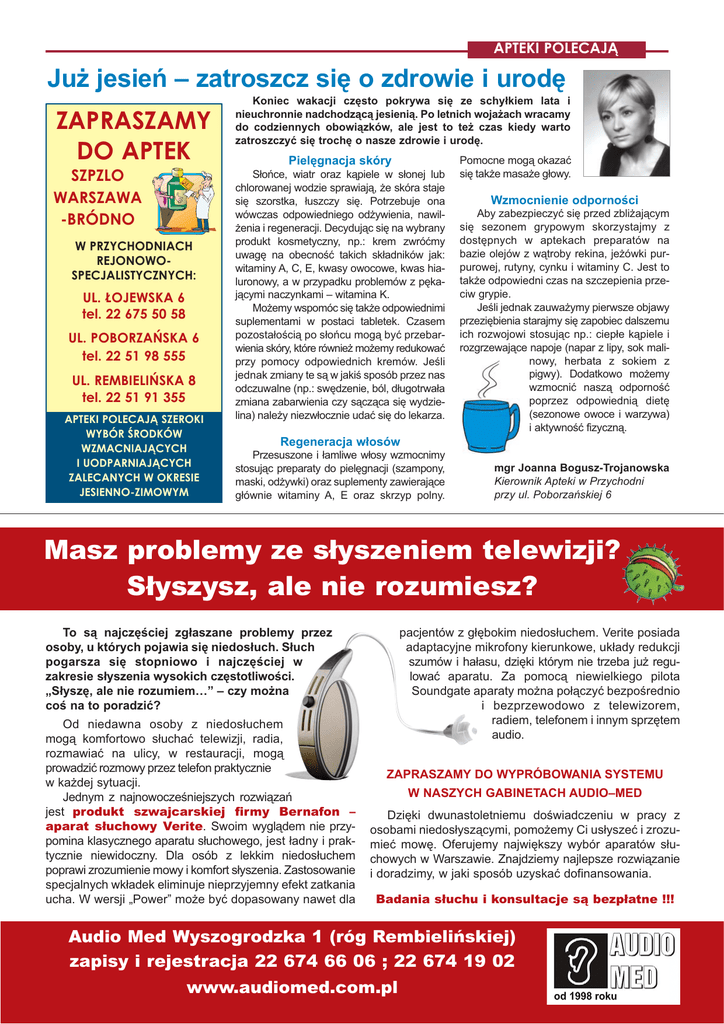 APTEKI POLECAJĄ Już jesień – zatroszcz się o zdrowie i urodę ZAPRASZAMY DO APTEK SZPZLO WARSZAWA -BRÓDNO W PRZYCHODNIACH REJONOWOSPECJALISTYCZNYCH: UL. ŁOJEWSKA 6 tel. 22 675 50 58 UL. POBORZAŃSKA 6 tel. 22 51 98 555 UL. REMBIELIŃSKA 8 tel. 22 51 91 355 APTEKI POLECAJĄ SZEROKI WYBÓR ŚRODKÓW WZMACNIAJĄCYCH I UODPARNIAJĄCYCH ZALECANYCH W OKRESIE JESIENNO-ZIMOWYM Koniec wakacji często pokrywa się ze schyłkiem lata i nieuchronnie nadchodzącą jesienią. Po letnich wojażach wracamy do codziennych obowiązków, ale jest to też czas kiedy warto zatroszczyć się trochę o nasze zdrowie i urodę. Pielęgnacja skóry Słońce, wiatr oraz kąpiele w słonej lub chlorowanej wodzie sprawiają, że skóra staje się szorstka, łuszczy się. Potrzebuje ona wówczas odpowiedniego odżywienia, nawilżenia i regeneracji. Decydując się na wybrany produkt kosmetyczny, np.: krem zwróćmy uwagę na obecność takich składników jak: witaminy A, C, E, kwasy owocowe, kwas hialuronowy, a w przypadku problemów z pękającymi naczynkami – witamina K. Możemy wspomóc się także odpowiednimi suplementami w postaci tabletek. Czasem pozostałością po słońcu mogą być przebarwienia skóry, które również możemy redukować przy pomocy odpowiednich kremów. Jeśli jednak zmiany te są w jakiś sposób przez nas odczuwalne (np.: swędzenie, ból, długotrwała zmiana zabarwienia czy sącząca się wydzielina) należy niezwłocznie udać się do lekarza. Pomocne mogą okazać się także masaże głowy. Wzmocnienie odporności Aby zabezpieczyć się przed zbliżającym się sezonem grypowym skorzystajmy z dostępnych w aptekach preparatów na bazie olejów z wątroby rekina, jeżówki purpurowej, rutyny, cynku i witaminy C. Jest to także odpowiedni czas na szczepienia przeciw grypie. Jeśli jednak zauważymy pierwsze objawy przeziębienia starajmy się zapobiec dalszemu ich rozwojowi stosując np.: ciepłe kąpiele i rozgrzewające napoje (napar z lipy, sok malinowy, herbata z sokiem z pigwy). Dodatkowo możemy wzmocnić naszą odporność poprzez odpowiednią dietę (sezonowe owoce i warzywa) i aktywność fizyczną. Regeneracja włosów Przesuszone i łamliwe włosy wzmocnimy stosując preparaty do pielęgnacji (szampony, maski, odżywki) oraz suplementy zawierające głównie witaminy A, E oraz skrzyp polny. mgr Joanna Bogusz-Trojanowska Kierownik Apteki w Przychodni przy ul. Poborzańskiej 6 Masz problemy ze słyszeniem telewizji? Słyszysz, ale nie rozumiesz? To są najczęściej zgłaszane problemy przez osoby, u których pojawia się niedosłuch. Słuch pogarsza się stopniowo i najczęściej w zakresie słyszenia wysokich częstotliwości. „Słyszę, ale nie rozumiem…” – czy można coś na to poradzić? Od niedawna osoby z niedosłuchem mogą komfortowo słuchać telewizji, radia, rozmawiać na ulicy, w restauracji, mogą prowadzić rozmowy przez telefon praktycznie w każdej sytuacji. Jednym z najnowocześniejszych rozwiązań jest produkt szwajcarskiej firmy Bernafon – aparat słuchowy Verite. Swoim wyglądem nie przypomina klasycznego aparatu słuchowego, jest ładny i praktycznie niewidoczny. Dla osób z lekkim niedosłuchem poprawi zrozumienie mowy i komfort słyszenia. Zastosowanie specjalnych wkładek eliminuje nieprzyjemny efekt zatkania ucha. W wersji „Power” może być dopasowany nawet dla pacjentów z głębokim niedosłuchem. Verite posiada adaptacyjne mikrofony kierunkowe, układy redukcji szumów i hałasu, dzięki którym nie trzeba już regulować aparatu. Za pomocą niewielkiego pilota Soundgate aparaty można połączyć bezpośrednio i bezprzewodowo z telewizorem, radiem, telefonem i innym sprzętem audio. ZAPRASZAMY DO WYPRÓBOWANIA SYSTEMU W NASZYCH GABINETACH AUDIO–MED Dzięki dwunastoletniemu doświadczeniu w pracy z osobami niedosłyszącymi, pomożemy Ci usłyszeć i zrozumieć mowę. Oferujemy największy wybór aparatów słuchowych w Warszawie. Znajdziemy najlepsze rozwiązanie i doradzimy, w jaki sposób uzyskać dofinansowania. Badania słuchu i konsultacje są bezpłatne !!! Audio Med Wyszogrodzka 1 (róg Rembielińskiej) zapisy i rejestracja 22 674 66 06 ; 22 674 19 02 www.audiomed.com.pl