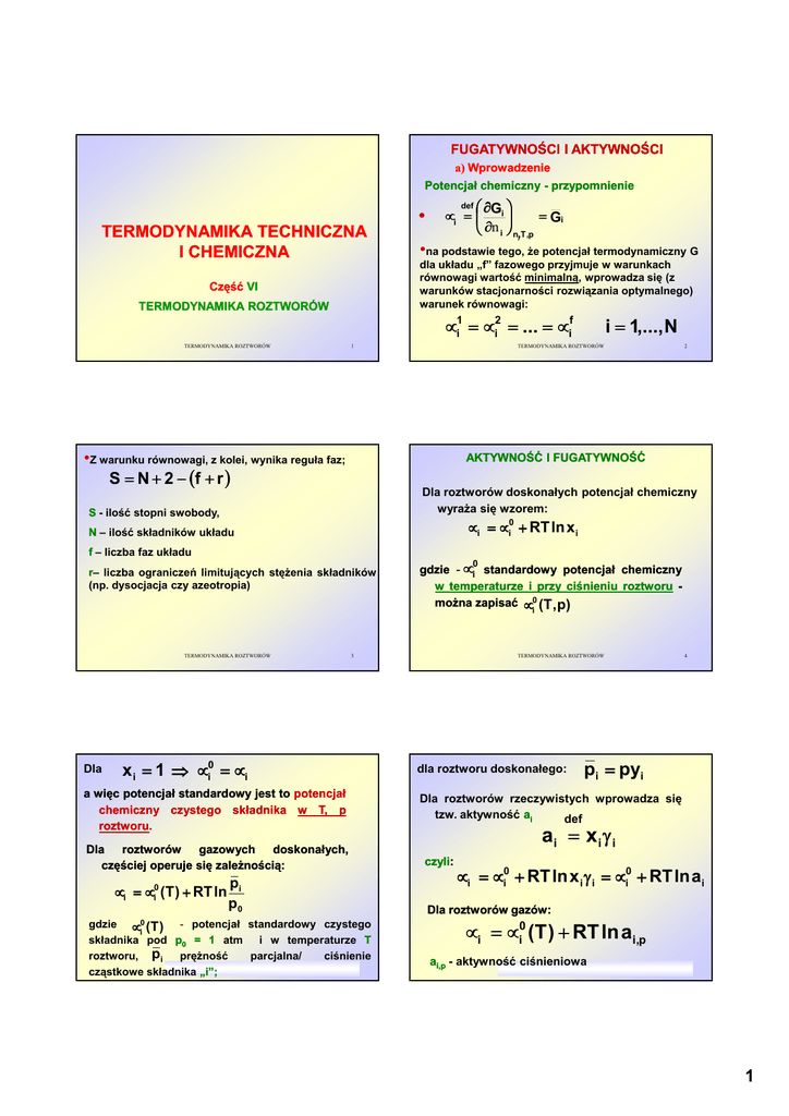 FUGATYWNOŚCI I AKTYWNOŚCI a) Wprowadzenie Potencjał chemiczny - przypomnienie TERMODYNAMIKA TECHNICZNA I CHEMICZNA Część VI TERMODYNAMIKA ROZTWORÓW def ∂ G µi = i = Gi ∂n i n,T ,p j •na podstawie tego, że potencjał termodynamiczny G dla układu „f” fazowego przyjmuje w warunkach równowagi wartość minimalną, wprowadza się (z warunków stacjonarności rozwiązania optymalnego) warunek równowagi: 1 2 f i i i µ = µ = ... = µ TERMODYNAMIKA ROZTWORÓW 1 •Z warunku równowagi, z kolei, wynika reguła faz; S = N + 2 − (f + r ) i = 1,..., N TERMODYNAMIKA ROZTWORÓW 2 AKTYWNOŚĆ I FUGATYWNOŚĆ Dla roztworów doskonałych potencjał chemiczny wyraża się wzorem: S - ilość stopni swobody, µi = µi0 + RT ln x i N – ilość składników układu f – liczba faz układu r– liczba ograniczeń limitujących stężenia składników (np. dysocjacja czy azeotropia) gdzie - µ i standardowy potencjał chemiczny w temperaturze i przy ciśnieniu roztworu można zapisać µ 0 (T , p) 0 i TERMODYNAMIKA ROZTWORÓW Dla 3 x i = 1 ⇒ µ i0 = µ i a więc potencjał standardowy jest to potencjał chemiczny czystego składnika w T, p roztworu.. roztworu Dla roztworów gazowych doskonałych, częściej operuje się zależnością: zależnością: p µ i = µ (T ) + RT ln i p0 0 i gdzie µ 0 (T ) - potencjał standardowy czystego i składnika pod p0 = 1 atm i w temperaturze T roztworu, pi prężność parcjalna/ ciśnienie TERMODYNAMIKA ROZTWORÓW 5 cząstkowe składnika „i”; „i”; TERMODYNAMIKA ROZTWORÓW dla roztworu doskonałego: 4 pi = pyi Dla roztworów rzeczywistych wprowadza się tzw. aktywność ai def ai = x i γ i czyli:: czyli µ i = µ i0 + RT ln x i γ i = µ i0 + RT ln ai Dla roztworów gazów gazów:: 0 i i µ = µ (T ) + RT ln ai,p ai,p - aktywność TERMODYNAMIKA ciśnieniowa ROZTWORÓW 6 1 Do określenia wartości aktywności, należy wprowadzić definicyjnie pewien stan odniesienia (początkowy). Najczęściej przyjmuje się: c) stan gazu doskonałego, dla gazów ai,p = pi gdy pi → 0 ; p → 0 lub y i → 0 p0 a) stan substancji czystej – dla cieczy i c. stałego, Stan początkowy określa jednoznacznie stan standardowy.. standardowy ai = 1 gdy x i = 1 Ten stan początkowy jest identyczny ze stanem standardowym b) stan roztworu nieskończenie rozcieńczonego, dla cieczy, c. stałego i gazów a i = 1 gdy x i → 0 TERMODYNAMIKA ROZTWORÓW Dla dwu pierwszych definicji stanu początkowego, stan standardowy zależy od T i P, natomiast dla trzeciej tylko od T (bo ). 7 TERMODYNAMIKA ROZTWORÓW 8 − Fugatywność:: Fugatywność Izotermiczna zmiana potencjału chemicznego od ciśnienia p do p0 dla składnika gazowego w roztworze doskonałym wyraża się wzorem wzorem:: µ i,1 − µ i,0 = RT (− ln p 0 yi py p + ln i ) = RT ln p0 p0 p0 µ i,1 − µ i,0 przy warunku warunku:: TERMODYNAMIKA ROZTWORÓW − f lim i = 1 p ⇒ 0 py i Dla czystego gazu „ii” mamy: (ponieważ potencjały standardowe są identyczne) Wychodząc z tego zapisu Lewis zdefiniował analogicznie fugatywność rozpatrując zmianę potencjału chemicznego składnika w fazie gazowej, ciekłej i stałej. f = RT ln 0i fi µ i,1 − µ i,0 = RT ln przy: lim p⇒ 0 9 fi fi0 fi =1 p TERMODYNAMIKA ROZTWORÓW 10 Uwaga:: używa się głównie do f.gazowej Uwaga •czyli fugatywność czystego gazu jest równa ciśnieniu dla (bardzo) niskich ciśnień •fugatywność • fugatywność •fugatywność standardowa odniesiona jest do tych samych warunków co potencjał chemiczny składnika ciśnieniu parcjalnemu w mieszaninie – spełnia te same zależności co potencjał chemiczny Uwagi:: Uwagi Obliczanie fugatywności czystych gazów •fugatywność ma wymiar ciśnienia Ponieważ: •używa się też współczynnika fugatywności − f − f Φi = i ; Φi = i p pyi TERMODYNAMIKA ROZTWORÓW to : 11 δGi = vi δp T δ G− − i = vi δp T ,x TERMODYNAMIKA ROZTWORÓW 12 2 − − Czyli:: Czyli f Gi ≡ µ i = µ + RT ln 0i fi 0 i − δ G− − δ ln fi i = RT ( ) T ,x = v i δp δp T ,x dla T, x =const. =const. − RTd ln(pyi ) = vi * dp (** (**) odejmujemy (*) i (**) − dla czystych gazów RTd ln(f i / p) = ( v − v *)dp − RTd ln fi = vi dp (*) z 1 RTd ln(f i / p) = RT − dp p p dla gazów doskonałych − − RTd ln fi * = vi * dp TERMODYNAMIKA ROZTWORÓW ln − RT d ln( f i / pyi ) = (vi − vi *)dp ∫ d ln(f i / p) = ∫ 13 fg z −1 dp = −∫ p p z −1 dp p TERMODYNAMIKA ROZTWORÓW lub równanie Lee-Kesslera: fg p (0) 14 fg ; p (1) Rozwiązanie graficzne Roztwory Gazowe (parowe) fg p dla [T, x] Tr d ln f i = f i , vi vi dp RT - składnik „i” w roztworze całkujemy od p*(gaz doskonały) do p RT ln TERMODYNAMIKA ROZTWORÓW ponieważ dla RT ln dla yi = 1 RT ln Pr 15 ∗ p ∗ ⇒ f i = yi ⋅ p ∗ TERMODYNAMIKA ROZTWORÓW 16 Roztwór doskonały (choć składniki mogą być niedoskonałe) p fi = ∫ vi dp p ⋅ yi p ∗ fi vi = vi ⇒ RT ln = 0 fi ⋅ yi ∗ (czysta substancja „i”) p fi = ∫ vi dp ∗ p p∗ fi p = ∫ vi dp ∗ f i p∗ f i = fi ⋅ yi Reguła Randalla Randalla--Lewisa vi – objętość molowa po odjęciu: fi p∗ p RT ln ∗ ⋅ = ∫ (vi − vi ) dp p ⋅ yi fi p∗ TERMODYNAMIKA ROZTWORÓW 17 TERMODYNAMIKA ROZTWORÓW 18 3 Metoda graficzna obliczania fugatywności składnika w roztworze f− ln i pyi jest cząstkową molową ln fm p funkcją ln ln f1 y1p f2 y 2p Y1 ln TERMODYNAMIKA ROZTWORÓW f p 19 CIECZ fm n TERMODYNAMIKA ROZTWORÓW 20 Przy założeniu, że: vic = const Ciecz będąca w równowadze ze swoją parą ma fugatywność równą fugatywności tej pary, czyli: fic = fig dla p = pic Natomiast, gdy p > pci (brak równowagi) fugatywność cieczy oblicza się z wzoru podstawowego: c c ( ) czyli, że objętość molowa czystego składnika nie zależy od ciśnienia ciśnienia:: c całkując w granicach od p i do p . otrzymujemy:: otrzymujemy ln RT d ln f i = vi dp Jeżeli xi = 1 to to:: d ln fic = vic dp RT 21 Uwaga: bardzo podobną zależnoś