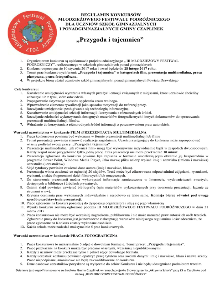 REGULAMIN KONKURSÓW III MŁODZIEŻOWEGO FESTIWALU PODRÓŻNICZEGO DLA UCZNIÓW SZKÓŁ GIMNAZJALNYCH I PONADGIMNAZJALNYCH GMINY CZAPLINEK „Przygoda i tajemnica” Postanowienia ogólne. 1. 2. 3. 4. Organizatorem konkursu są opiekunowie projektu edukacyjnego „ III MŁODZIEŻOWY FESTIWAL PODROŻNICZY”, realizowanego w szkołach gimnazjalnych ponad gimnazjalnych Konkurs rozpoczyna się 10 stycznia 2017 roku i trwać będzie do 28 lutego 2017 roku. Temat prac konkursowych brzmi: „Przygoda i tajemnica” w kategoriach film, prezentacja multimedialna, praca plastyczna, praca fotograficzna. W projekcie biorą udział uczniowie szkół gimnazjalnych i ponad gimnazjalnych Powiatu Drawskiego Cele konkursu: 1. Kształcenie umiejętności wyrażania własnych przeżyć i emocji związanych z miejscami, które uczniowie chcieliby zobaczyć lub z tymi, które odwiedzili. 2. Propagowanie aktywnego sposobu spędzania czasu wolnego. 3. Wprowadzenie elementu rywalizacji jako sposobu motywacji do twórczej pracy. 4. Rozwijanie umiejętności posługiwania się technologią informacyjną; 5. Kształtowanie umiejętności selekcji informacji i korzystania z różnorodnych źródeł. 6. Rozwijanie zdolności wykorzystania dostępnych materiałów fotograficznych i innych dokumentów do opracowania prezentacji multimedialnej, filmów. 7. Wdrażanie do korzystania z różnorodnych źródeł informacji z poszanowaniem praw autorskich, Warunki uczestnictwa w konkursie FILM /PRZEZENTACJA MULTIMEDIALNA 1. Praca konkursowa powinna być wykonana w formie prezentacji multimedialnej lub filmu 2. Temat prezentacji powinien stanowić realizację zagadnienia. Uczeń przystępujący do konkursu może zaproponować własny podtytuł swojej pracy. „Przygoda i tajemnica” 3. Prezentacje multimedialne, jak również film- mogą być wykonywane indywidualnie bądź w zespołach dwuosobowych. Każdy zespół może przygotować tylko jedną pracę. Czas prezentacji nie może przekraczać 10 minut. 4. Prezentacja zgłoszona do konkursu powinna być zapisana w formacie umożliwiającym otwarcie jej bezpośrednio w programie Power Point, Windows Media Player, Jako nazwę pliku należy wpisać imię i nazwisko (imiona i nazwiska) uczestnika (uczestników). 5. Slajd tytułowy powinien zawierać dane autora (imię i nazwisko, klasa). 6. Prezentacja winna zawierać co najmniej 20 slajdów. Treść może być zilustrowana odpowiednimi zdjęciami, rysunkami, rycinami, a także fragmentami dzieł filmowych i/lub muzycznych. 7. Do stworzenia prezentacji można wykorzystać informacje zamieszczone w Internecie, wydawnictwach zwartych, dostępnych w bibliotece i źródłach prywatnych. 8. Ostatni slajd powinien zawierać bibliografię (spis materiałów wykorzystanych przy tworzeniu prezentacji, łącznie ze stronami www). 9. Kryteria oceniania prac wykonanych indywidualnie i zespołowo są takie same. Komisja bierze również pod uwagę sposób przedstawienia prezentacji. 10. Prace zgłoszone na konkurs pozostają do dyspozycji organizatora i stają się jego własnością 11. Wyniki konkursu zostaną ogłoszone podczas III MŁODZIEŻOWEGO FESTIWALU PODRÓŻNICZEGO w dniu 31 marca 2017 12. Praca konkursowa nie może być wcześniej nagrodzona, publikowana i nie może naruszać praw autorskich osób trzecich. Zgłoszenie pracy do konkursu jest jednoznaczne z akceptacją warunków niniejszego regulaminu i oświadczeniem, że prace zgłoszone na Konkurs zostały wykonane osobiście. 13. Każda szkoła może nadesłać maksymalnie 5 prac konkursowych. Warunki uczestnictwa w konkursie PRACA FOTOGRAFICZNA 1. 2. 3. 4. 5. Praca konkursowa to maksymalnie 5 zdjęć o dowolnym formacie. Temat pracy: „Przygoda i tajemnica”. Prace przekazane na konkurs muszą być pracami własnymi, wcześniej niepublikowanymi. Każdy z uczniów może przekazać tylko 1 pakiet zdjęć dowolnego formatu. Każdy uczestnik konkursu powinien opatrzyć pracę tytułem oraz swoimi danymi: imię i nazwisko, klasa i nazwa szkoły. Prace niepodpisane, anonimowe nie będą zakwalifikowane do konkursu. Dane osobowe uczestników pozyskane są wyłącznie do celów Konkursu i nie będą udostępniane podmiotom trzecim. Działanie jest współfinansowane ze środków Gminy Czaplinek w ramach projektu Stowarzyszenia „Aktywna Szkoła” przy ZS w Czaplinku pod nazwą „III MŁODZIEŻOWY FESTIWAL PODRÓŻNICZY” 6. 7. 8. 9. Biorąc udział w konkursie, uczestnik akceptuje jego regulamin. Naruszenie przez uczestnika konkursu któregokolwiek z warunków konkursu oznaczać będzie niezakwalifikowanie pracy do konkursu lub utratę prawa do nagrody. Prace przekazane na konkurs stają się własnością organizatora. Każda szkoła przesyła max. 5 zestawów prac. Warunki uczestnictwa w konkursie PRACA PLASTYCZNA 1. 2. 3. 4. 5. 6. 7. 8. 9. Praca konkursowa ma być pracą plastyczną wykonaną w dowolnej technice. Temat pracy: „Przygoda i tajemnica” Prace przekazane na konkurs muszą być pracami własnymi, wykonanymi dowolną techniką, wcześniej niepublikowanymi. Każdy z uczniów może przekazać tylko jedną pracę formatu od 10cm/14,8 cm - A-4. Każdy uczestnik konkursu powinien opatrzyć pracę tytułem oraz swoimi danymi: imię i nazwisko, klasa i nazwa szkoły. Prace niepodpisane, anonimowe nie będą zakwalifikowane do konkursu. Dane osobowe uczestników pozyskane są wyłącznie do celów Konkursu i nie będą udostępniane podmiotom trzecim. Biorąc udział w konkursie, uczestnik akceptuje jego regulamin. Naruszenie przez uczestnika konkursu któregokolwiek z warunków konkursu oznaczać będzie niezakwalifikowanie pracy do konkursu lub utratę prawa do nagrody. Prace przekazane na konkurs stają się własnością organizatora. Każda szkoła może przesłać max.5 prac Termin nadsyłania prac Prace należy dostarczyć do : Prace gimnazjalne - Barbara Kowalczyk Gimnazjum w Czaplinku tel.607128530 Prace ponadgimnazjalne Marta Gańska ZSP Czaplinek tel. 783 5