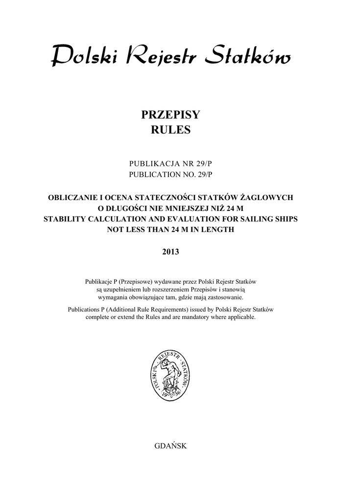 PRZEPISY RULES PUBLIKACJA NR 29/P PUBLICATION NO. 29/P OBLICZANIE I OCENA STATECZNOŚCI STATKÓW ŻAGLOWYCH O DŁUGOŚCI NIE MNIEJSZEJ NIŻ 24 M STABILITY CALCULATION AND EVALUATION FOR SAILING SHIPS NOT LESS THAN 24 M IN LENGTH 2013 Publikacje P (Przepisowe) wydawane przez Polski Rejestr Statków są uzupełnieniem lub rozszerzeniem Przepisów i stanowią wymagania obowiązujące tam, gdzie mają zastosowanie. Publications P (Additional Rule Requirements) issued by Polski Rejestr Statków complete or extend the Rules and are mandatory where applicable. GDAŃSK PRZEPISY RULES PUBLIKACJA NR 29/P PUBLICATION NO. 29/P OBLICZANIE I OCENA STATECZNOŚCI STATKÓW ŻAGLOWYCH O DŁUGOŚCI NIE MNIEJSZEJ NIŻ 24 M STABILITY CALCULATION AND EVALUATION FOR SAILING SHIPS NOT LESS THAN 24 M IN LENGTH 2013 GDAŃSK Publikacja Nr 29/P – Obliczanie i ocena stateczności statków żaglowych o długości nie mniejszej niż 24 m stanowi rozszerzenie wymagań Części IV – Stateczności niezatapialność, Przepisów klasyfikacji i budowy statków morskich. Publikacja ta została zatwierdzona przez Zarząd PRS S.A. w dniu 12 lipca 2013 r. i wchodzi w życie z dniem 15 lipca 2013 r. Niniejsza Publikacja zastępuje Publikację Nr 29/P – Obliczanie i ocena stateczności statków żaglowych o długości powyżej 20 m – 1996. Publication Nr 29/P – Stability Calculation and Evaluation for Sailing Ships Not Less than 24 m in Length is an extension of the requirements contained in Part IV – Stability and Subdivision of the Rules for the Classification and Construction of Sea-Going Ships. The Publication was approved by the PRS Board on 12 July 2013 and enters into force on 15 July 2013. The present Publication replaces Publication No. 29/P – Stability Calculation and Evaluation for Sailing Ships Above 20 m in Length – 1996 © Copyright by Polski Rejestr Statków S.A., 2013 PRS/AW, 07/2013 SPIS TREŚCI str. 1 Postanowienia ogólne .............................................................................................. 1.1 Zakres zastosowania ......................................................................................... 1.2 Podstawowe założenia i zasady ........................................................................ 1.3 Określenia ......................................................................................................... 1.4 Zakres nadzoru ................................................................................................. 5 5 5 5 7 2 Ogólne wymagania techniczne ............................................................................... 2.1 Zakres dokumentacji ......................................................................................... 2.2 Obliczanie powierzchni nawiewu ..................................................................... 2.3 Oblodzenie ........................................................................................................ 2.4 Obliczenia wpływu wolnych powierzchni cieczy ............................................. 2.5 Obliczenia pantokaren ...................................................................................... 2.6 Informacja o stateczności ................................................................................. 2.7 Próba przechyłów ............................................................................................. 7 7 8 9 10 10 11 12 3 Kryteria oceny stateczności .................................................................................... 3.1 Stateczność statku ze zwiniętymi żaglami ........................................................ 3.2 Stateczność statku z podniesionymi żaglami ................................................... 13 13 15 4 Stateczność w stanie uszkodzonym ........................................................................ 16 CONTENTS Page 1 General ..................................................................................................................... 1.1 Application ....................................................................................................... 1.2 Basic Assumptions and Principles .................................................................... 1.3 Definitions ........................................................................................................ 1.4 Scope of Surveys .............................................................................................. 19 19 19 19 20 2 General Technical Requirements .......................................................................... 2.1 Scope of Documentation ................................................................................... 2.2 Calculation of Windage Area ........................................................................... 2.3 Icing .................................................................................................................. 2.4 Calculation of a Free Surface Effect on Ship’s Stability .................................. 2.5 Calculation of Cross Curves of Stability .......................................................... 2.6 Stability Booklet ............................................................................................... 2.7 Inclining Test .................................................................................................... 21 21 22 23 23 24 24 26 3 Criteria for Stability Evaluation ............................................................................ 3.1 Stability of a Ship with Furled Sails ................................................................. 3.2 Stability of a Ship with Spread Sails ................................................................ 26 26 29 4 Damage Stability ..................................................................................................... 30 1 1.1 POSTANOWIENIA OGÓLNE Zakres zastosowania 1.1.1 Niniejsze wymagania mają zastosowanie do wypornościowych pełnopokładowych 