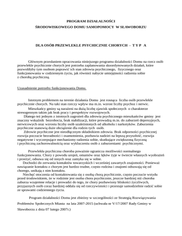 PROGRAM DZIAŁALNOŚCI ŚRODOWISKOWEGO DOMU SAMOPOMOCY W SŁAWOBORZU DLA OSÓB PRZEWLEKLE PSYCHICZNIE CHORYCH - T Y P A Głównym przesłaniem opracowania niniejszego programu działalności Domu na rzecz osób przewlekle psychicznie chorych jest potrzeba zaplanowania skoordynowanych działań, które pozwoliłyby tym osobom poprawić ich stan zdrowia psychicznego, fizycznego oraz funkcjonowania w codziennym życiu, jak również nabycie umiejętności radzenia sobie z chorobą psychiczną. Uzasadnienie potrzeby funkcjonowania Domu. Istotnym problemem na terenie działania Domu jest rosnąca liczba osób przewlekle psychicznie chorych. Na taki stan rzeczy wpływ ma m.in. wzrost liczby psychoz i nerwic. Mieszkańcy gminy są narażeni na dużą liczbę zjawisk społecznych o charakterze stresogennym takim jak brak pracy i perspektyw rozwojowych. Dlatego też jednym z istotnych zagrożeń dla zdrowia psychicznego mieszkańców gminy jest znaczny wskaźnik bezrobocia, brak stabilizacji, które prowadzą m.in. do zaburzeń depresyjnych, nerwicowych oraz wzrostu liczby osób uzależnionych od alkoholu i narkotyków. Zaburzenia psychiczne stanowią duże obciążenie dla rodzin tych osób. Zdrowie psychiczne jest nieodłącznym składnikiem zdrowia. Brak odporności psychicznej rozwija poczucie bezradności i osamotnienia, pozbawia nadziei na lepszą przyszłość, rozwija negatywne i wyczerpujące mechanizmy radzenia sobie, skutkujące zwiększoną fizyczną i psychiczną zachorowalnością oraz wykluczeniu osób z zaburzeniami psychicznymi. Przewlekła psychiczna choroba poważnie ogranicza możliwości normalnego funkcjonowania. Chory z powodu urojeń, omamów oraz lęków żyje w świecie własnych wyobrażeń i przeżyć, odsuwa się od innych oraz zamyka się w sobie. Dochodzi do zerwania kontaktów towarzyskich i wcześniej zawartych znajomości. Ponieważ nawiązanie kontaktu z chorym jest bardzo trudne, często rodzina i znajomi odsuwają się od chorego, unikają z nim kontaktu. Niechęć otoczenia od kontaktowania się z osobą chorą psychicznie, często poczucie wstydu przed środowiskiem, że w rodzinie jest osoba chora psychicznie, jeszcze bardziej niż choroba zaburza wzajemne relacje i prowadzi do tego, że chory pozbawiony bliskości życzliwych, przyjaznych osób coraz bardziej oddala się od rzeczywistości i przestaje samodzielnie radzić sobie ze sprawami codziennego życia. Program działalności Domu jest zbieżny w szczególności ze Strategią Rozwiązywania Problemów Społecznych Miasta na lata 2007-2015 (uchwała nr V/17/2007 Rady Gminy w Sławoborzu z dnia 07 lutego 2007r.) Realizacja tego programu przy współudziale środków Wojewody Zachodniopomorskiego pozwoli na znacznym zmniejszeniu liczby hospitalizacji osób z zaburzeniami psychicznymi, w miarę samodzielnego ich funkcjonowania w środowisku społeczności lokalnej oraz ich integracji społecznej. Ogólna charakterystyka funkcjonowania Domu. Zgodnie z Regulaminem organizacyjnym Środowiskowego Domu Samopomocy w Sławoborzu, Dom jest ośrodkiem wsparcia prowadzonym w formie placówki dziennego pobytu i skierowanym do osób z zaburzeniami psychicznymi zwanych uczestnikami, które w wyniku upośledzenia niektórych funkcji organizmu lub zdolności adaptacyjnych wymagają pomocy w zakresie przystosowania do życia w środowisku rodzinnym i społecznym, w szczególności w celu zwiększenia zaradności i samodzielności życiowej, a także ich integracji społecznej. Dom w szczególności zapewnia: 1. Niezbędną opiekę. 2. Prowadzenie z uczestnikami zajęć terapeutycznych pobudzających ich do realizacji swoich celów rozwijających zdolności do dokonywania własnych wyborów i podejmowania decyzji, włączanie ich w sytuacje interpersonalne, które poprawiłyby funkcjonowanie społeczne. 3. Uczestnictwo uczestników w terapii zajęciowej rozwijającej ich indywidualne zainteresowania, zdolność manualną oraz umiejętność wykonywania różnorodnych prac, w tym również prace związane z prowadzeniem gospodarstwa domowego. 4. Zajęcia indywidualne utrwalające i rozwijające nawyki codziennej samoobsługi: higiena osobista, pranie, prasowanie, dbanie o czystość i porządek w najbliższym otoczeniu. 5. Dom zapewnia także prowadzenie treningów w zakresie: a) funkcjonowania w codziennym życiu, w tym trening dbałości o wygląd zewnętrzny, trening nauki higieny, trening kulinarny, trening umiejętności praktycznych, trening ekonomiczny, b) trening umiejętności interpersonalnych i rozwiązywania problemów, w tym kształtowania pozytywnych relacji uczestnika z osobami w różnych relacjach i okolicznościach dnia codziennego, c) trening umiejętności spędzania czasu wolnego, w tym rozwijanie zainteresowań literaturą, audycjami radiowymi, telewizyjnymi, internetem, udział w spotkaniach towarzyskich i kulturalnych. 6. Rehabilitację i podnoszenie sprawności ogólnej poprzez udział w gimnastyce, uczestnictwo w zajęciach rekreacyjno-sportowych oraz turnusach rehabilitacyjnych. 7. Organizowanie spotkań towarzyskich oraz imprez kulturalno – rekreacyjnych integrujących uczestników i dostarczających im różnorodnych przeżyć. 8. Prowadzenie wsparcia i poradnictwa dla rodzin uczestników. 9. Pomoc uczestnikom w załatwianiu ważnych spraw osobistych oraz socjalnych, w tym pomoc w ewentualnym zatrudnieniu. W Domu jest prowadzona terapia zajęciowa i rehabilitacja społeczna, które są realizowane m.in. poprzez udział uczestników w zajęciach na pracowniach terapeutycznych prowadzonych przez terapeutów zajęciowych np. m.in. zajęcia plastyczne, rękodzielnictwo, szycie i wyszywanie, mała poligrafia oraz zajęcia kulinarne w ramach, których Uczestnicy uczą się wykonywać posiłki, nakrywać do stołu, czy zmywać naczynia. W zakresie tak zwanego uspołeczniania Uczestnicy mają trening z zakresu umiejętności społecznych – m.in. uczą się robić zakupy, uczestniczyć w życiu spo