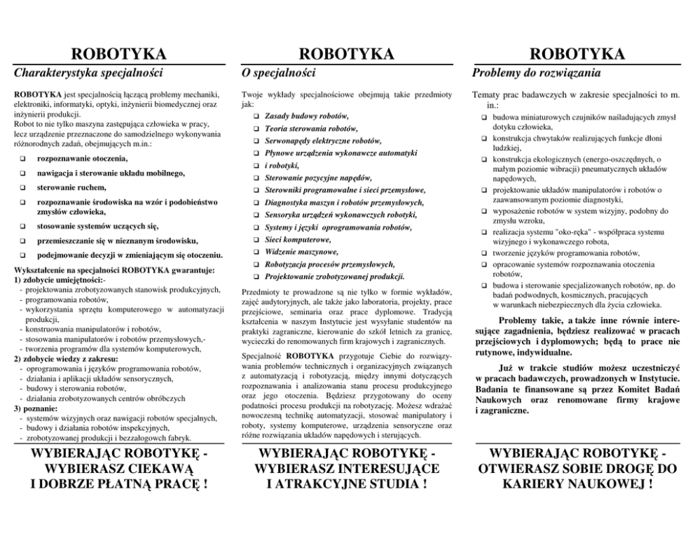ROBOTYKA ROBOTYKA ROBOTYKA Charakterystyka specjalności O specjalności Problemy do rozwiązania ROBOTYKA jest specjalnością łączącą problemy mechaniki, elektroniki, informatyki, optyki, inżynierii biomedycznej oraz inżynierii produkcji. Robot to nie tylko maszyna zastępująca człowieka w pracy, lecz urządzenie przeznaczone do samodzielnego wykonywania różnorodnych zadań, obejmujących m.in.: Twoje wykłady specjalnościowe obejmują takie przedmioty jak: Zasady budowy robotów, Tematy prac badawczych w zakresie specjalności to m. in.: Teoria sterowania robotów, Serwonapędy elektryczne robotów, Płynowe urządzenia wykonawcze automatyki i robotyki, rozpoznawanie otoczenia, nawigacja i sterowanie układu mobilnego, sterowanie ruchem, rozpoznawanie środowiska na wzór i podobieństwo zmysłów człowieka, stosowanie systemów uczących się, Sterowanie pozycyjne napędów, Sterowniki programowalne i sieci przemysłowe, Diagnostyka maszyn i robotów przemysłowych, Sensoryka urządzeń wykonawczych robotyki, przemieszczanie się w nieznanym środowisku, Systemy i języki oprogramowania robotów, Sieci komputerowe, podejmowanie decyzji w zmieniającym się otoczeniu. Wykształcenie na specjalności ROBOTYKA gwarantuje: 1) zdobycie umiejętności:- projektowania zrobotyzowanych stanowisk produkcyjnych, - programowania robotów, - wykorzystania sprzętu komputerowego w automatyzacji produkcji, - konstruowania manipulatorów i robotów, - stosowania manipulatorów i robotów przemysłowych,- tworzenia programów dla systemów komputerowych, 2) zdobycie wiedzy z zakresu: - oprogramowania i języków programowania robotów, - działania i aplikacji układów sensorycznych, - budowy i sterowania robotów, - działania zrobotyzowanych centrów obróbczych 3) poznanie: - systemów wizyjnych oraz nawigacji robotów specjalnych, - budowy i działania robotów inspekcyjnych, - zrobotyzowanej produkcji i bezzałogowch fabryk. WYBIERAJĄC ROBOTYKĘ WYBIERASZ CIEKAWĄ I DOBRZE PŁATNĄ PRACĘ ! Widzenie maszynowe, Robotyzacja procesów przemysłowych, Projektowanie zrobotyzowanej produkcji. Przedmioty te prowadzone są nie tylko w formie wykładów, zajęć audytoryjnych, ale także jako laboratoria, projekty, prace przejściowe, seminaria oraz prace dyplomowe. Tradycją kształcenia w naszym Instytucie jest wysyłanie studentów na praktyki zagraniczne, kierowanie do szkół letnich za granicę, wycieczki do renomowanych firm krajowych i zagranicznych. Specjalność ROBOTYKA przygotuje Ciebie do rozwiązywania problemów technicznych i organizacyjnych związanych z automatyzacją i robotyzacją, między innymi dotyczących rozpoznawania i analizowania stanu procesu produkcyjnego oraz jego otoczenia. Będziesz przygotowany do oceny podatności procesu produkcji na robotyzację. Możesz wdrażać nowoczesną technikę automatyzacji, stosować manipulatory i roboty, systemy komputerowe, urządzenia sensoryczne oraz różne rozwiązania układów napędowych i sterujących. WYBIERAJĄC ROBOTYKĘ WYBIERASZ INTERESUJĄCE I ATRAKCYJNE STUDIA ! budowa miniaturowych czujników naśladujących zmysł dotyku człowieka, konstrukcja chwytaków realizujących funkcje dłoni ludzkiej, konstrukcja ekologicznych (energo-oszczędnych, o małym poziomie wibracji) pneumatycznych układów napędowych, projektowanie układów manipulatorów i robotów o zaawansowanym poziomie diagnostyki, wyposażenie robotów w system wizyjny, podobny do zmysłu wzroku, realizacja systemu "oko-ręka" - współpraca systemu wizyjnego i wykonawczego robota, tworzenie języków programowania robotów, opracowanie systemów rozpoznawania otoczenia robotów, budowa i sterowanie specjalizowanych robotów, np. do badań podwodnych, kosmicznych, pracujących w warunkach niebezpiecznych dla życia człowieka. Problemy takie, a także inne równie interesujące zagadnienia, będziesz realizować w pracach przejściowych i dyplomowych; będą to prace nie rutynowe, indywidualne. Już w trakcie studiów możesz uczestniczyć w pracach badawczych, prowadzonych w Instytucie. Badania te finansowane są przez Komitet Badań Naukowych oraz renomowane firmy krajowe i zagraniczne. WYBIERAJĄC ROBOTYKĘ OTWIERASZ SOBIE DROGĘ DO KARIERY NAUKOWEJ ! ROBOTYKA ROBOTYKA Czekają na Twoją wiedzę Informacje przedsiębiorstwa wytwarzające elementy automatyki i robotyki, wprowadzające automatyzację do procesów wytwarzania, ■ biura projektowe i konstrukcyjne, ośrodki badawczo-rozwojowe, wprowadzające nowoczesne metody zrobotyzowanej produkcji, ■ firmy zagraniczne zatrudniające projektantów, konsultantów technicznych, informatyków, wykładowców itp. w zakresie robotyki i automatyki, ■ instytuty naukowe rozwiązujące problemy badawcze z zakresu automatyzacji produkcji, ■ firmy krajowe specjalizujące się w automatyzowaniu stanowisk i procesów produkcyjnych, w tym: - przemysł samochodowy - wszystkie nowoczesne samochody produkowane są z użyciem robotów, - automatyzacja monotonnych, uciążliwych i niebezpiecznych dla człowieka zadań, ■ przedsiębiorstwa montujące i uruchamiające zautomatyzowane linie produkcyjne, np. sprzętu domowego, telewizorów, magnetowidów, ■ małe zakłady i firmy rzemieślnicze usprawniające sposób produkowania, ale i duże firmy produkujące żywność, kosmetyki, lekarstwa itp. ■ firmy prowadzące prace w ramach kontraktów zagranicznych, np. uczestniczące w europejskich projektach badawczych z zakresu robotyki, ■ prywatne firmy - a może w przyszłości Twoja własna firma - stosujące systemy automatyki, informatyki i robotyki. Informacji o specjalności udziela w Sekretariacie Instytutu Automatyki i Robotyki pani Anna Handze: - telefonicznie: 660 8555, 849 96 16, - komputerowo, e-mail: [email protected], - osobiście: ul. Św. Andrzeja Boboli 8, II piętro, p.253, ■ WYBIERAJĄC ROBOTYKĘ WYBIERASZ PRZYSZŁOŚĆ ! Nasi specjaliści z zakresu robotyki służą Ci radą: prof. dr 